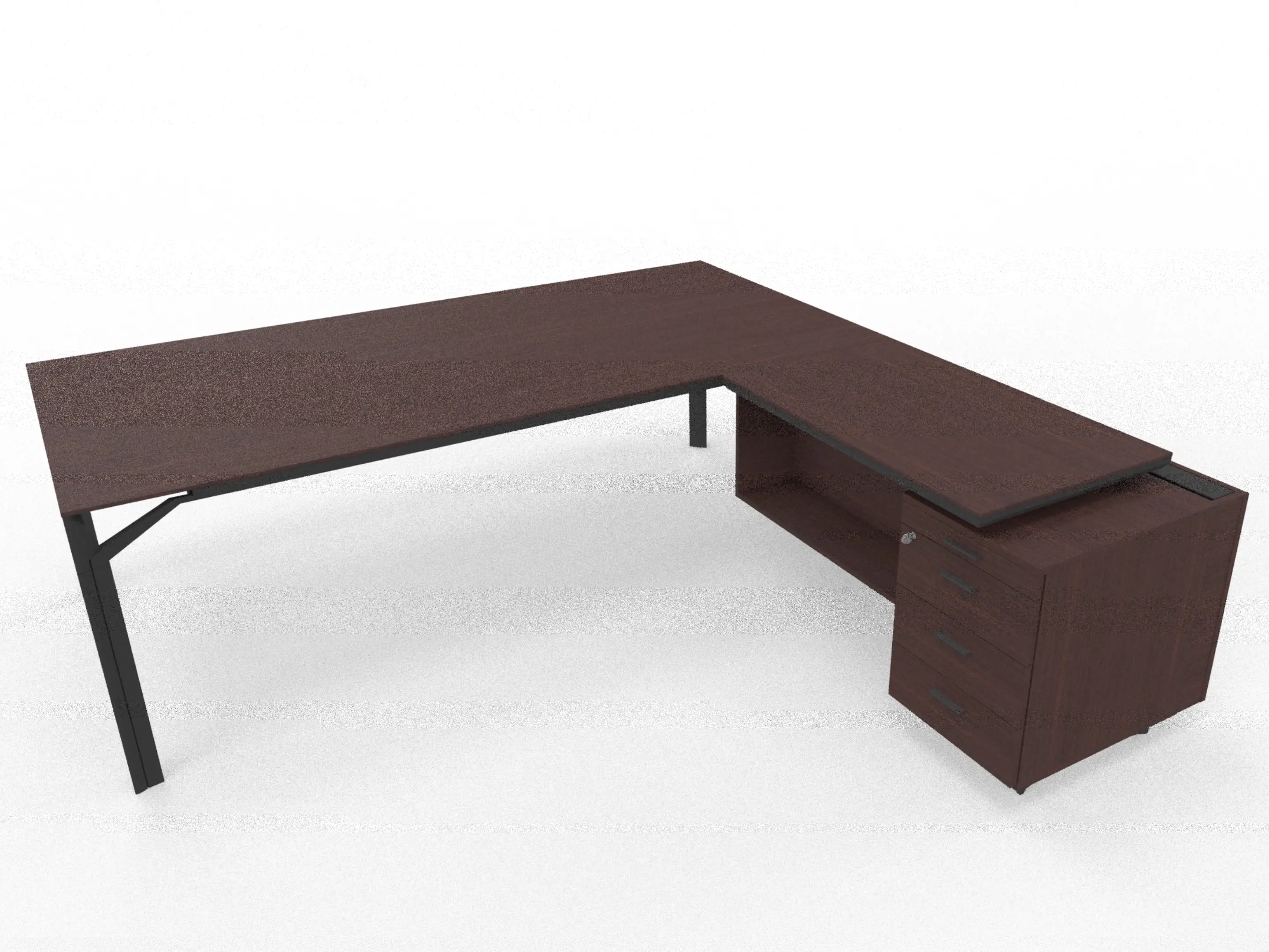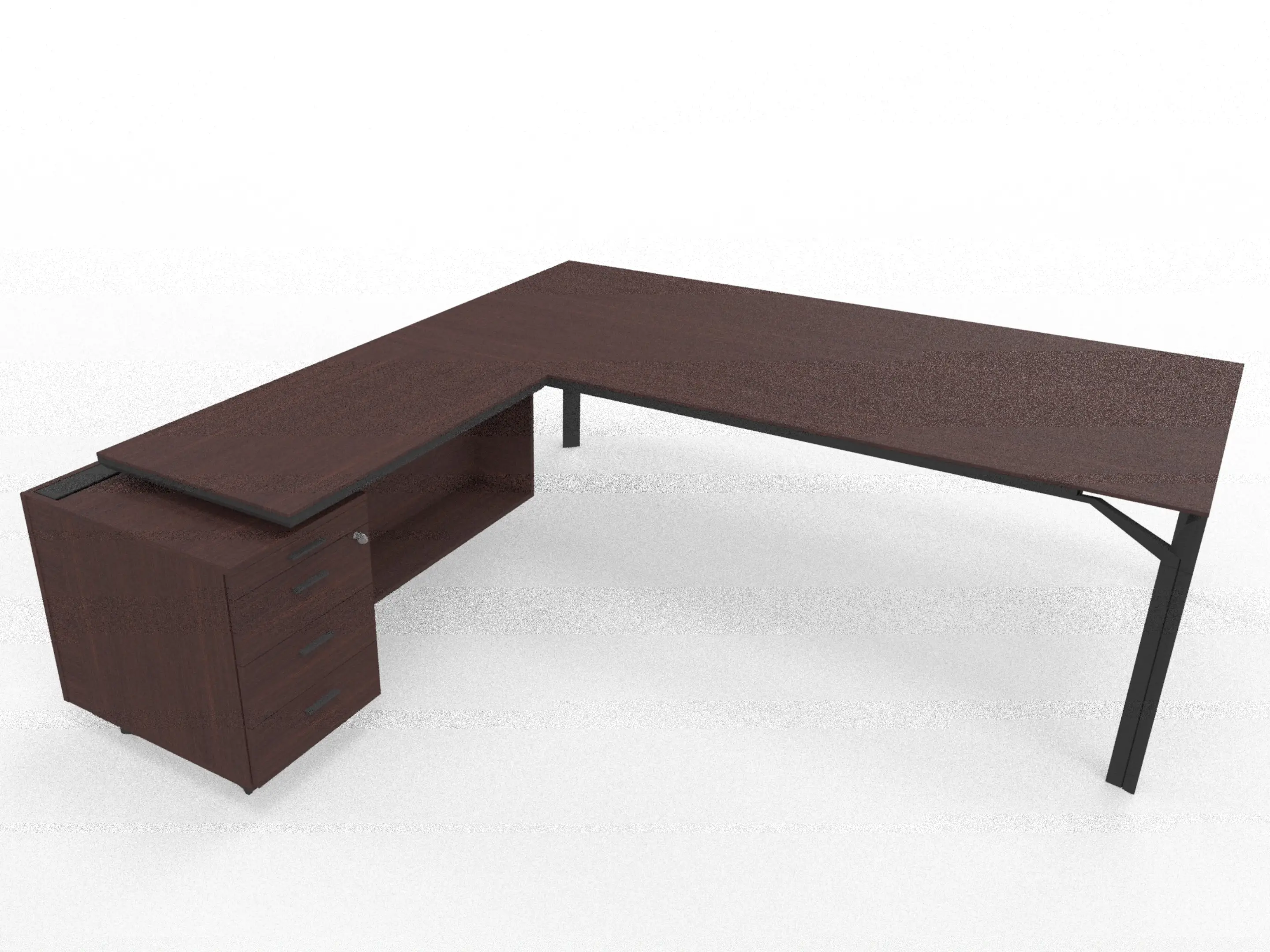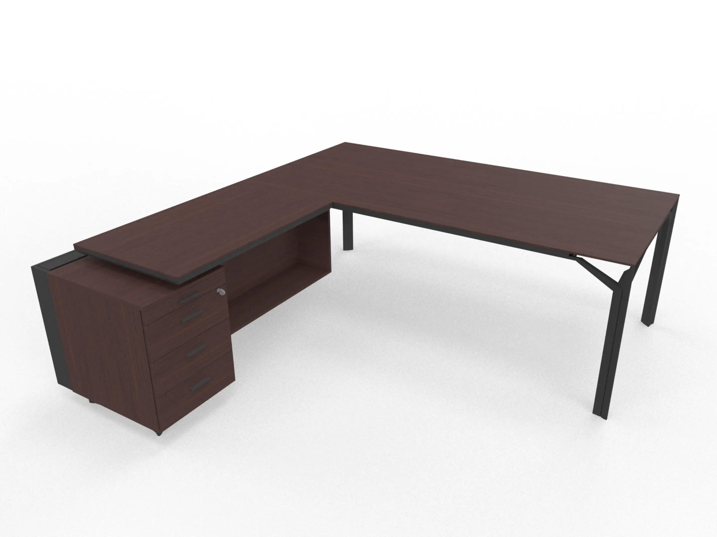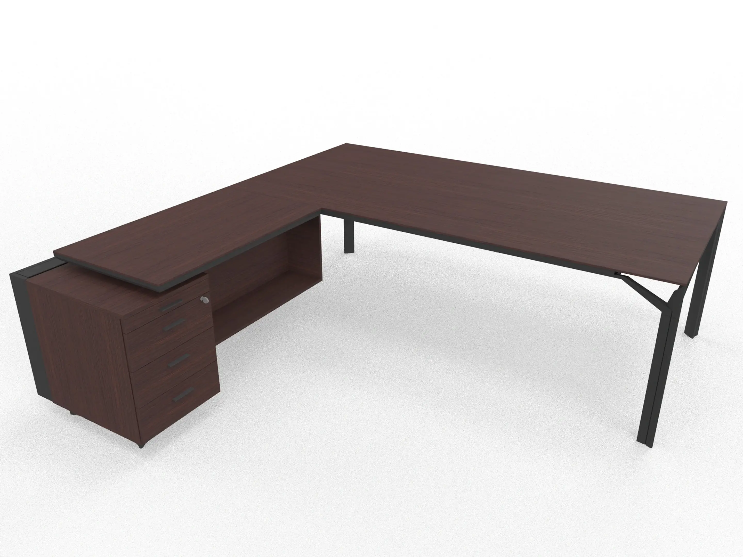 Bureau incl. aanbouw rechts, van 211x214cm (BxD) en 75cm hoog, voorzien van melamine aanbouw kast met 3+1 ladenblok en kabelklep met softclose, op een 4-poots frame met een melamine blad.