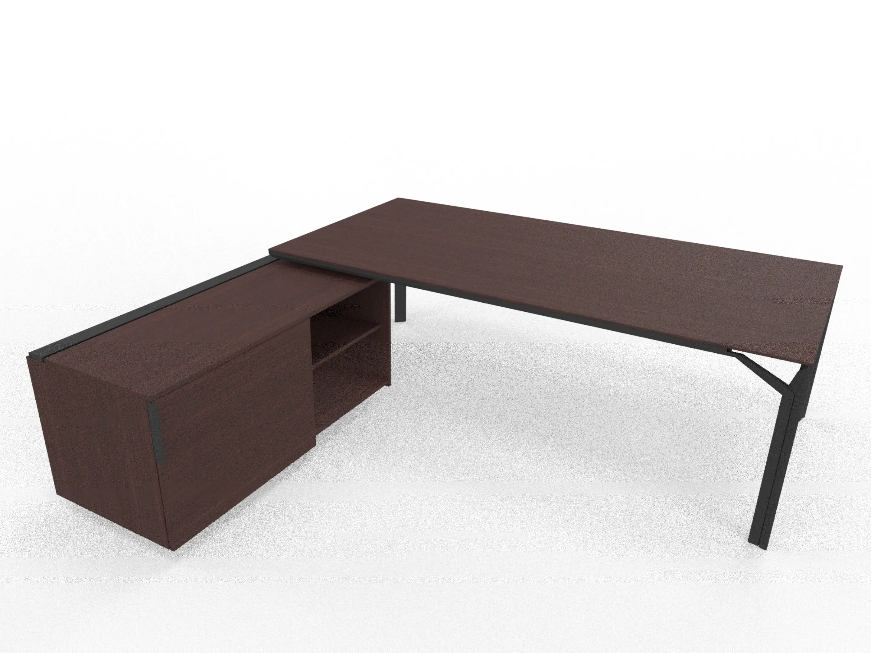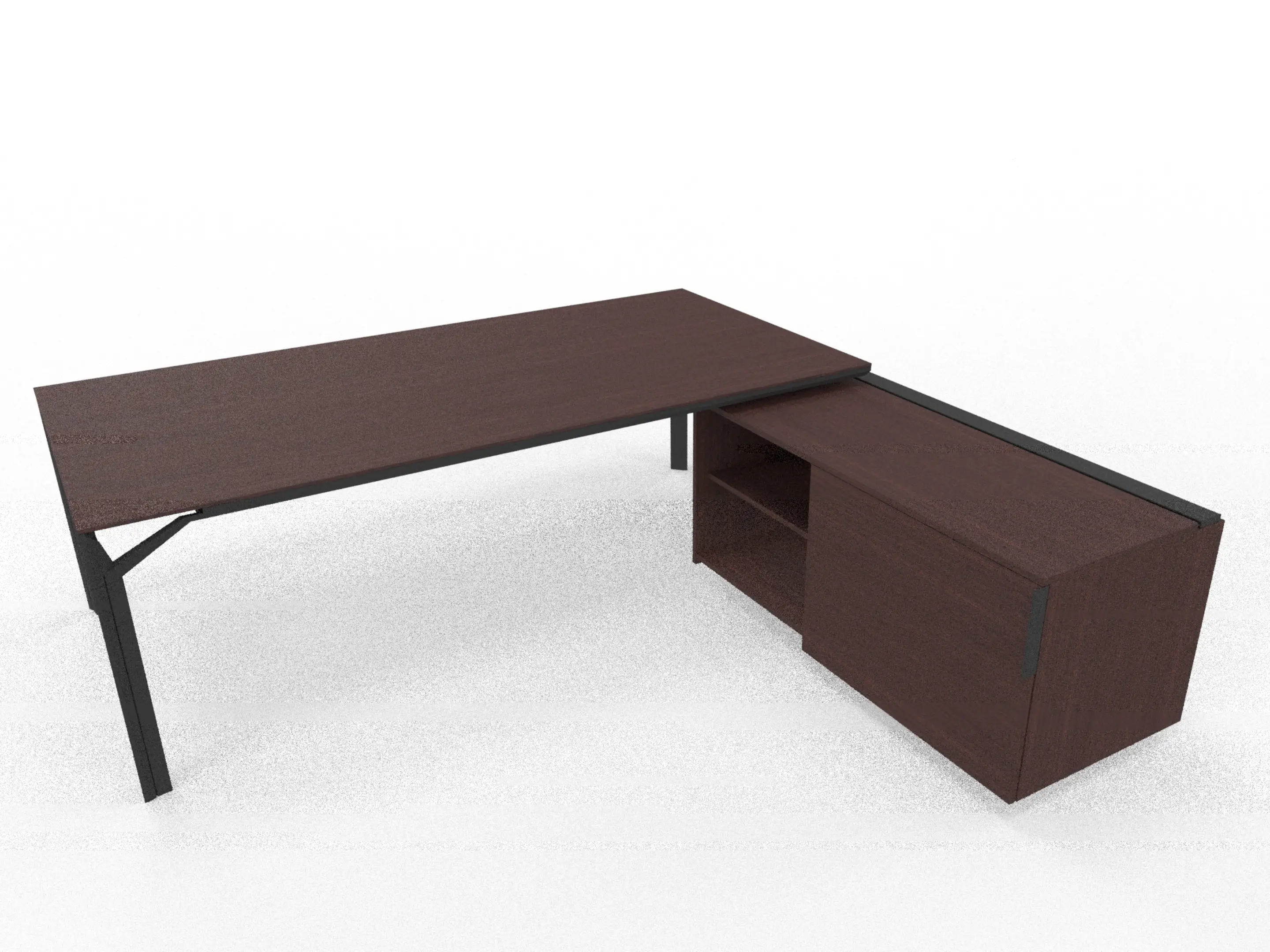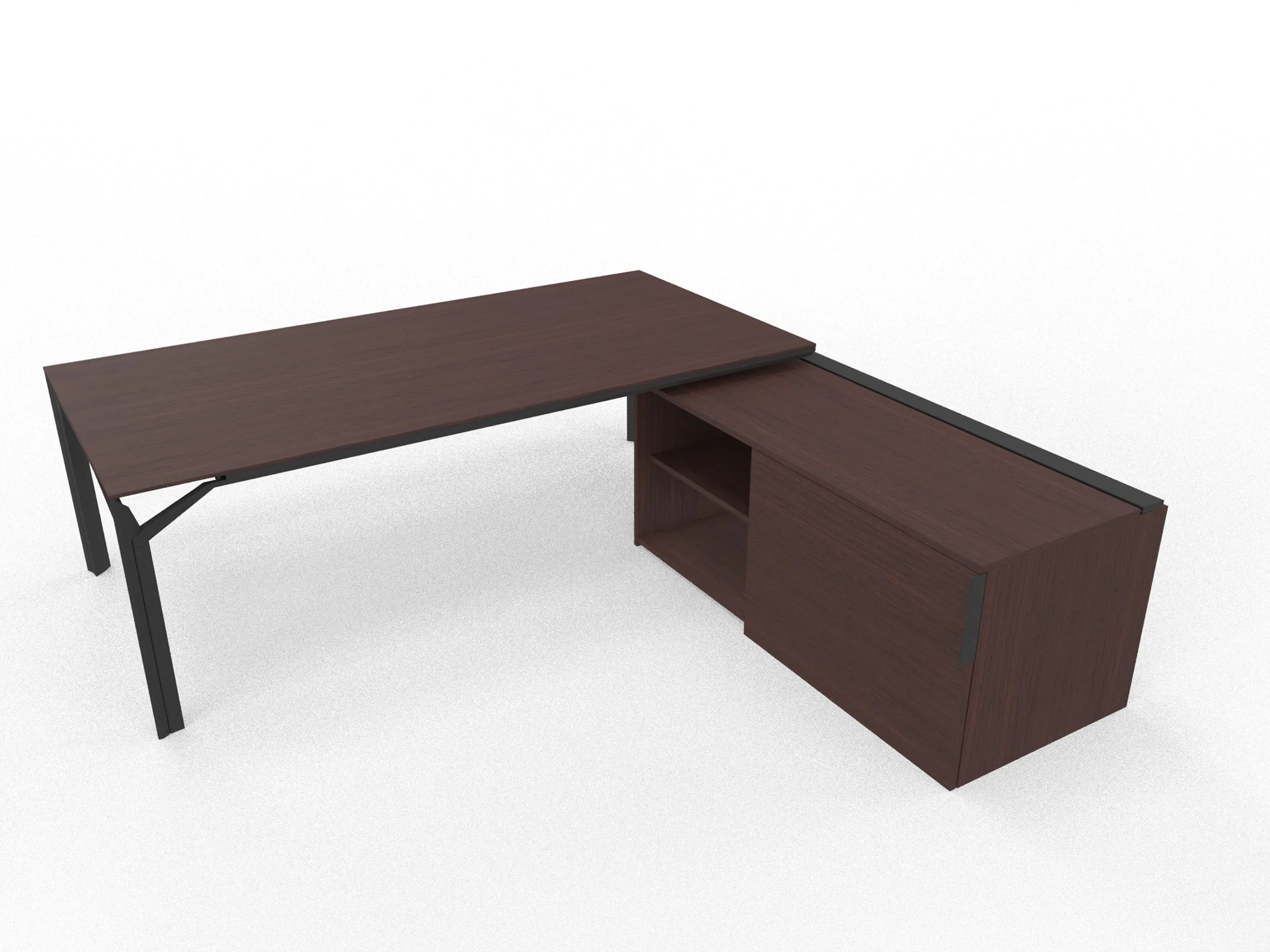 Bureau incl. aanbouw rechts, van 231x214cm (BxD) en 75cm hoog, met aanbouw kast met metalen designpaneel met 3+1 ladenblok en kabelklep met softclose, op een 4-poots frame met een melamine blad.