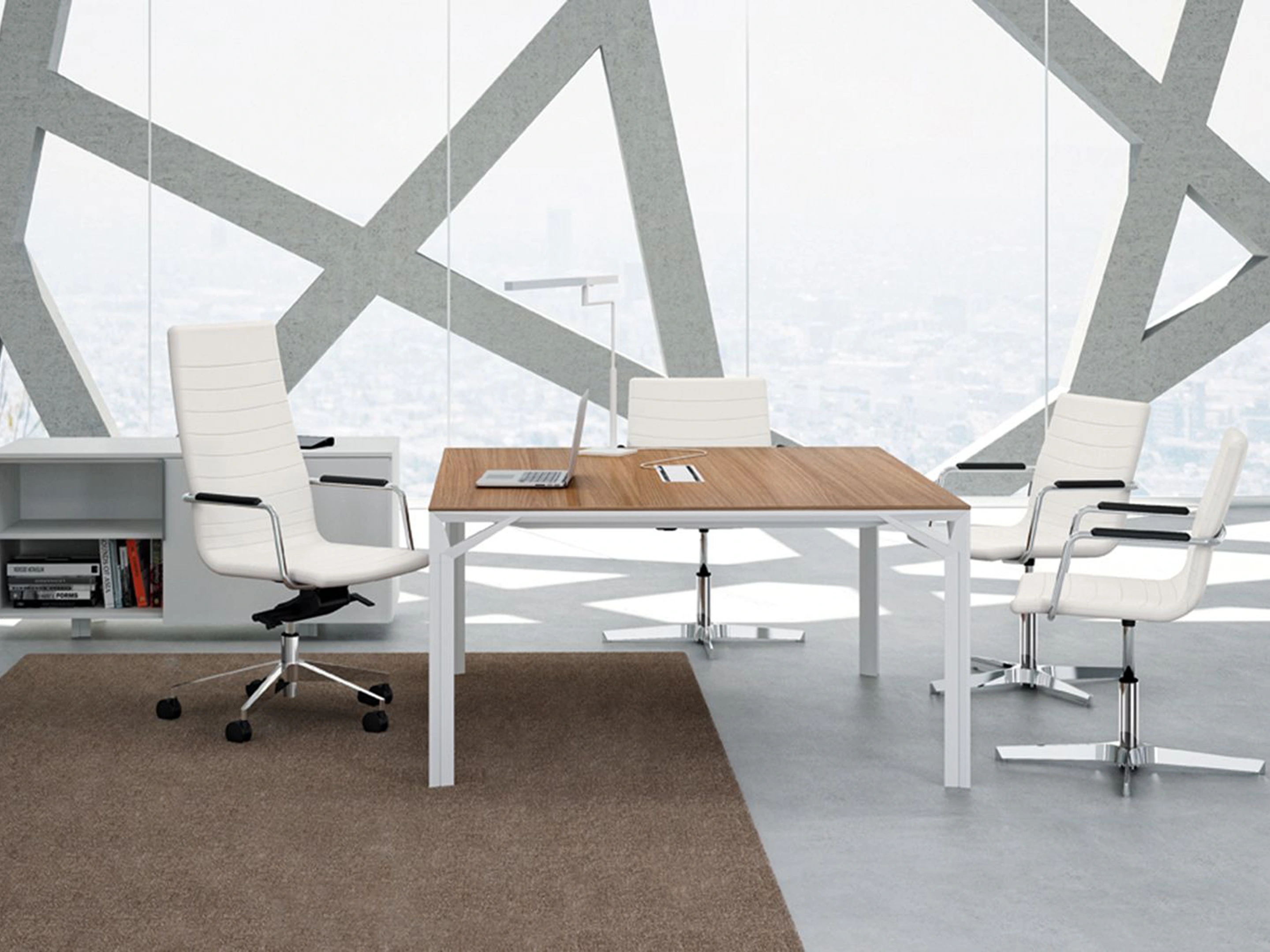 140x140cm (BxD) vergadertafel van 75cm hoog op een witte 4-poots frame met 1melamine tafelblad voorzien van kabelklep in het midden van het blad.