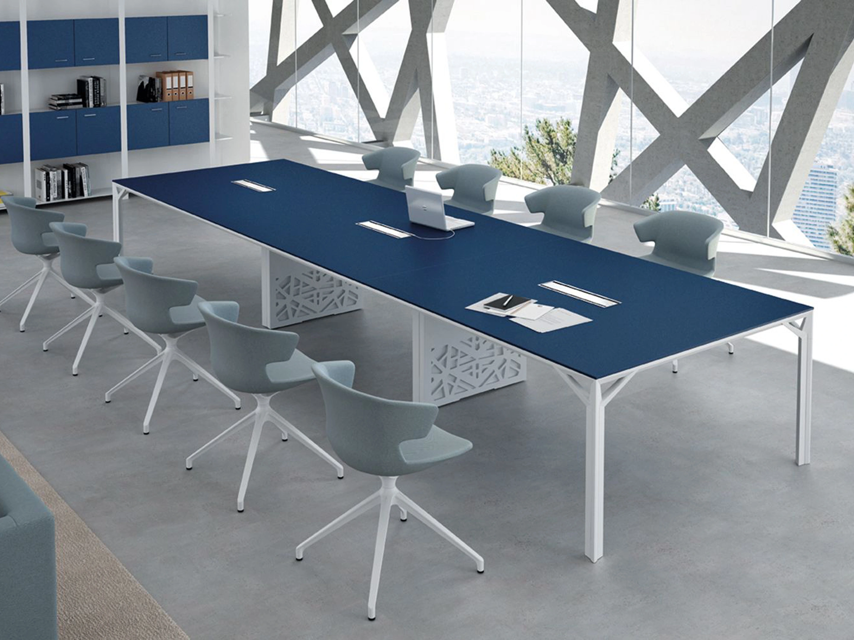 420x140cm (BxD) vergadertafel van 75cm hoog op een witte 8-poots frame met 3 melamine tafelbladen van 140x140cm (BxD) voorzien van 3 kabelkleppen, een in het midden van elk blad.