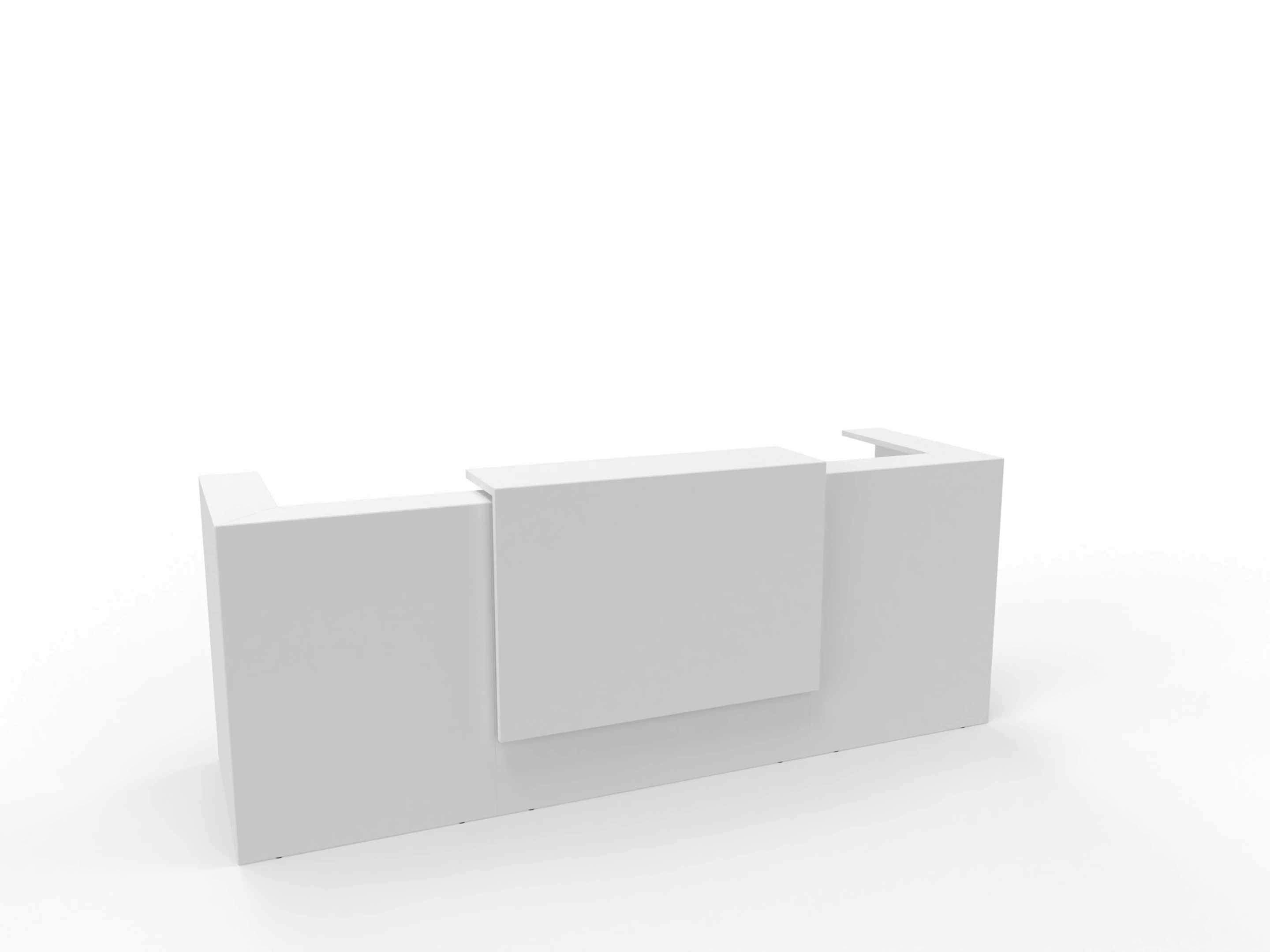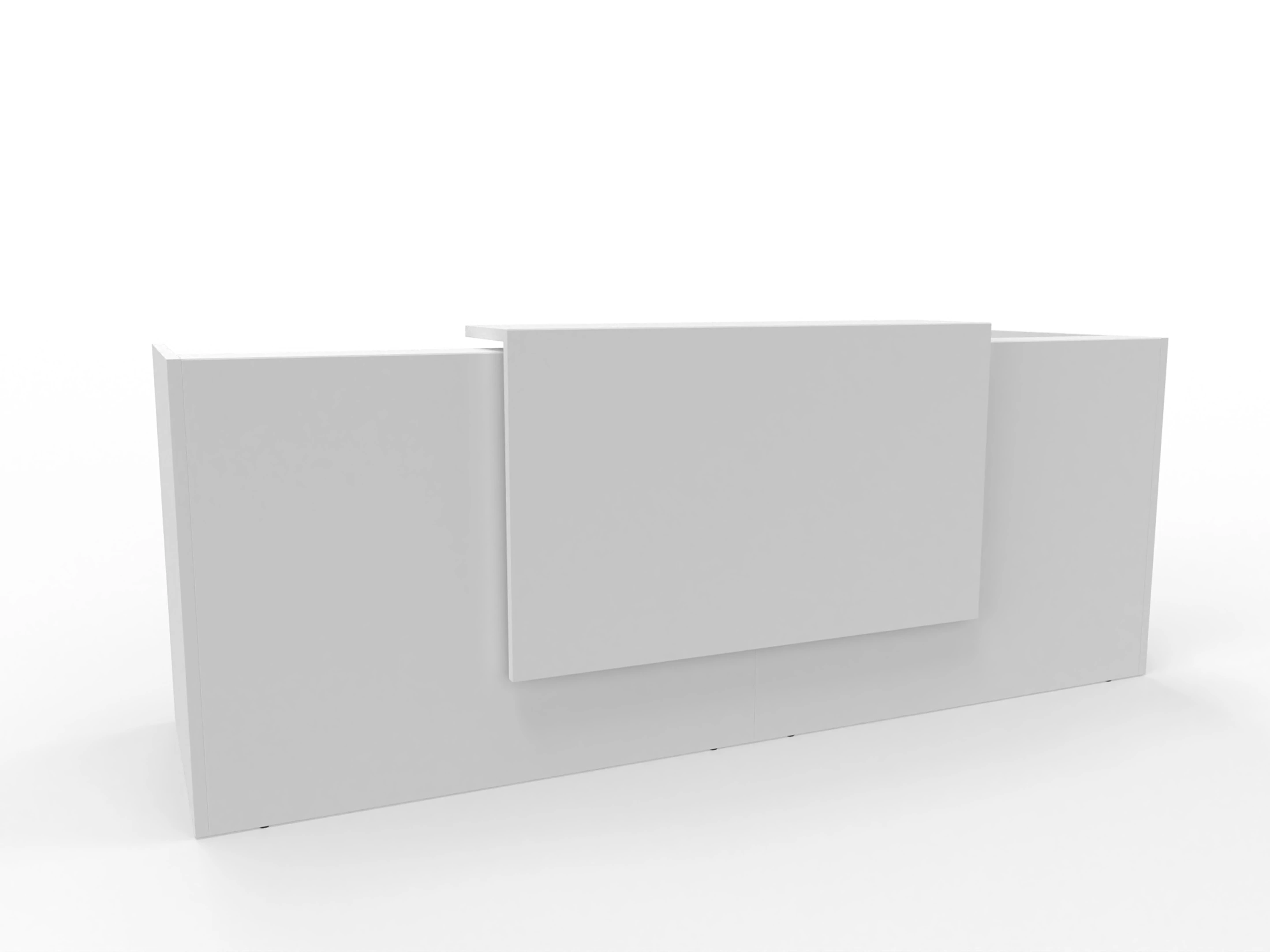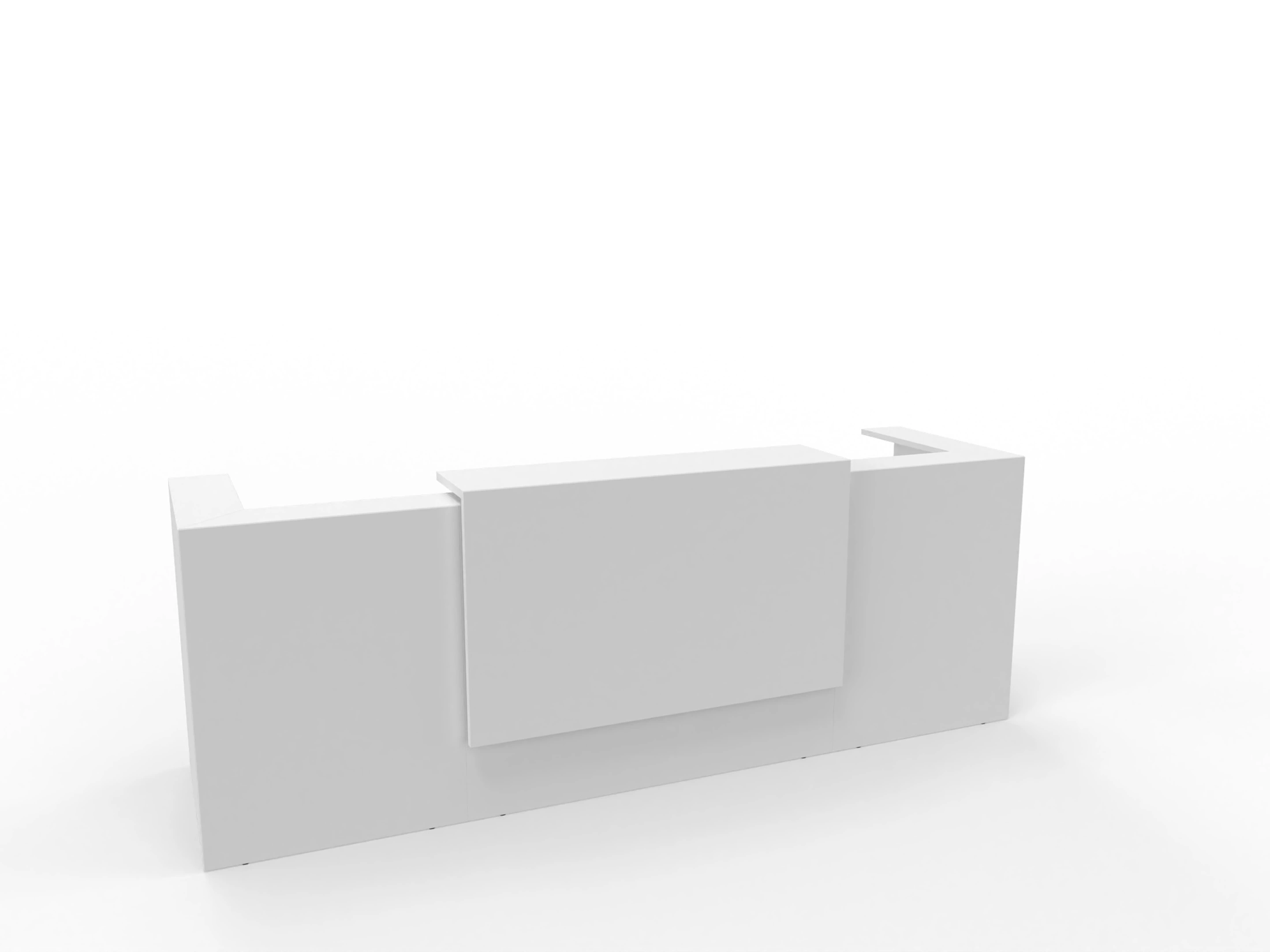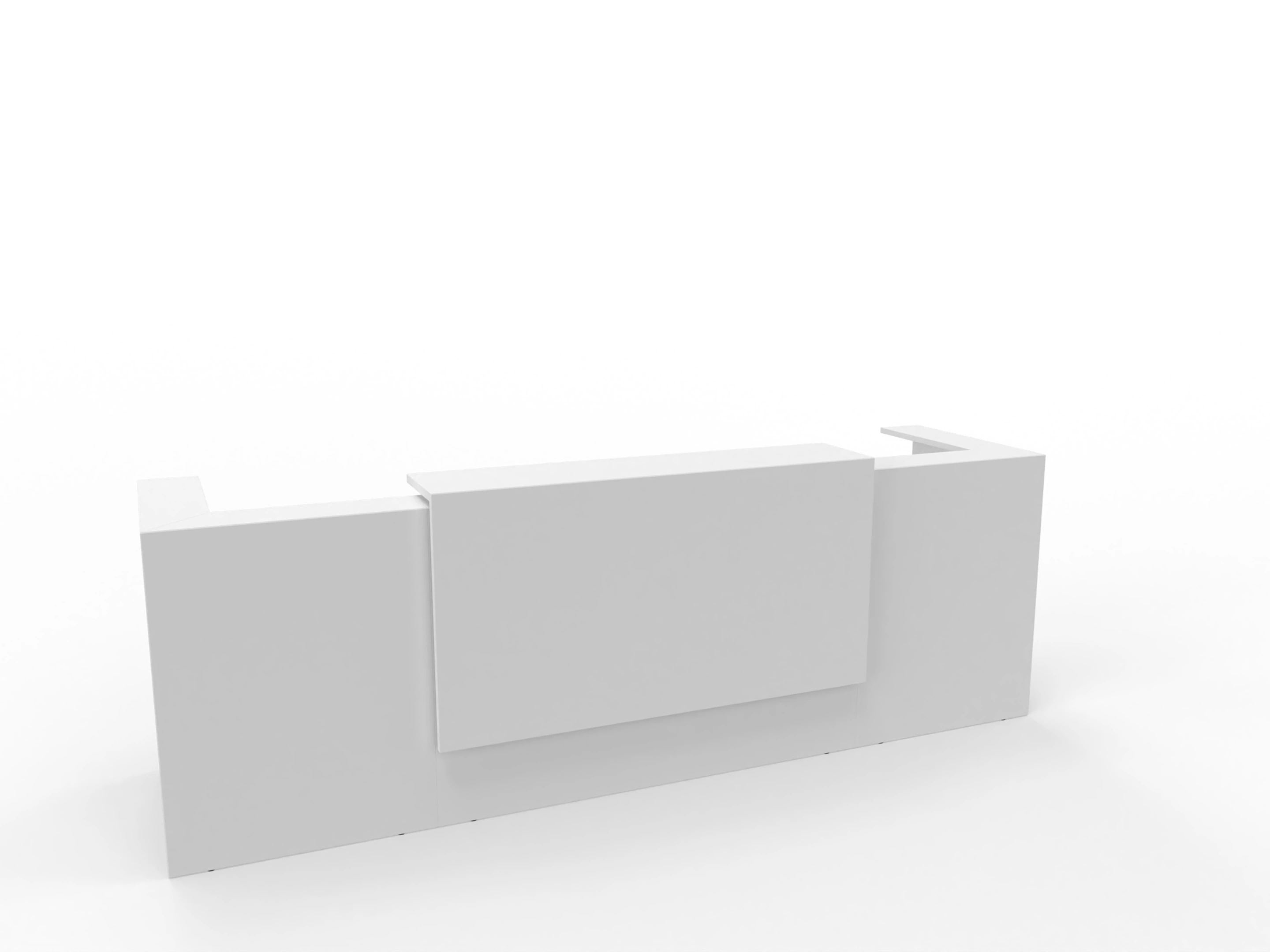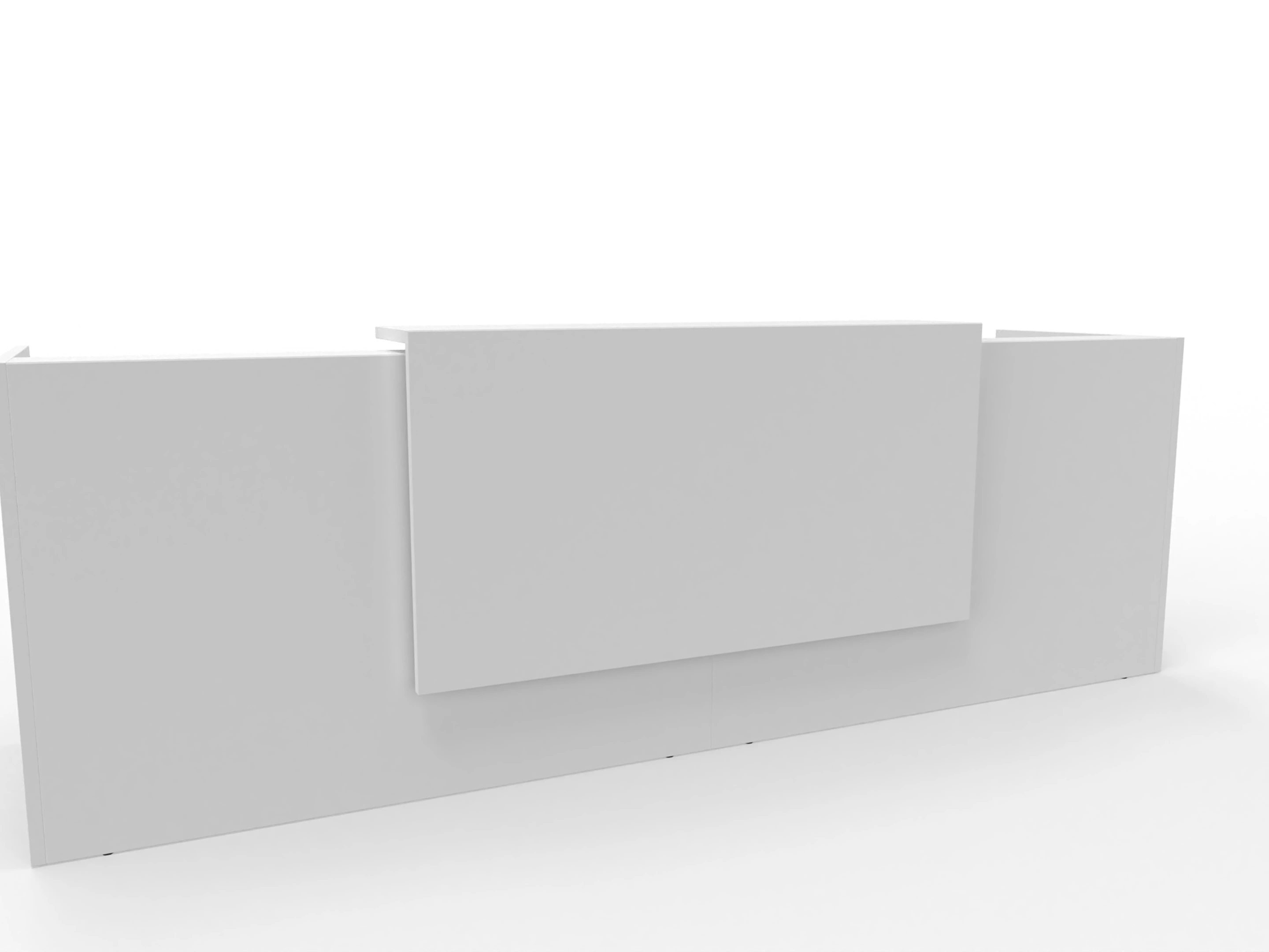 Een 3-delige balie van 285x88x113cm (BxDxH) met overhangende zijpanelen en een melamine opzetelement.
