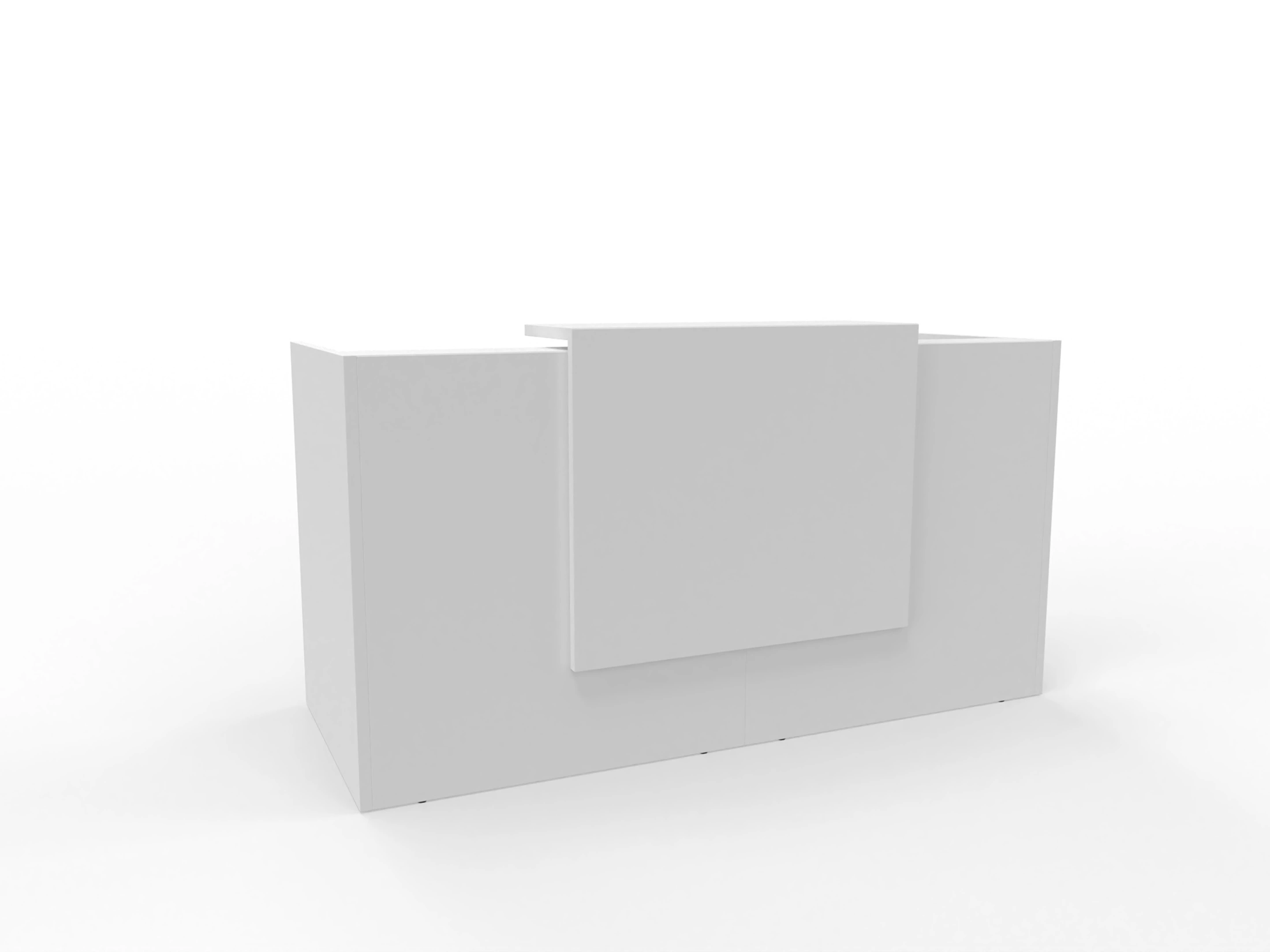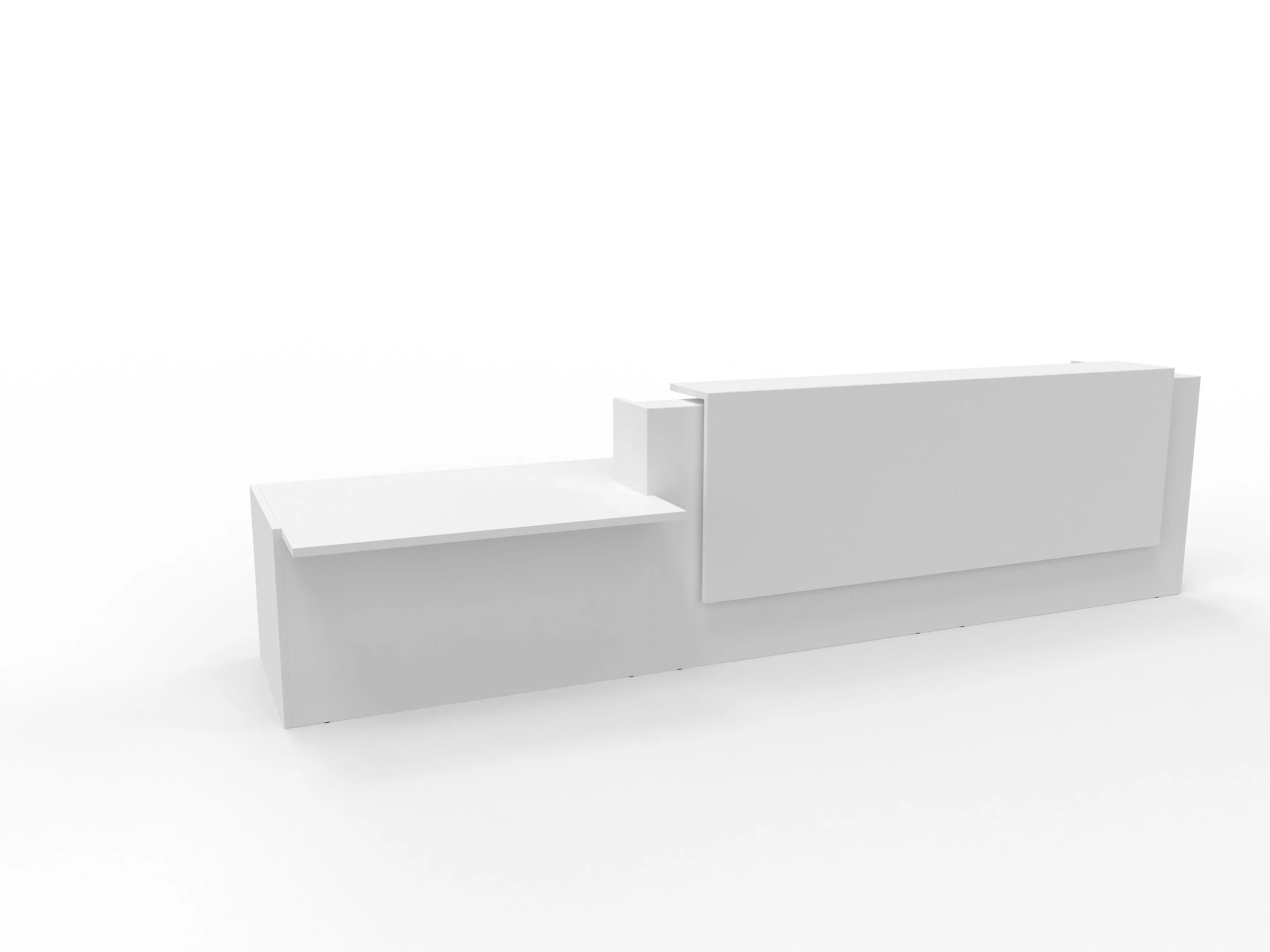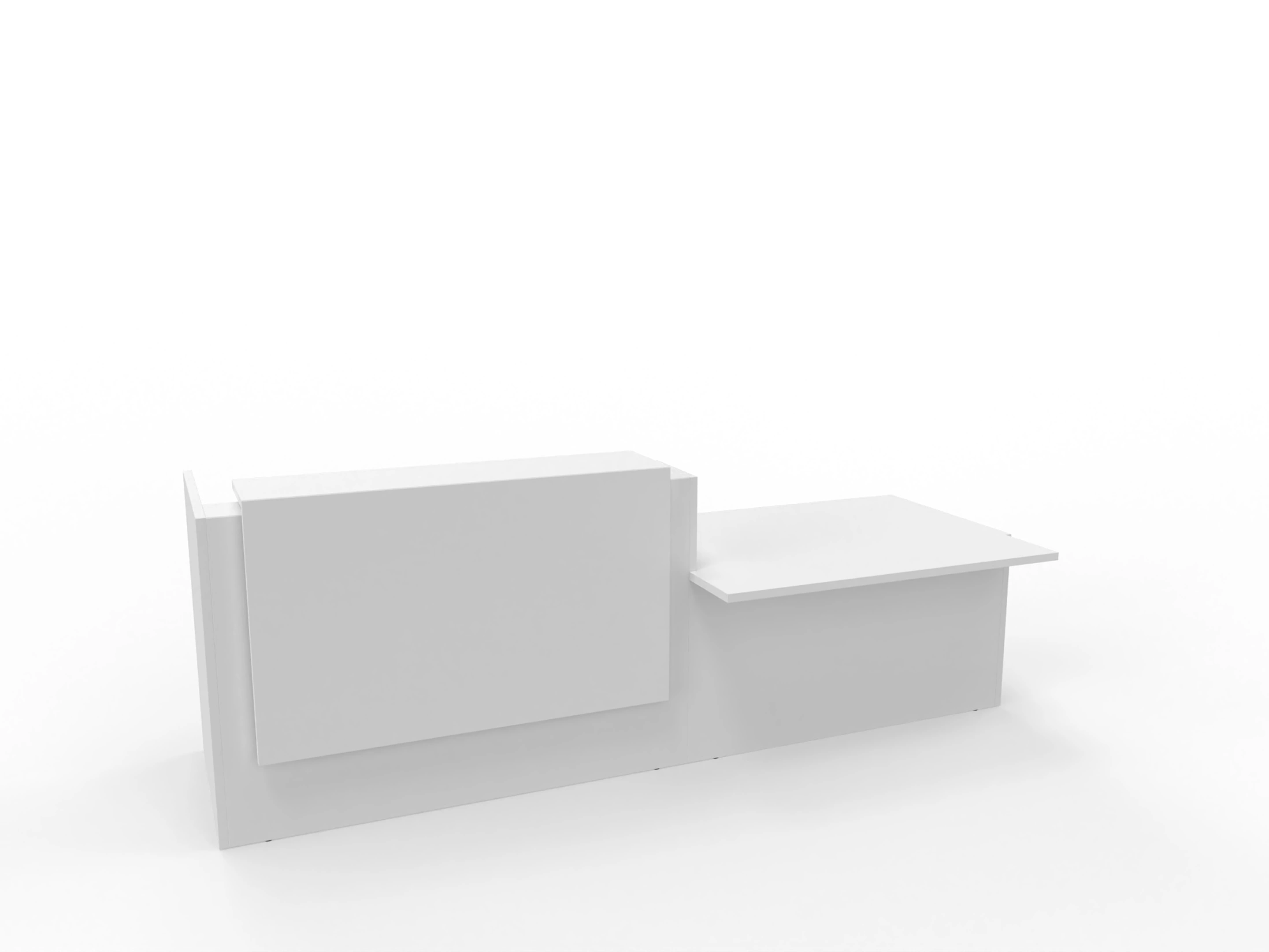 Een 2-delige 1-persoons balie met een lage counter aan de rechter kant, van 306x112,5x113cm (BxDxH) met rechte zijpanelen en 1x melamine opzetelement.