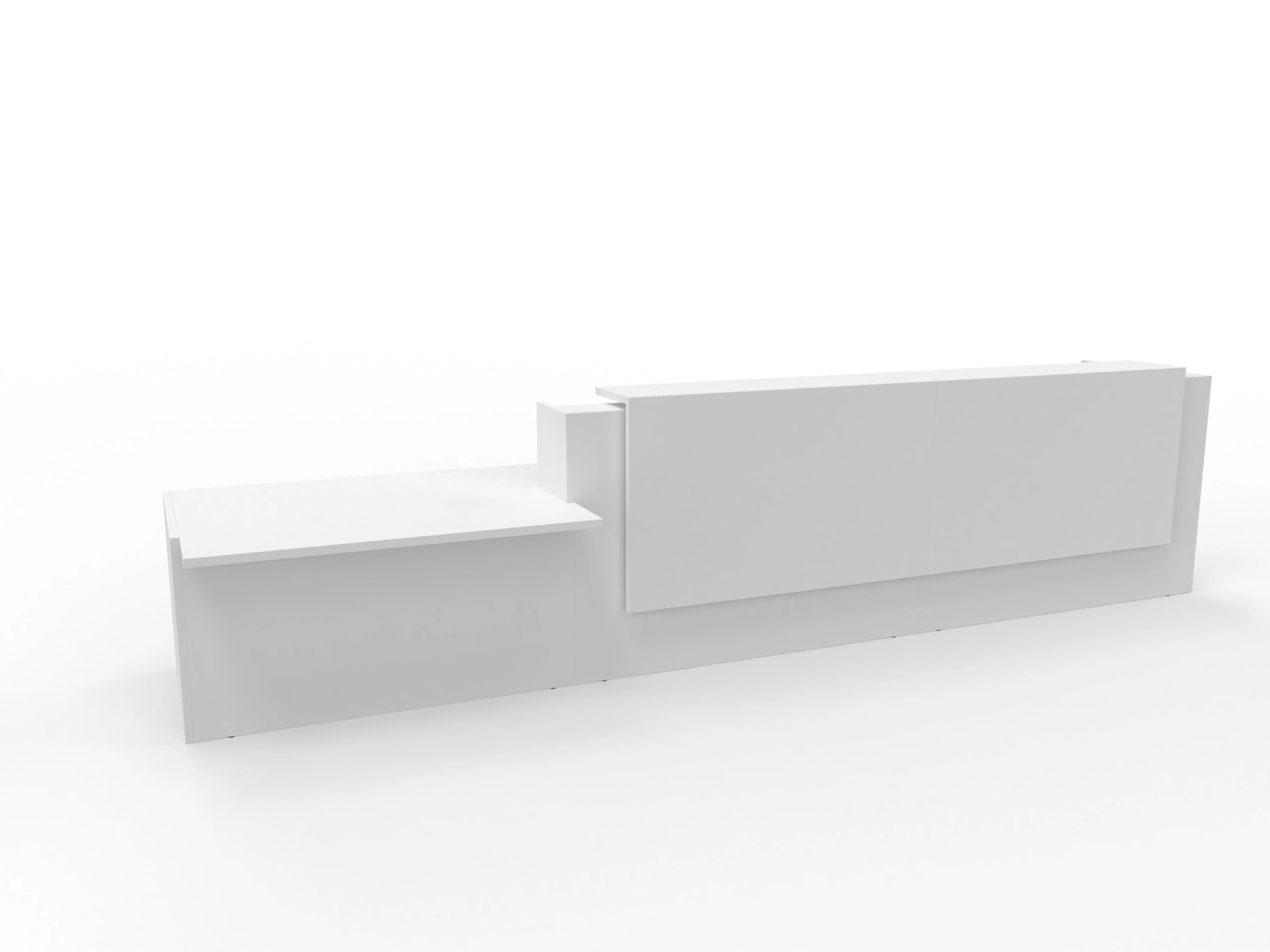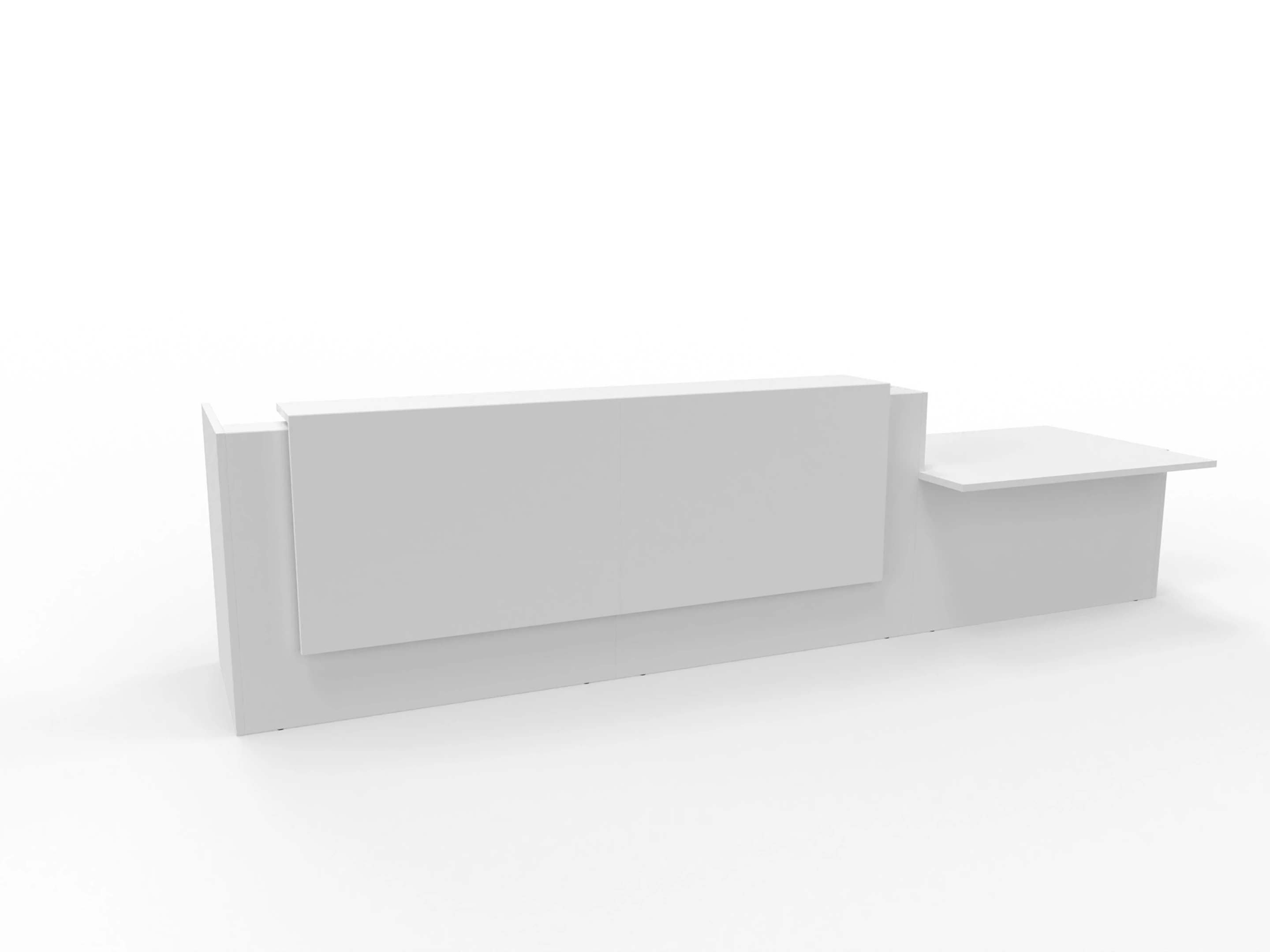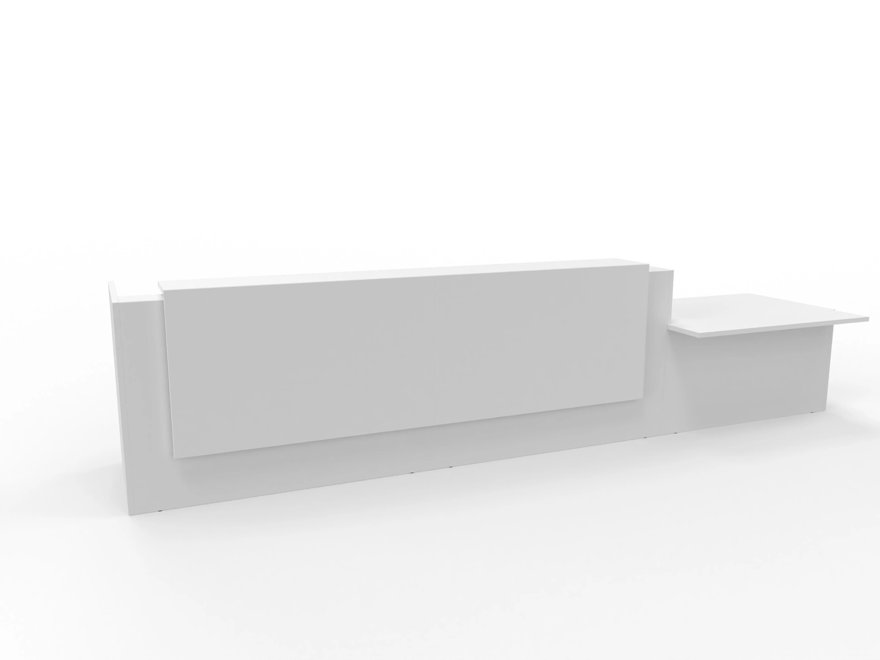 Een 3-delige 2 persoons balie met een lage counter aan het linker kant, van 426x112,5x113cm (BxDxH) met rechte zijpanelen en 3x melamine opzetelement.