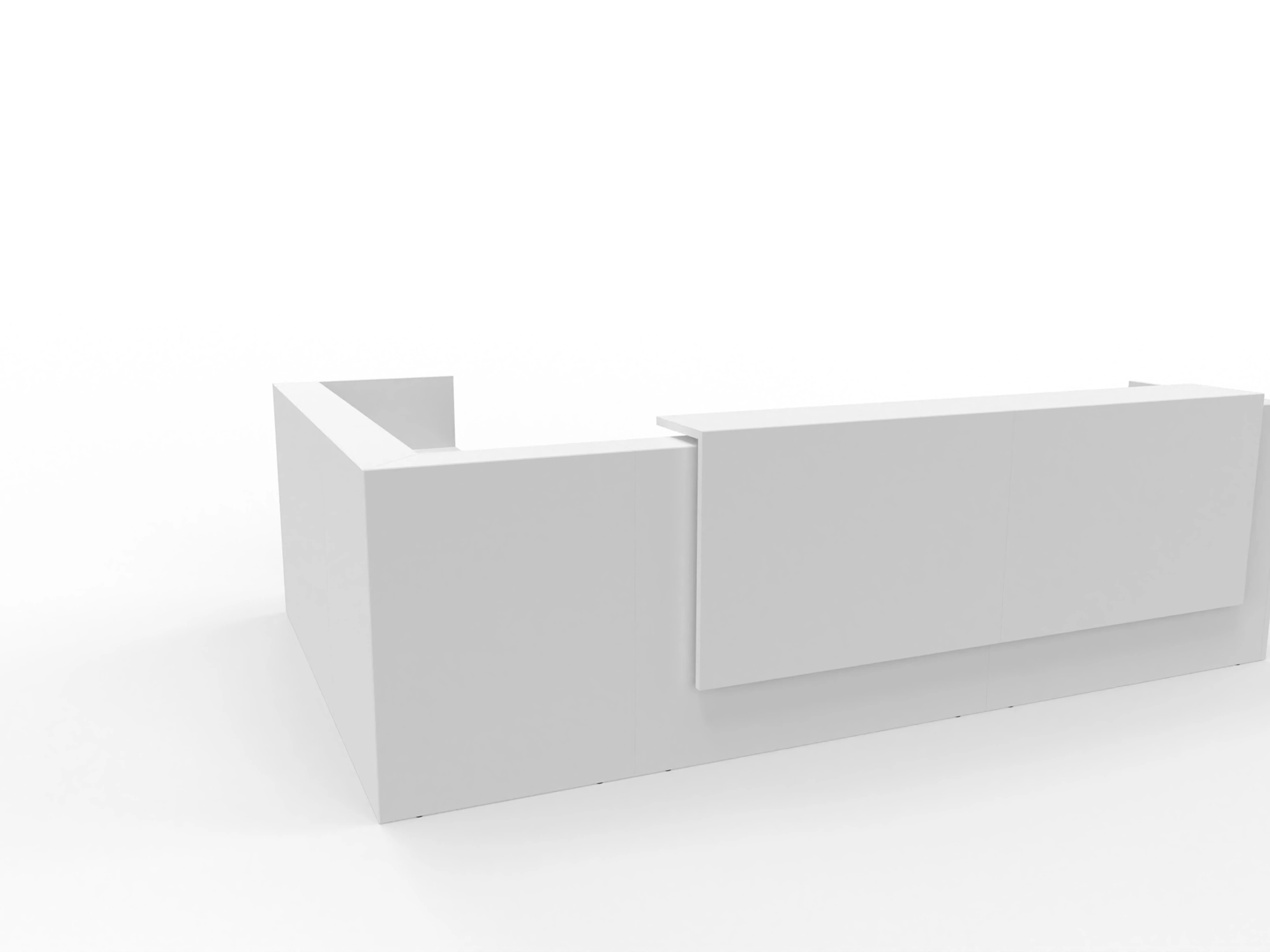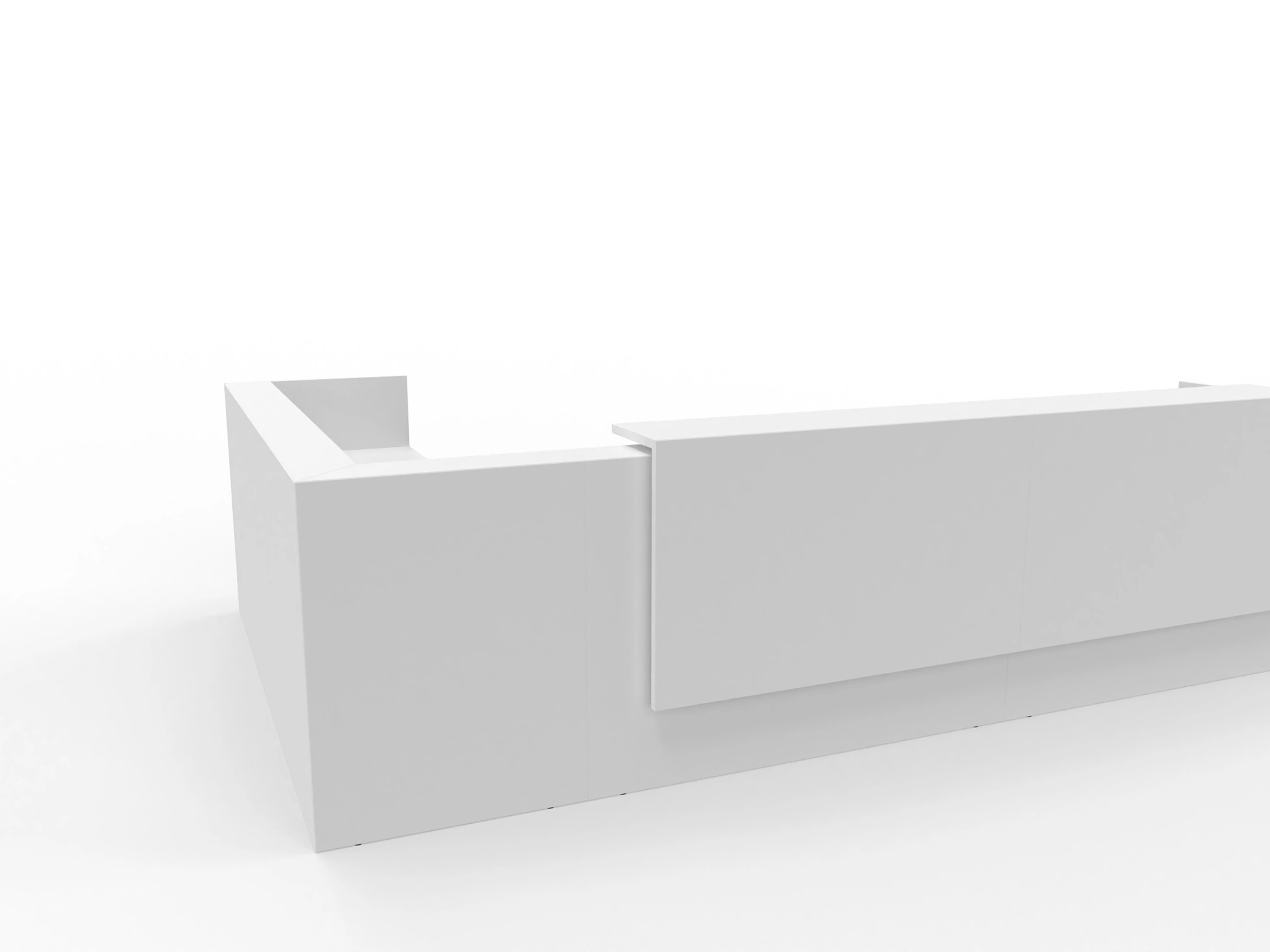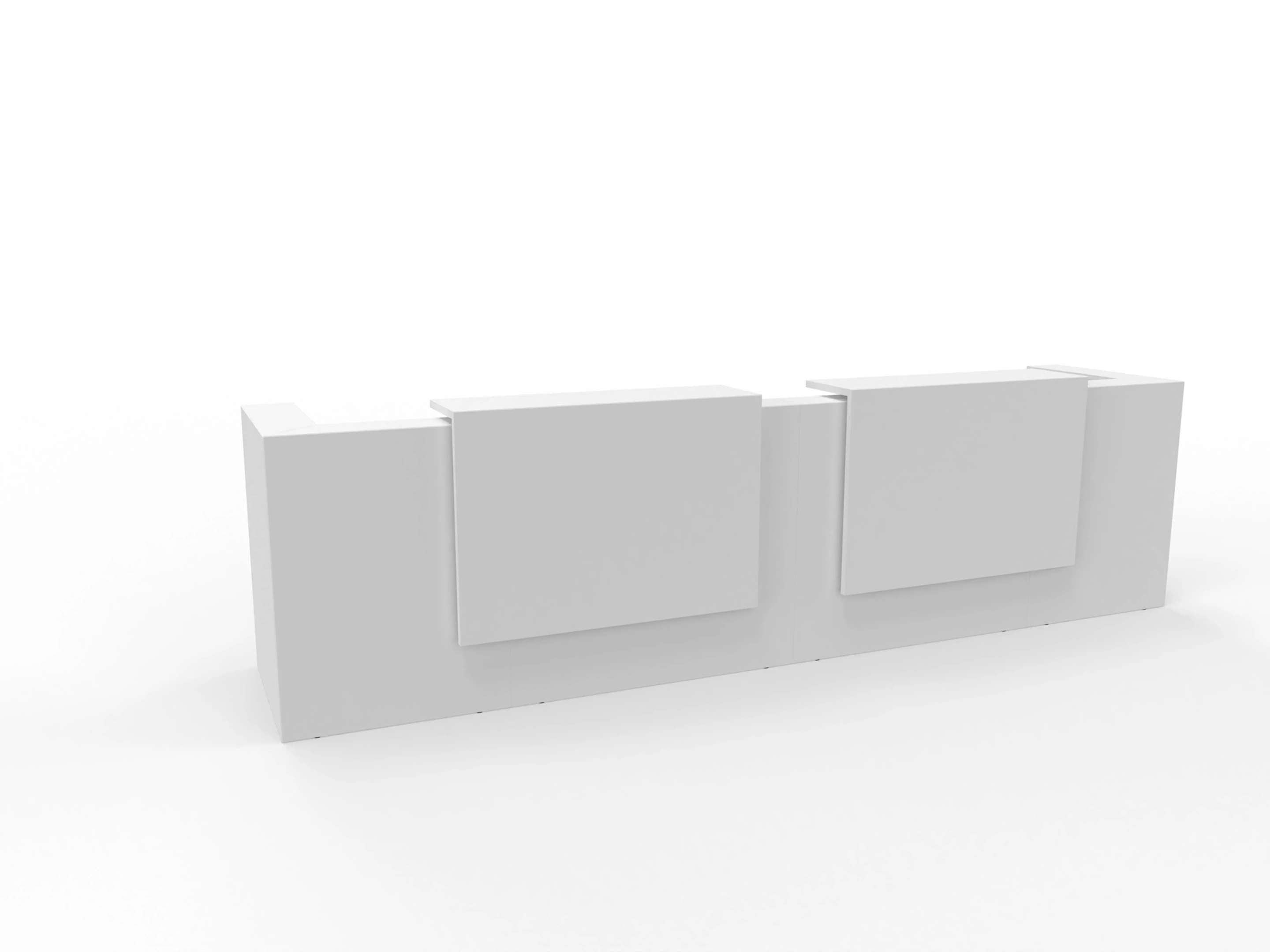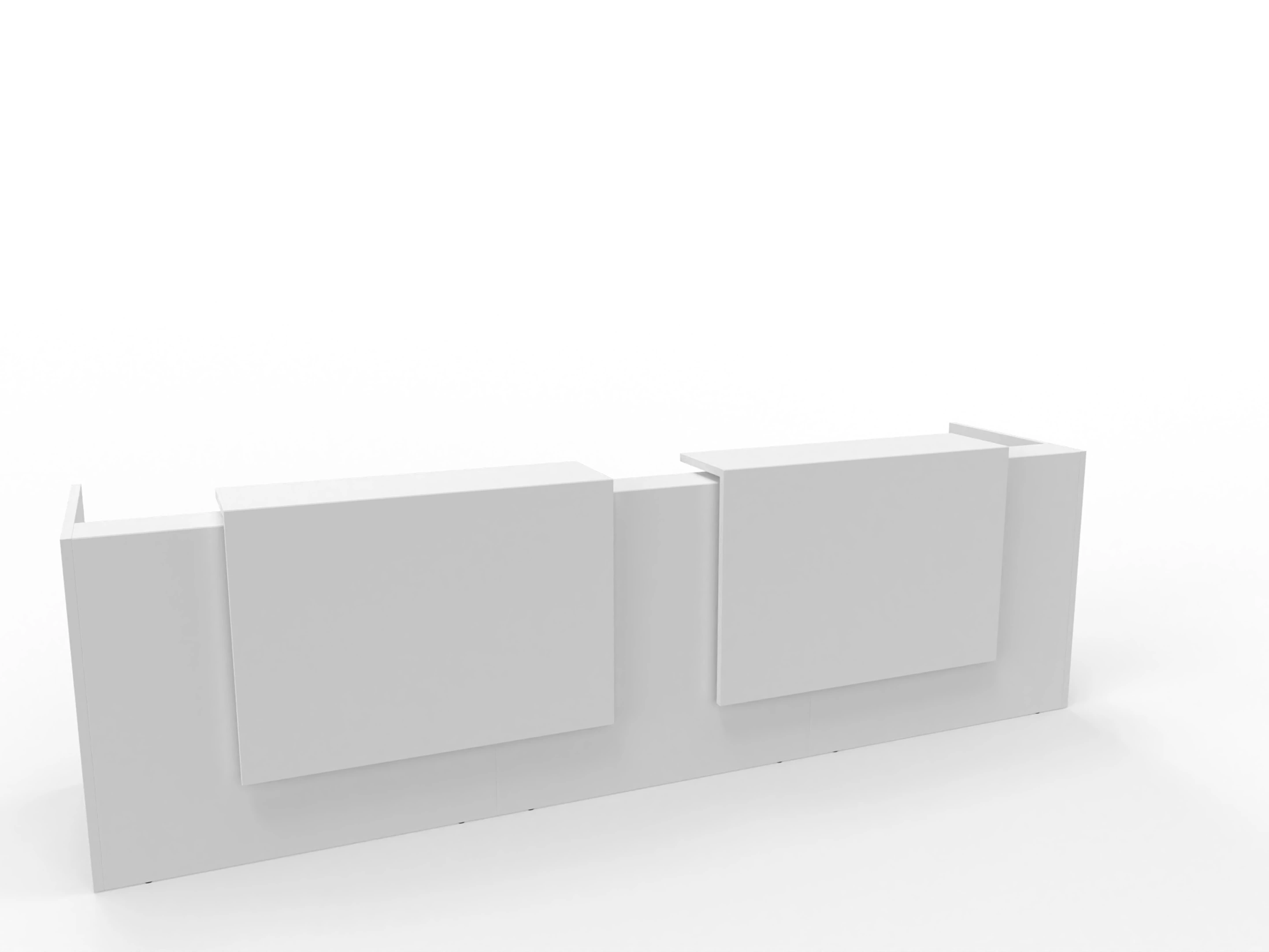 Een 3-delige 2 persoons balie met een lage counter aan het linker kant, van 426x112,5x113cm (BxDxH) met rechte zijpanelen en 3x melamine opzetelement.