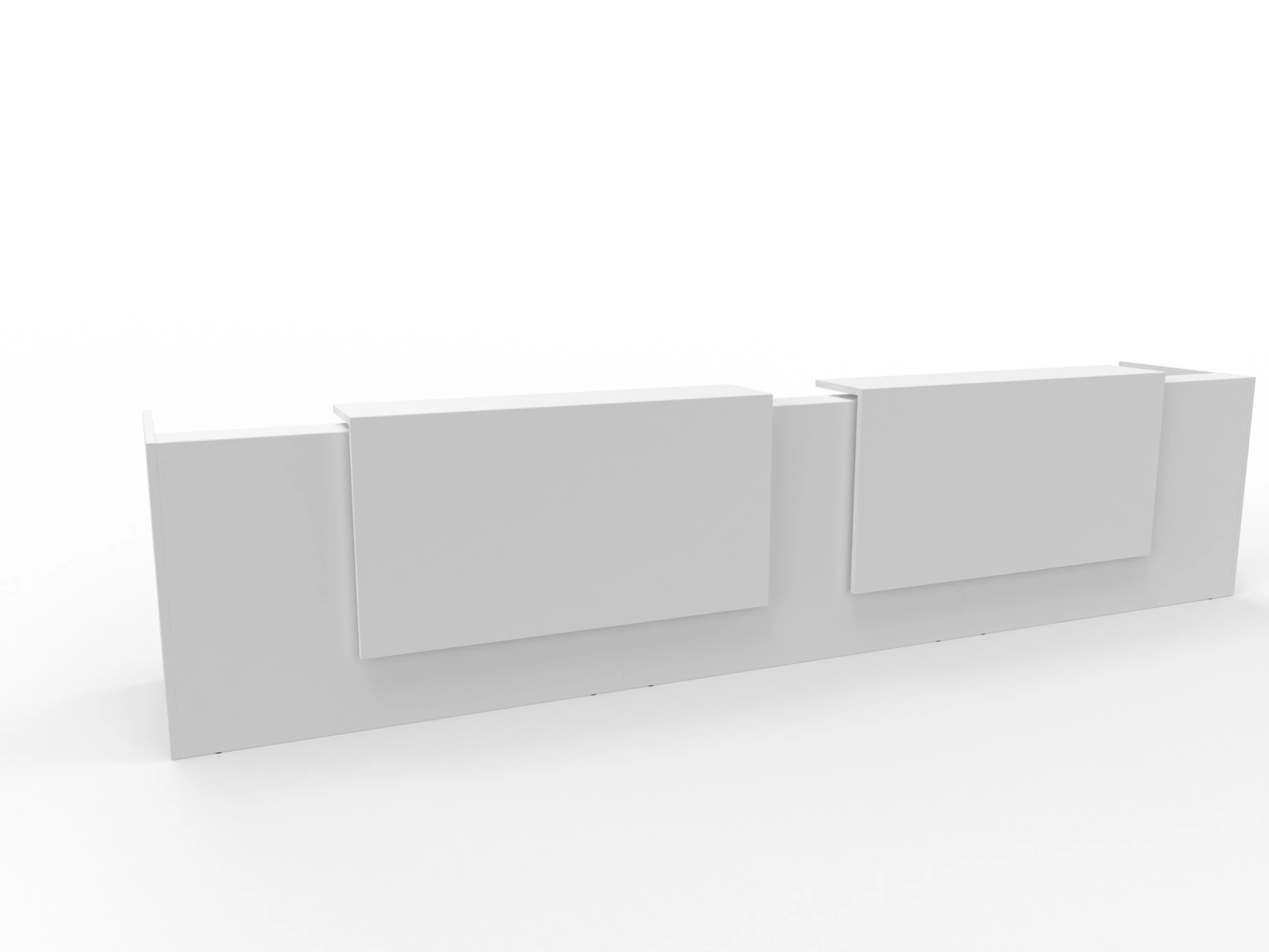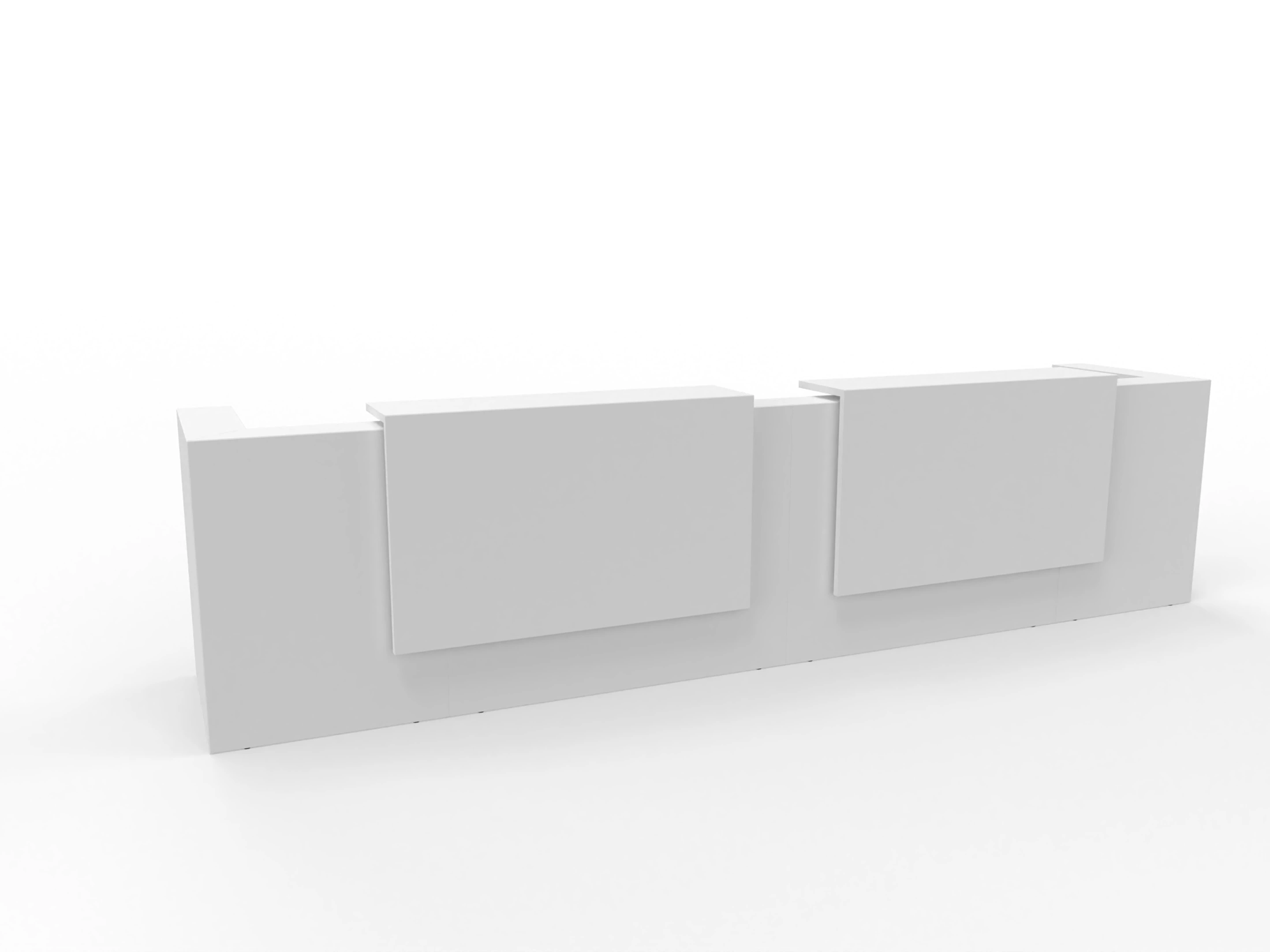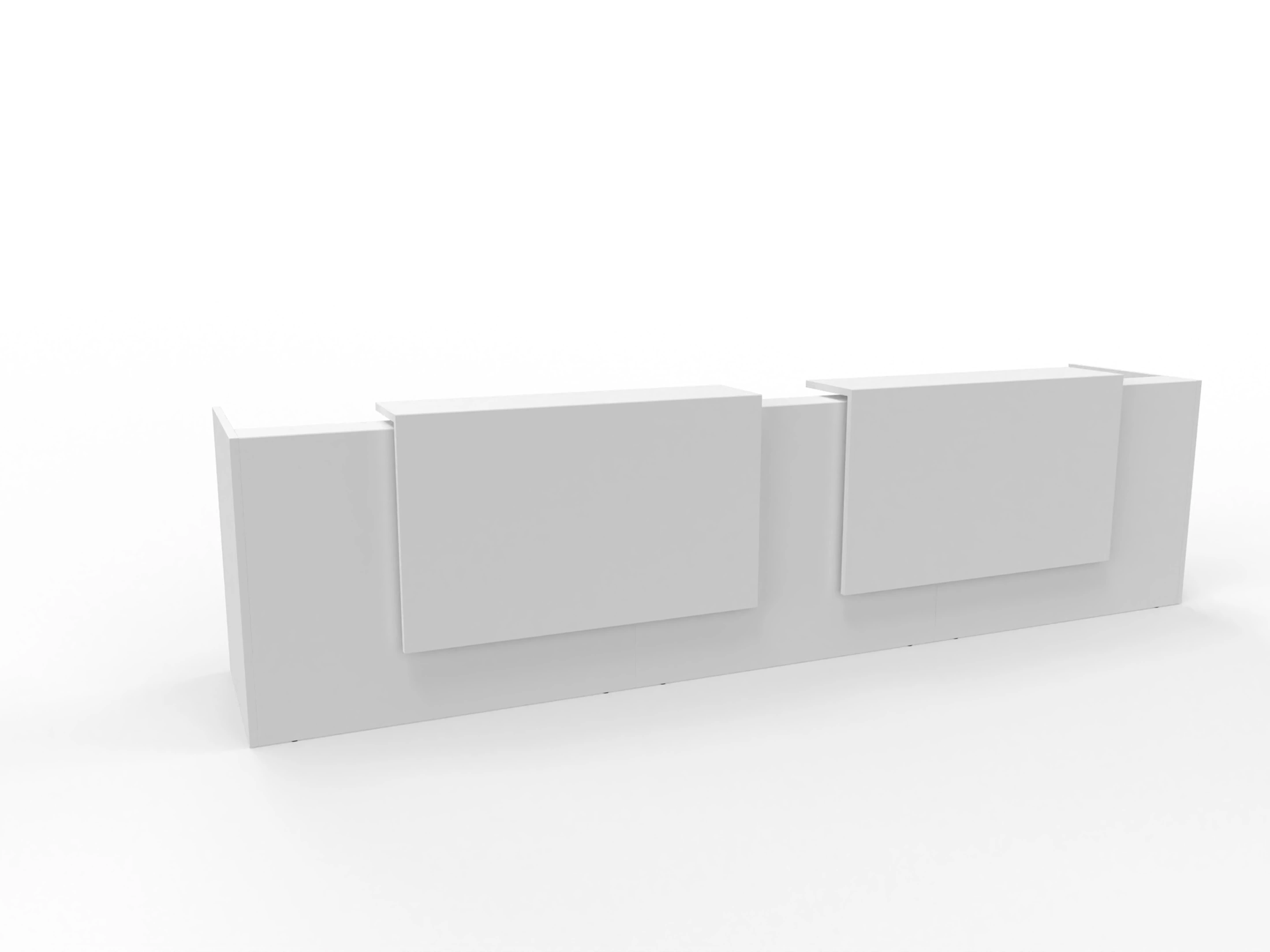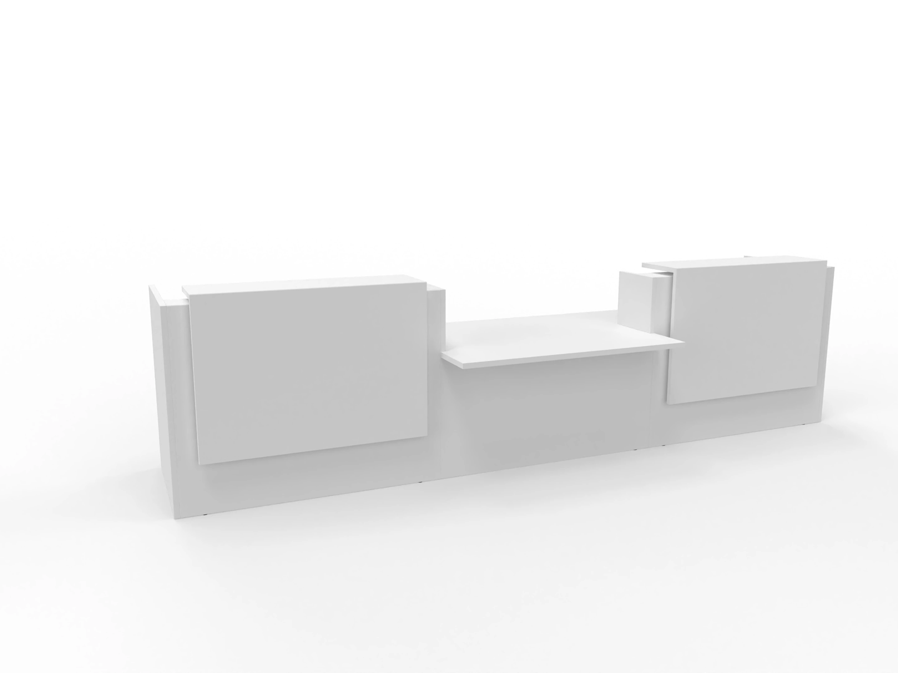 Een 3-delige 2 persoons balie met een lage counter aan de rechter kant, van 426x112,5x113cm (BxDxH) met rechte zijpanelen en 3x melamine opzetelement.