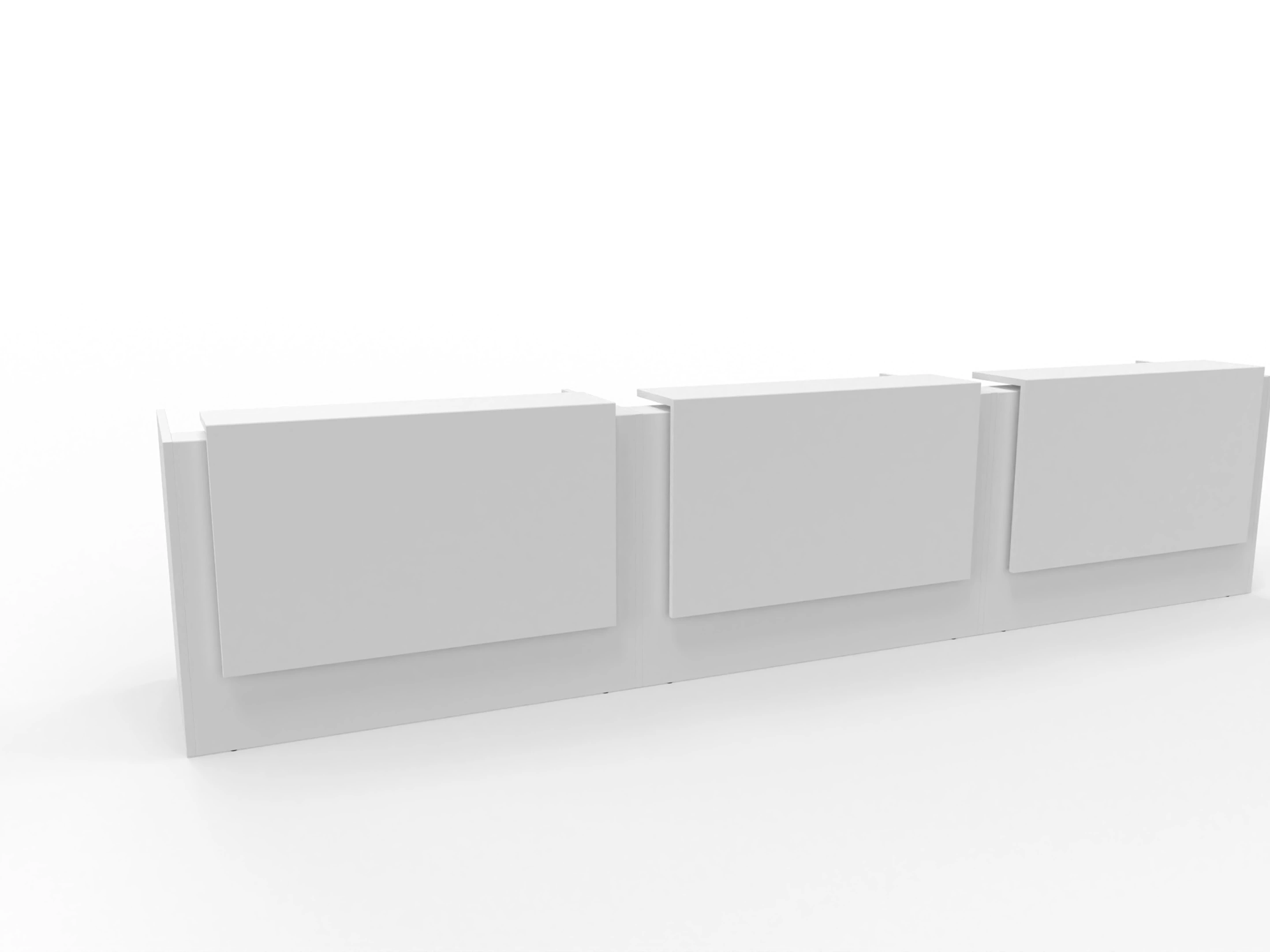 Een 3-delige balie van 366x88x113cm (BxDxH) met rechte zijpanelen en 2x melamine opzetelement.