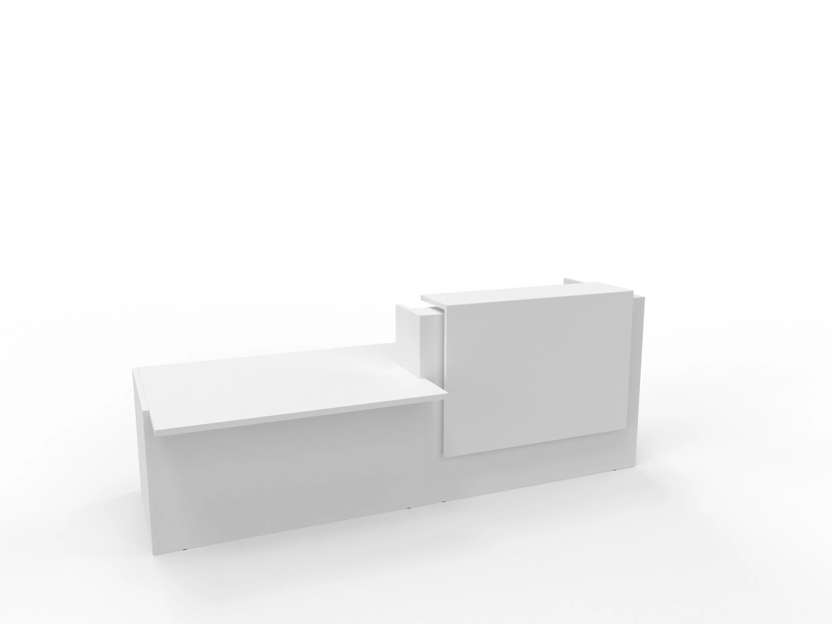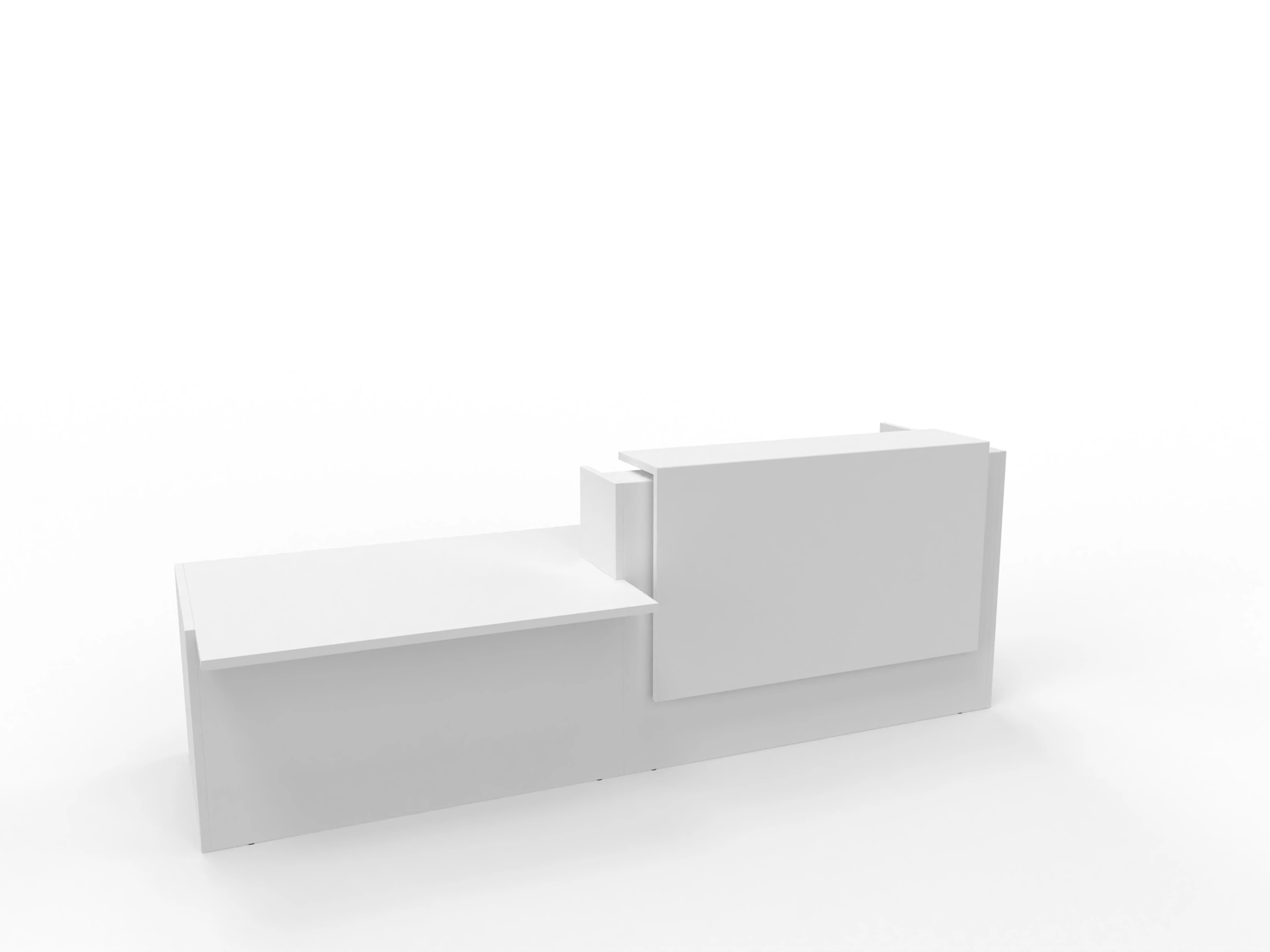 Een 2-delige 1-persoons balie met een lage counter aan de rechter kant, van 286x112,5x113cm (BxDxH) met rechte zijpanelen en 1x melamine opzetelement.