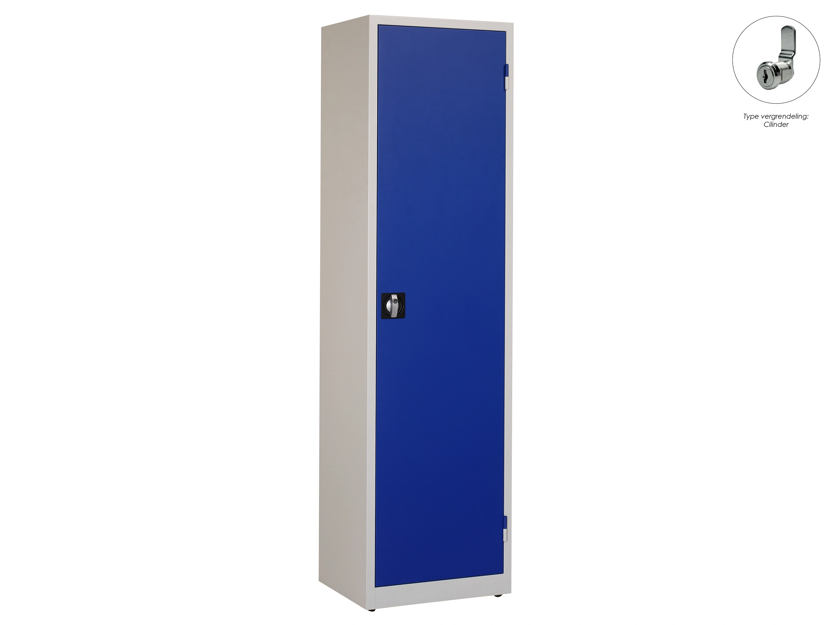 Zwaarlast draaideurkast met gelaste stalen constructie kleur romp: Grijs (RAL7035), kleur deuren: Blauw (RAL5010) voorzien van cilinderslot met verzonken handgreep Belasting per legbord: Max. 100 kg