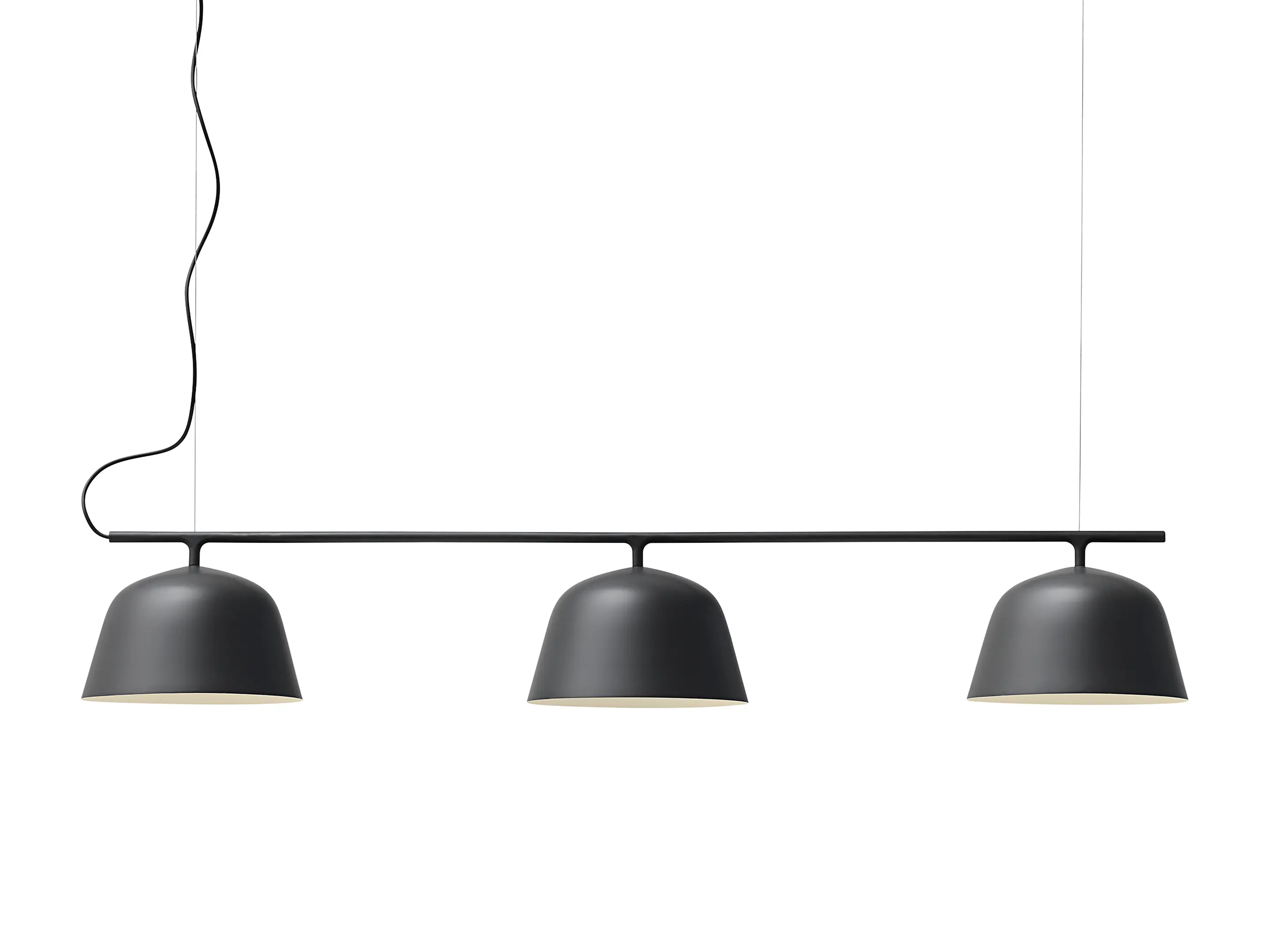 Hanglamp bestaande uit 3 ronde lampenkappen, afmeting: 250 x 250 x 200mm (BxDxH), aan een rail van 1260mm breed met een 4000mm ophangkabel, excl. lichtbron. Fitting: 3x E14. Wattage: Gloeilamp max 60W, Type G lichtbron max 13W, LED-lamp max 11W.