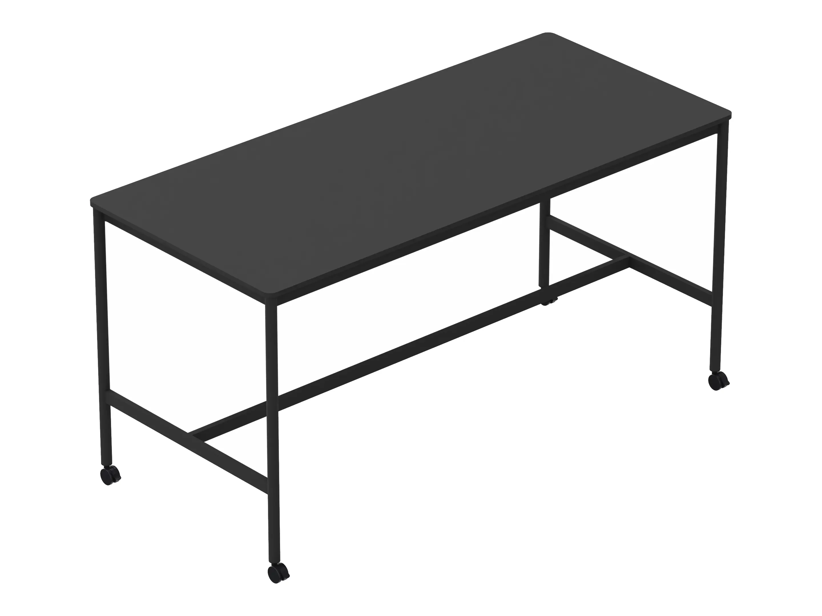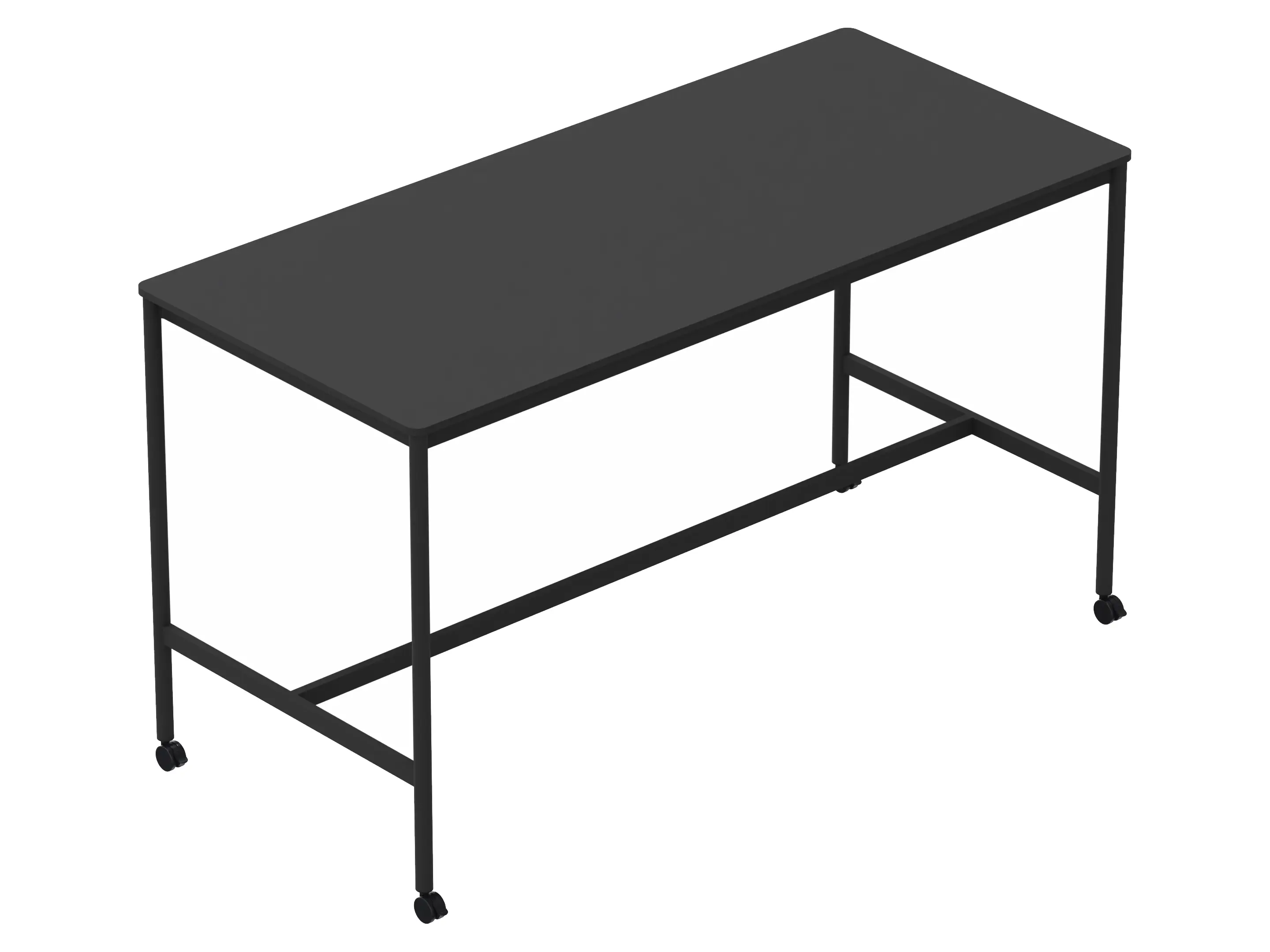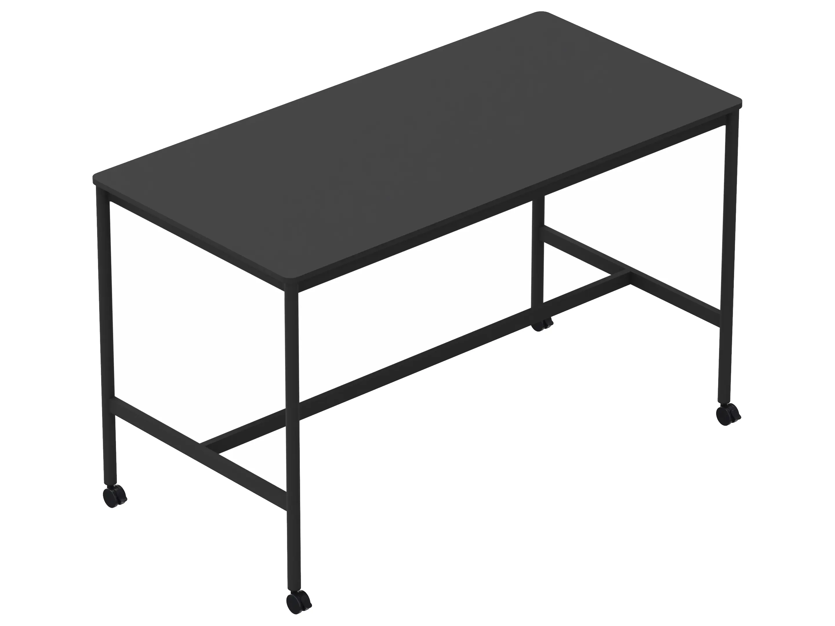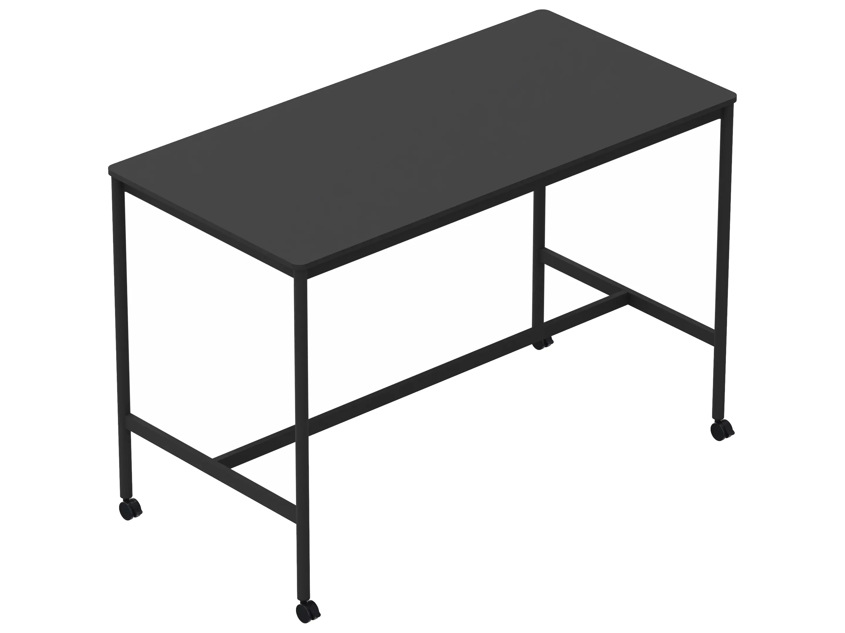 Statafel met een rechthoekig blad op een 4-poots frame op wielen met steunbalk. Hoogte: 950mm.