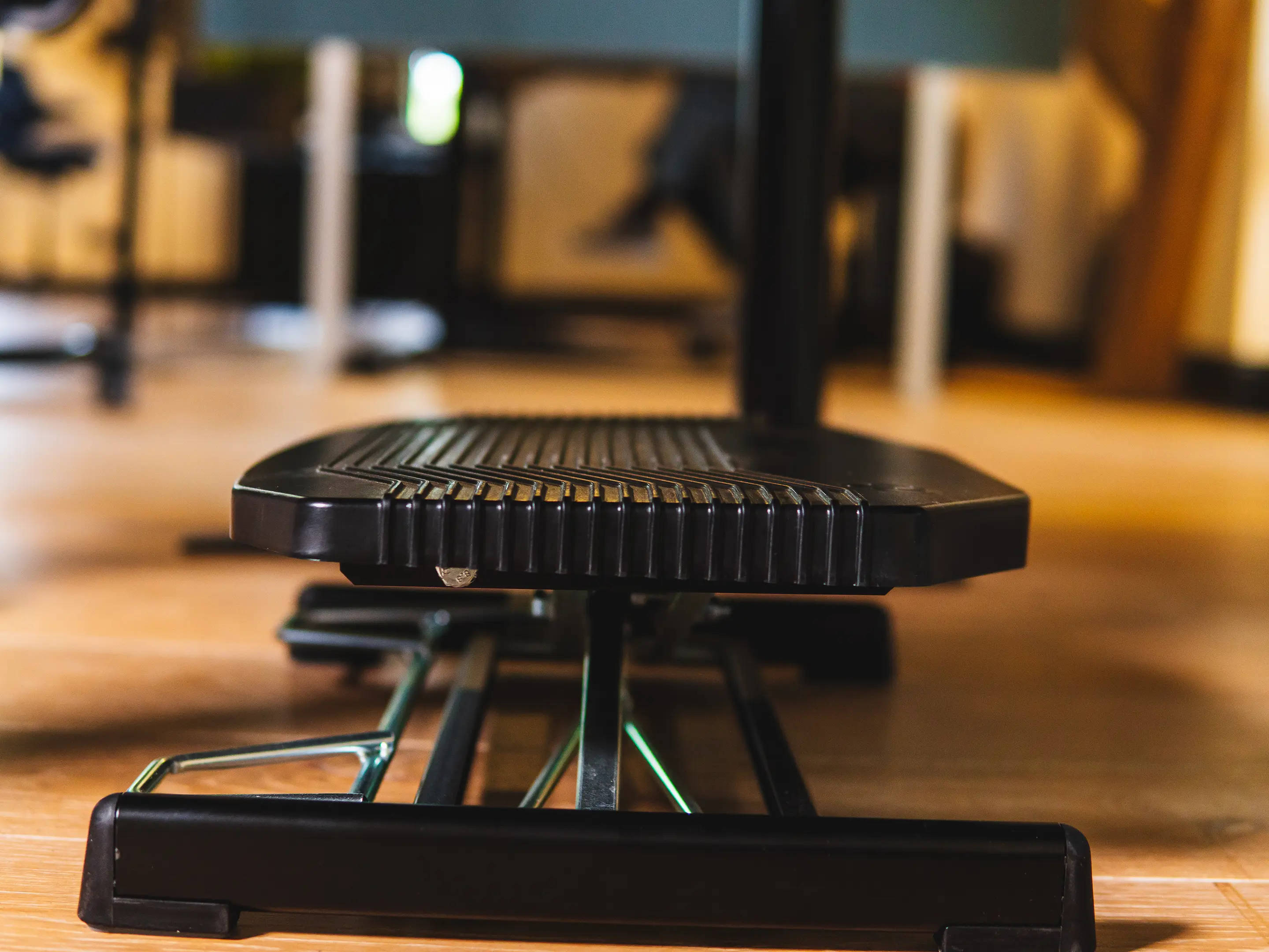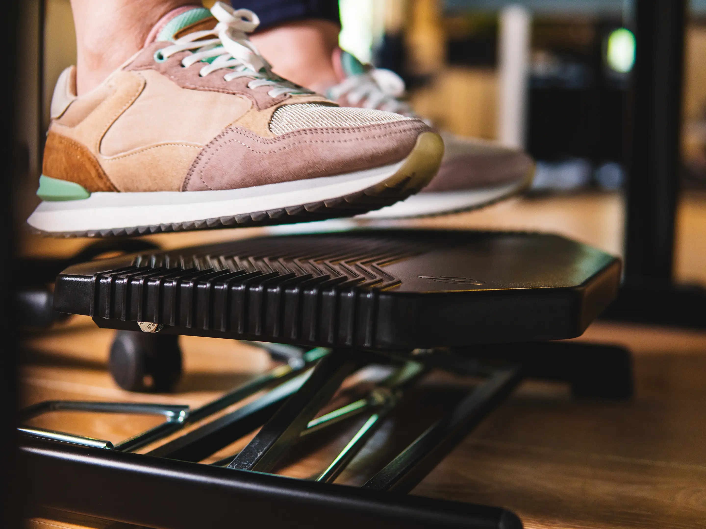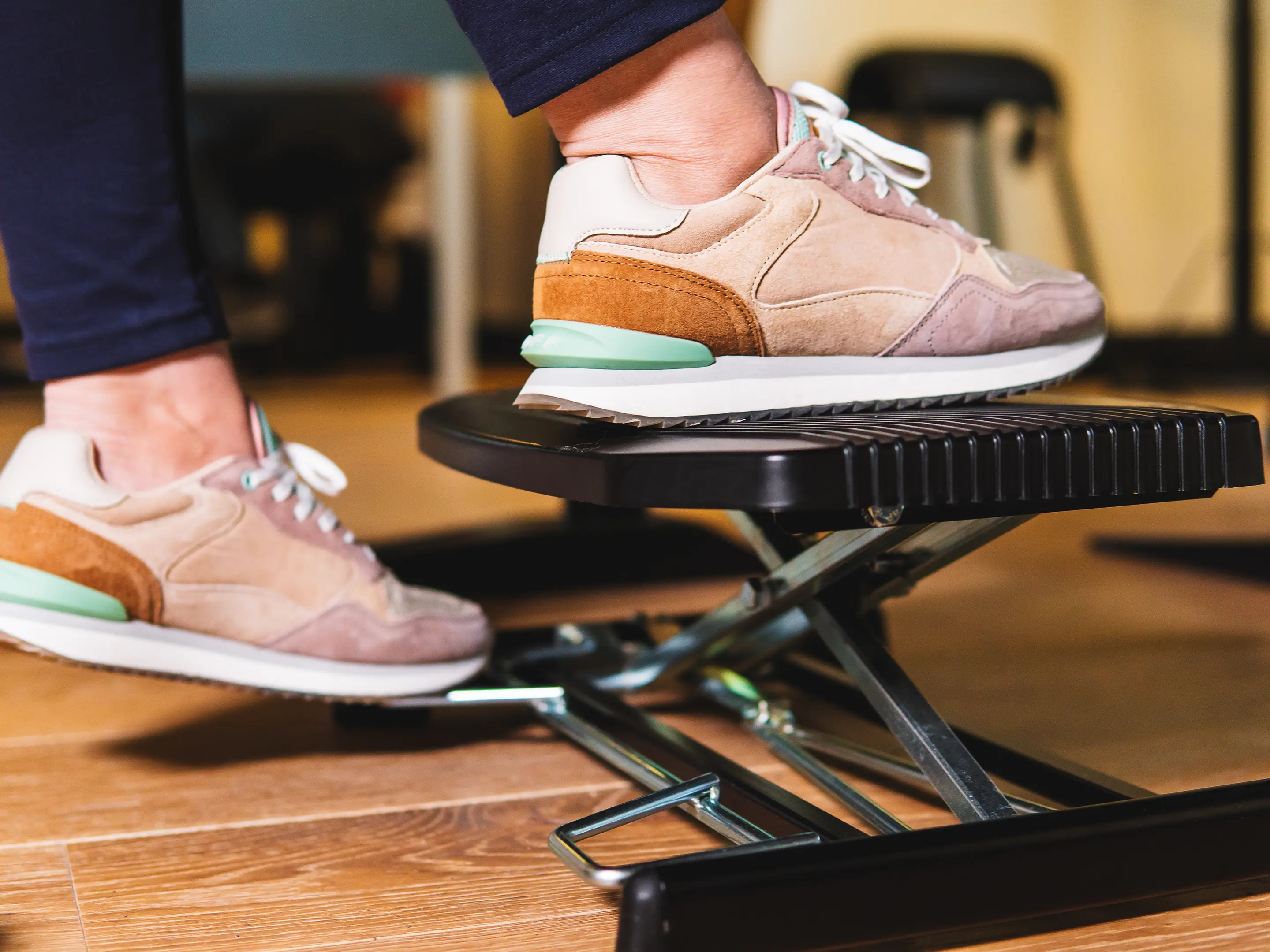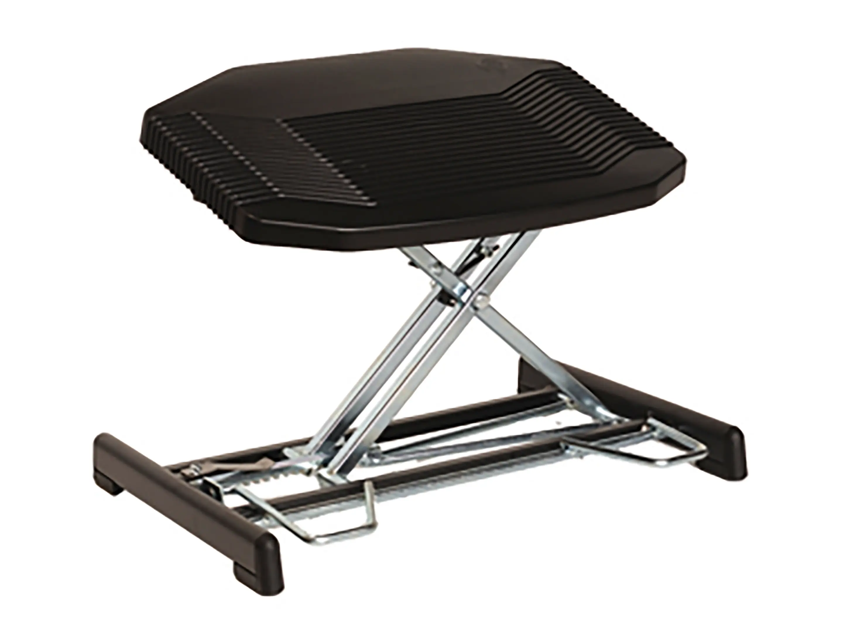 Een duurzame, ergonomische voetensteun met antislip oppervlak. Verstelbaar met de voeten in hoogte (80–290 mm) en hoek (0–48°), verbetert houding en bloedsomloop en is geschikt voor diverse werkplekken.