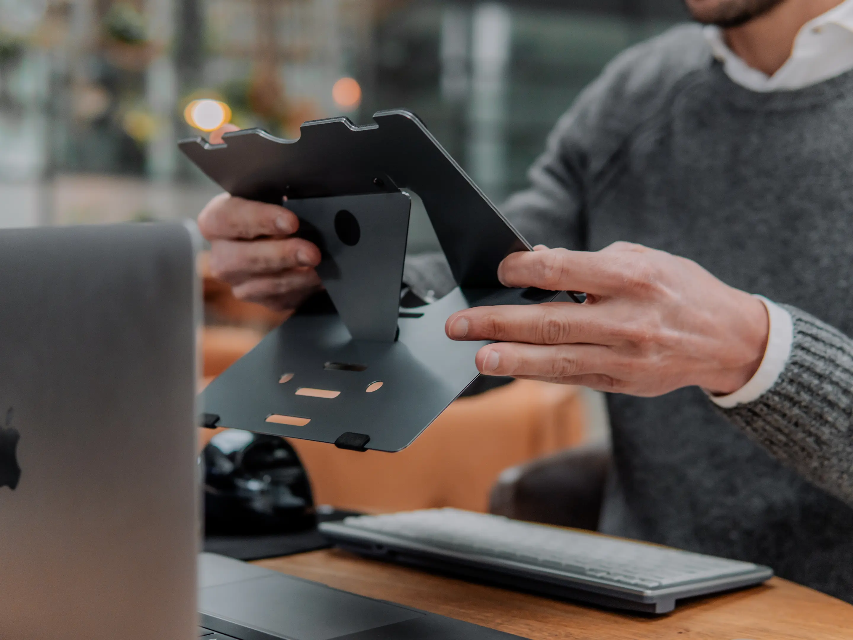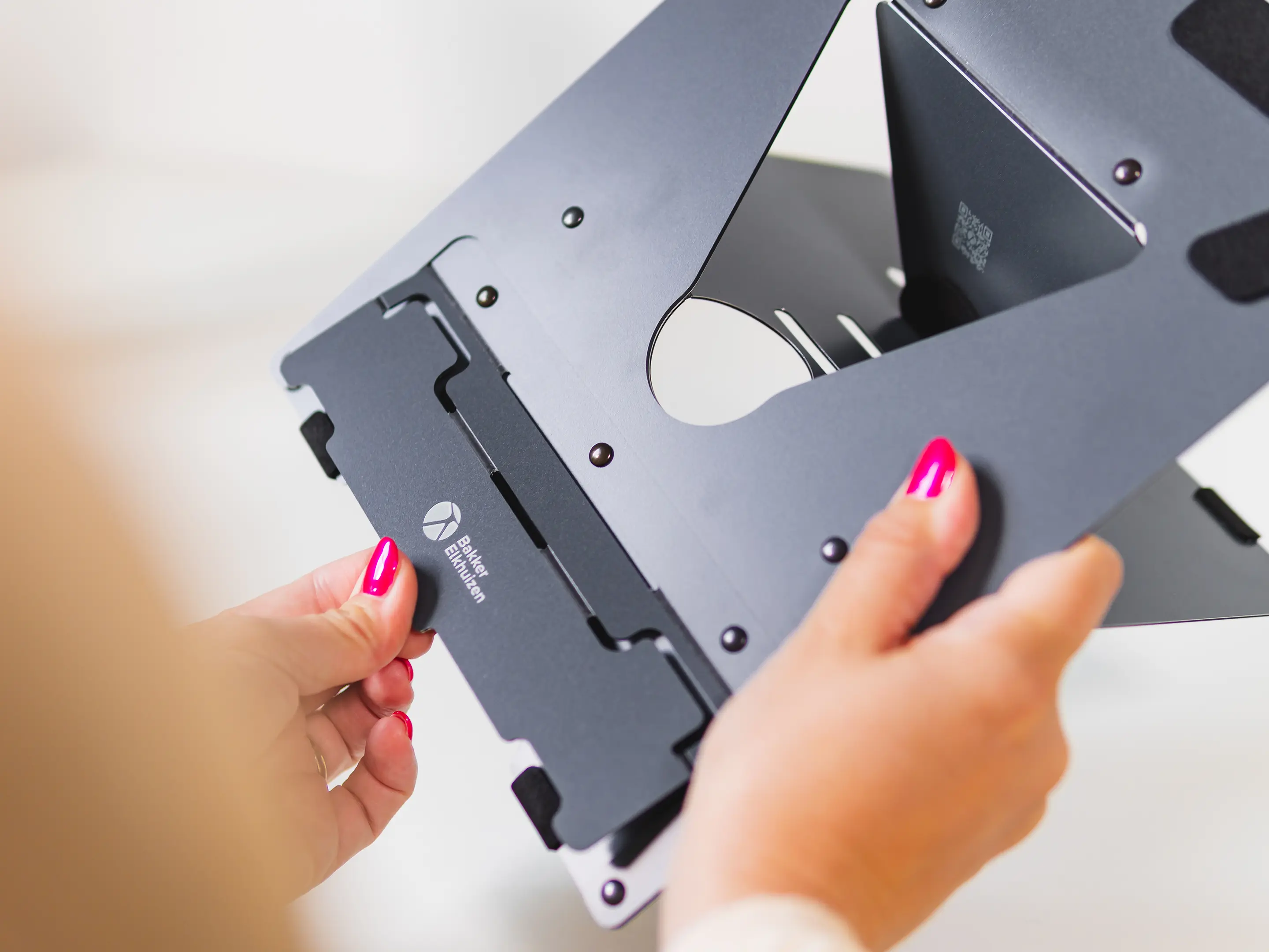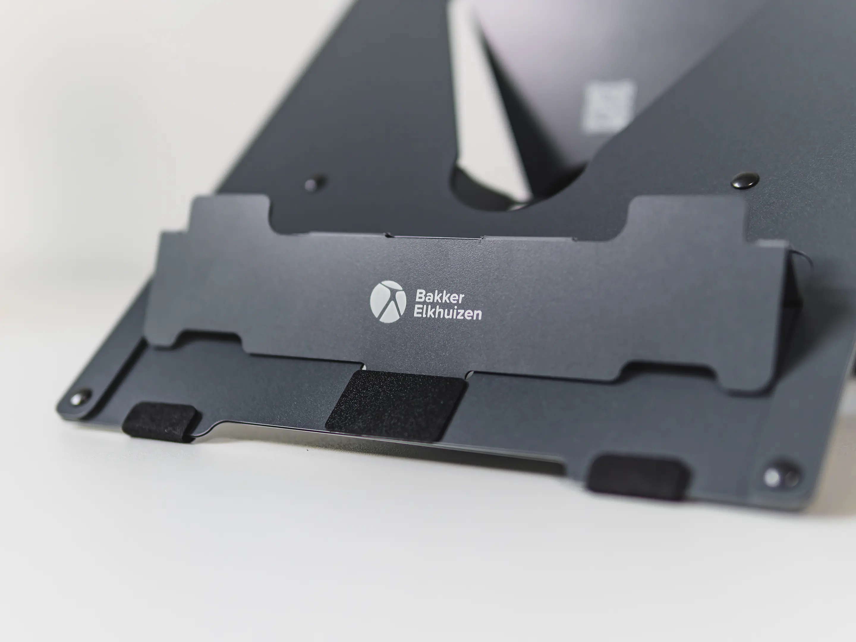 Een licht, opvouwbaar laptopstandaard van stabiel aluminium sandwichmateriaal in donkergrijs. Verstelbaar van 110–180mm, compact en mobiel, met ventilatie, magnetische sluiting en beschermhoes voor ergonomisch, productief en gezond laptopwerk