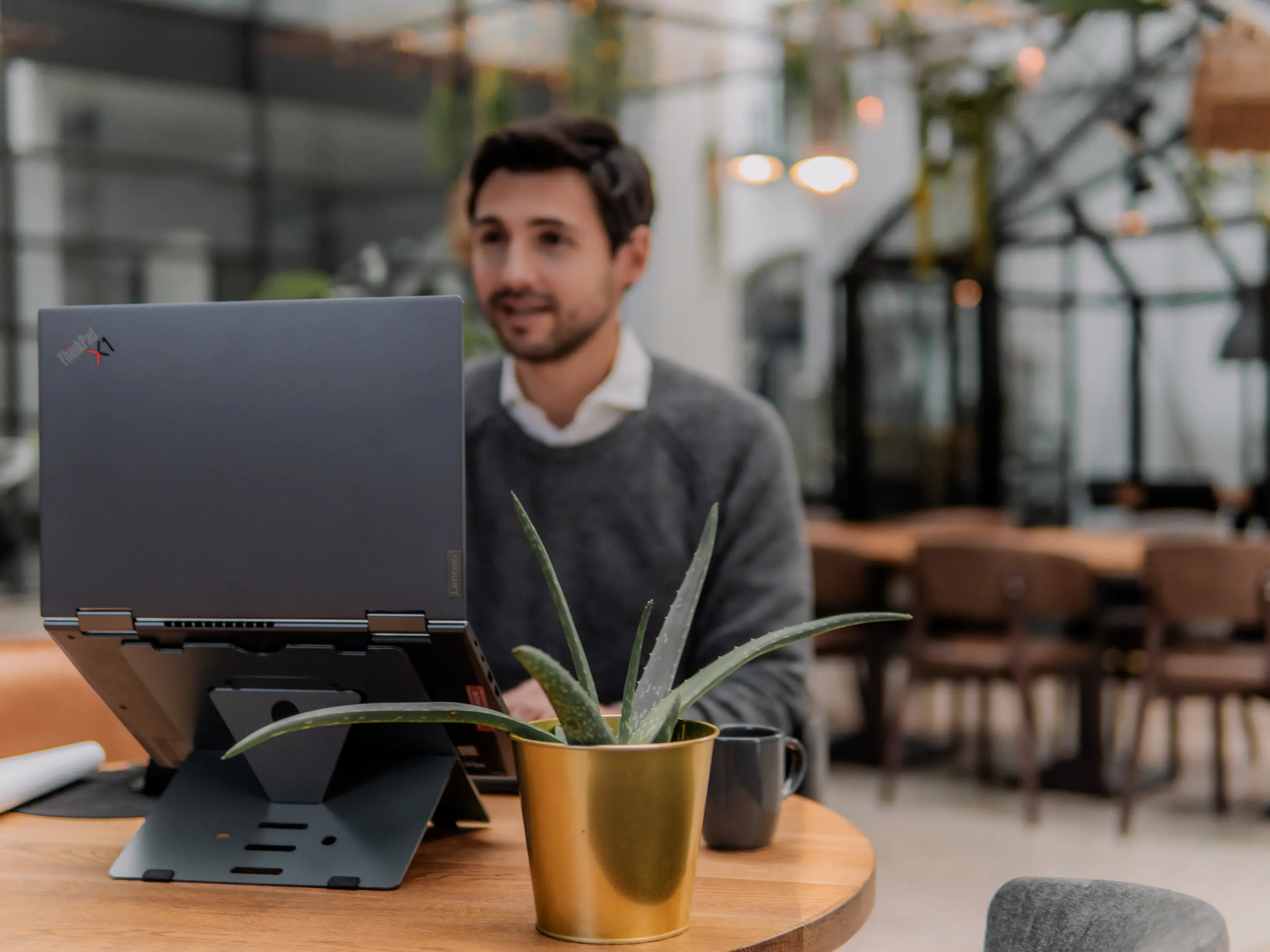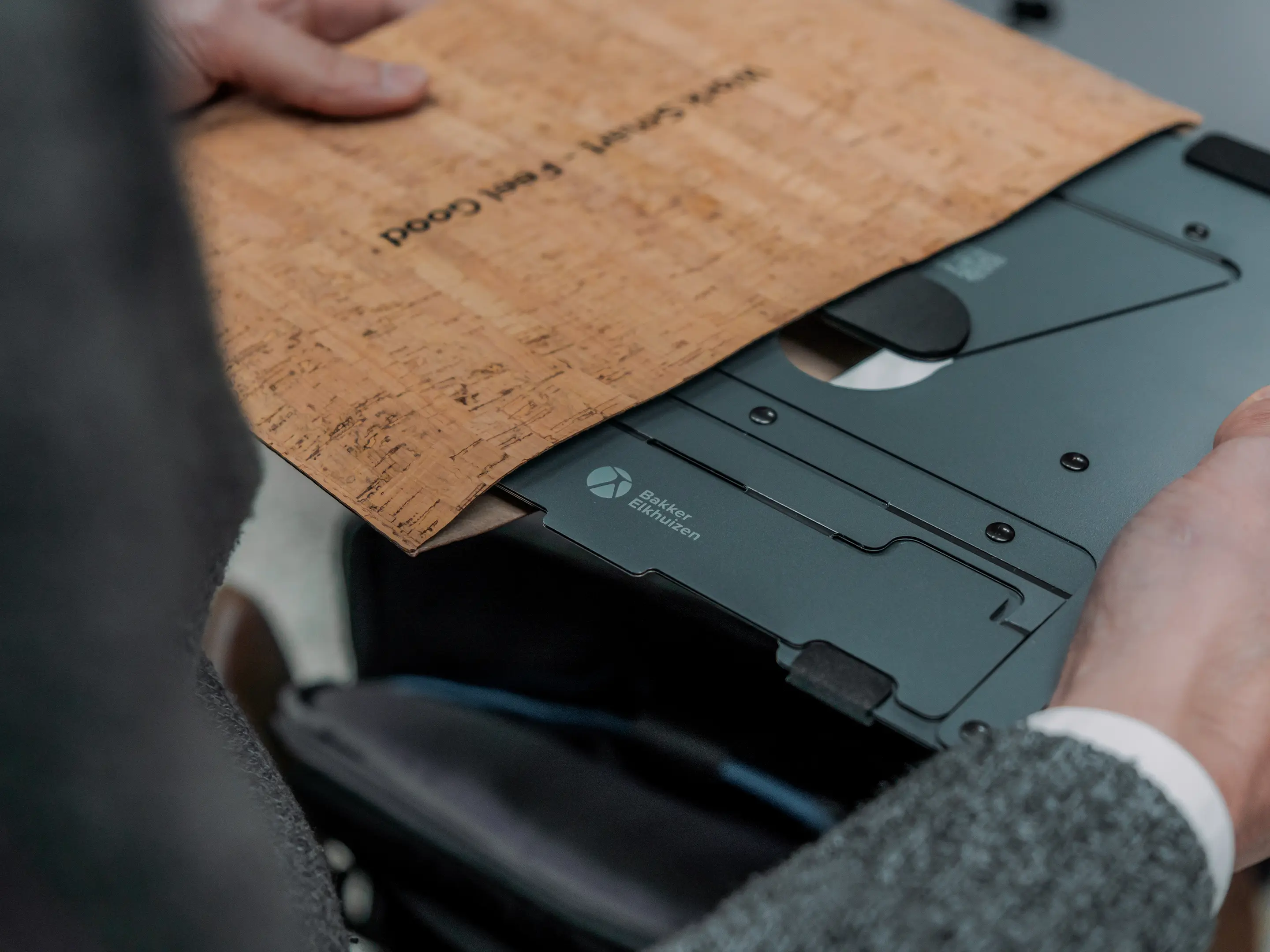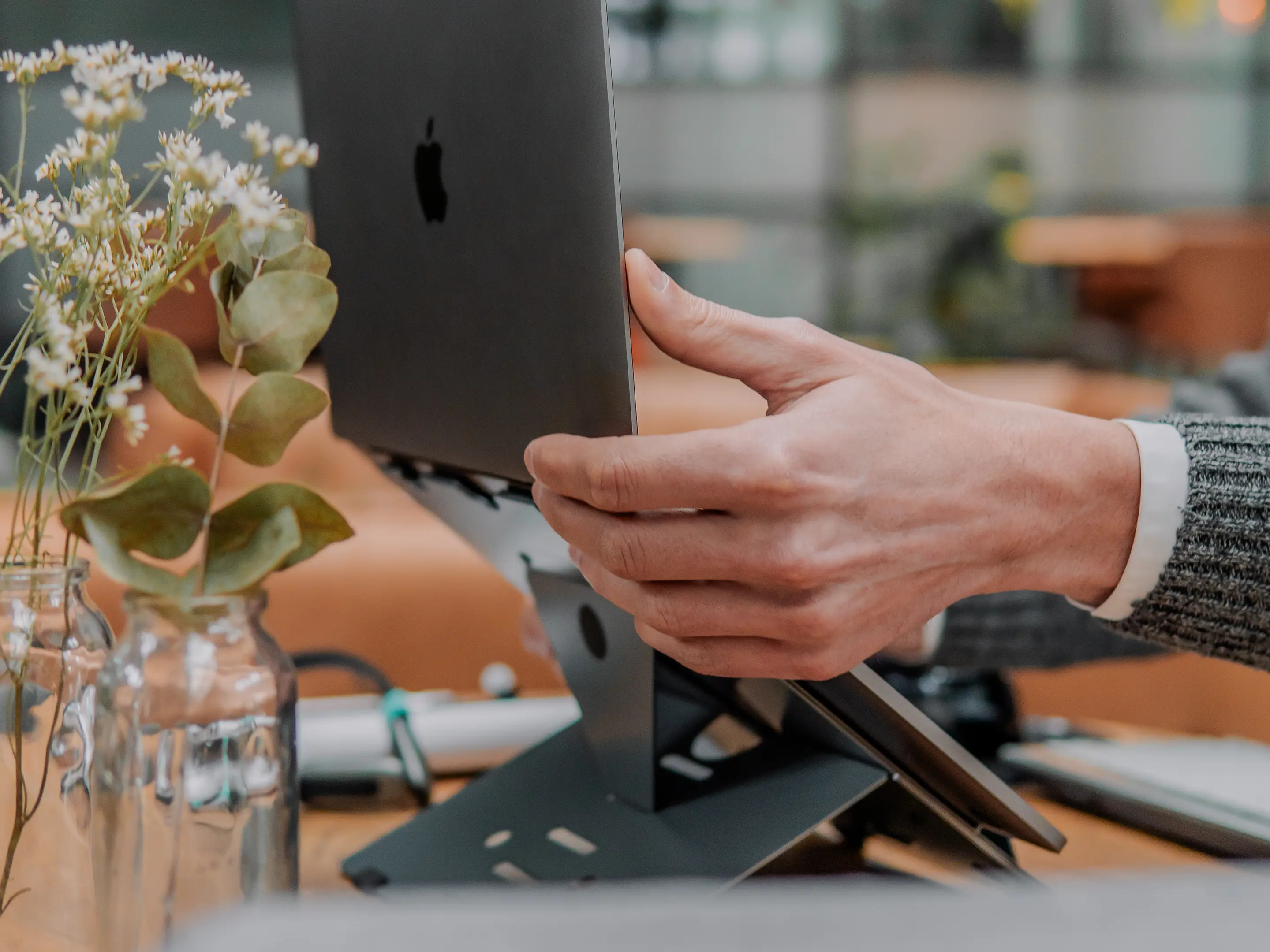 Een licht, opvouwbaar laptopstandaard van stabiel aluminium sandwichmateriaal in donkergrijs. Verstelbaar van 110–180mm, compact en mobiel, met ventilatie, magnetische sluiting en beschermhoes voor ergonomisch, productief en gezond laptopwerk
