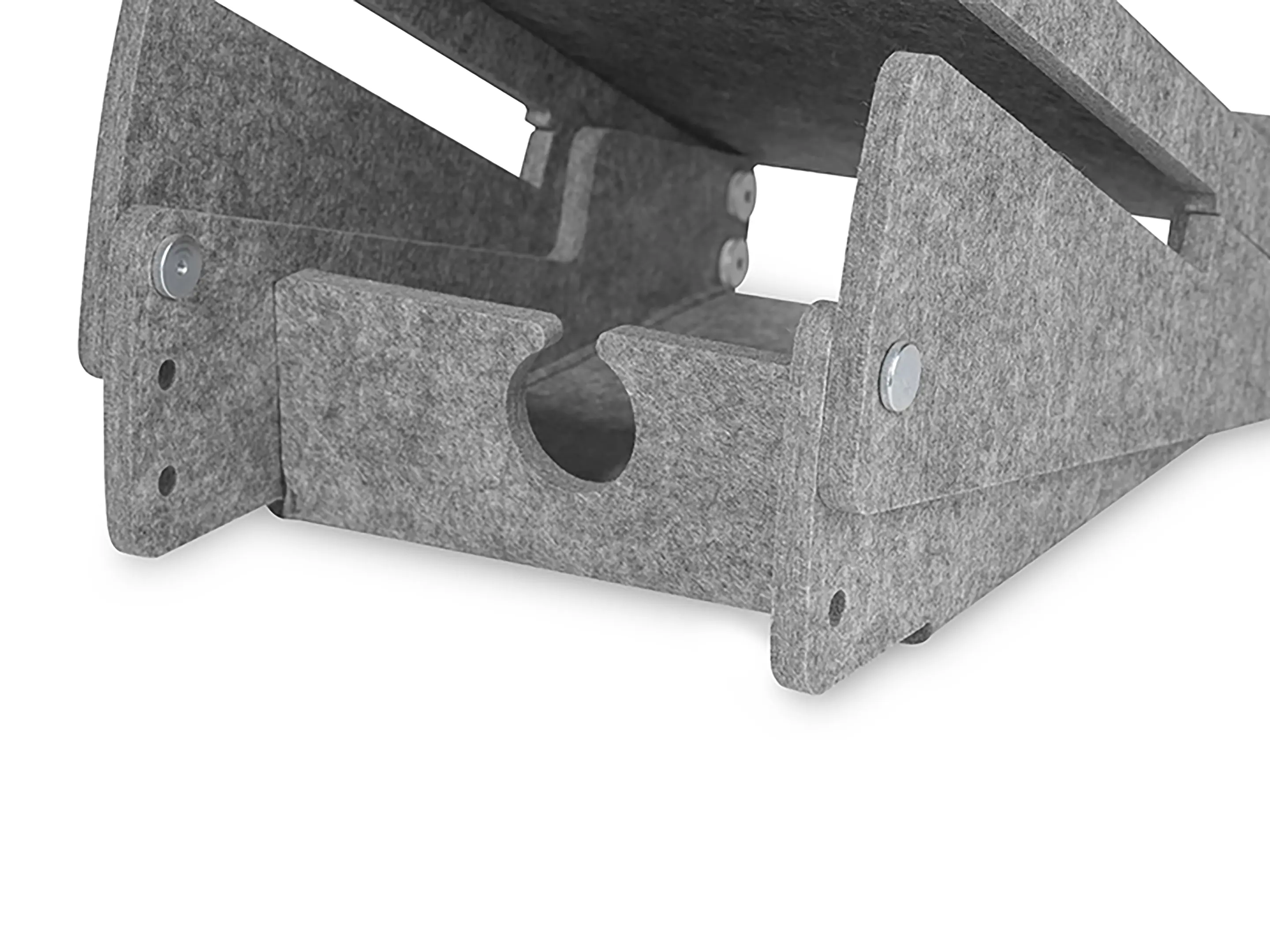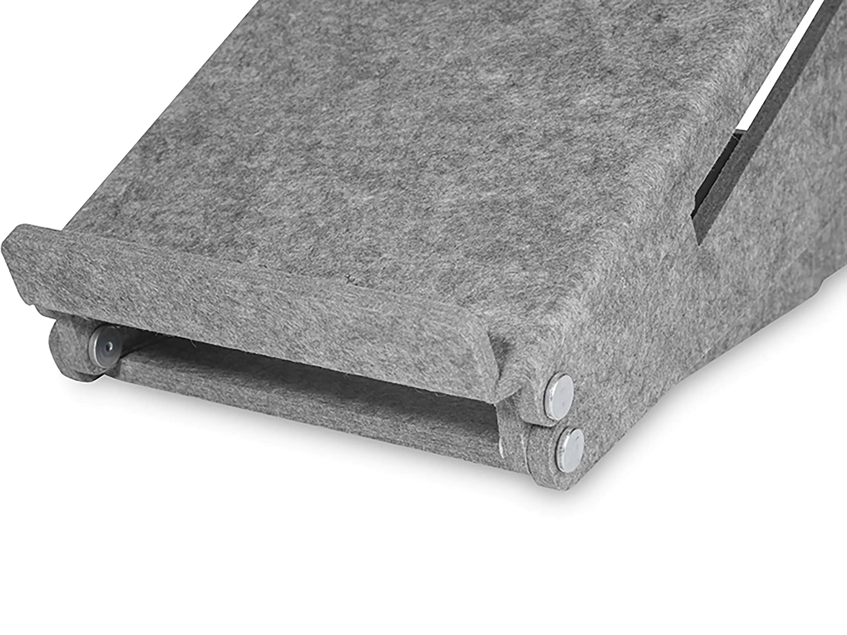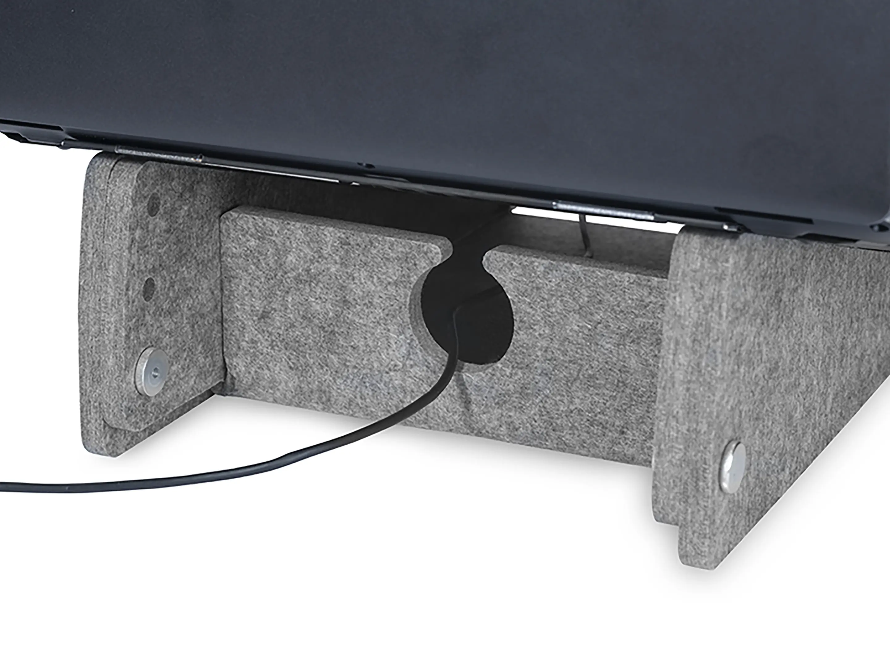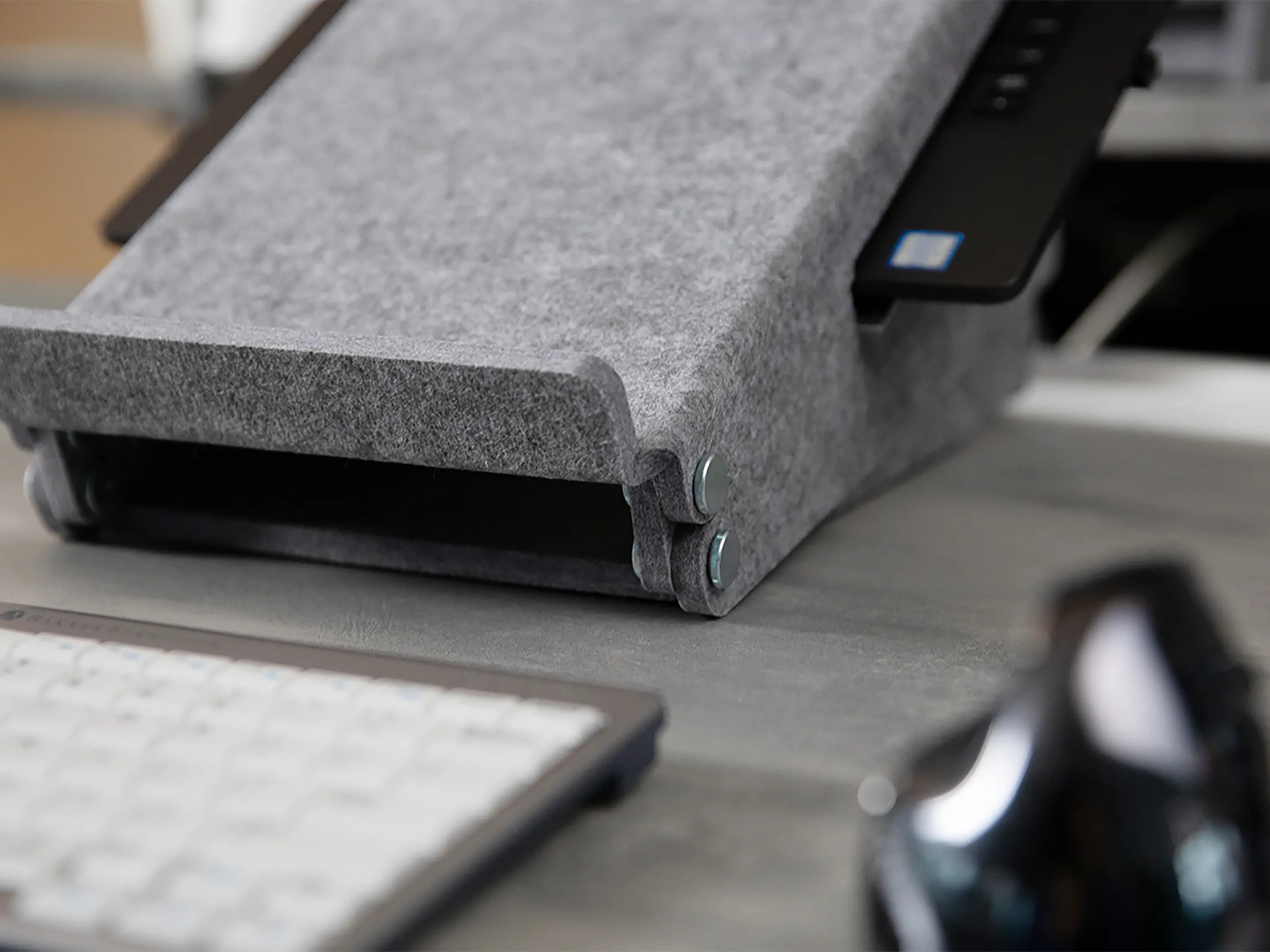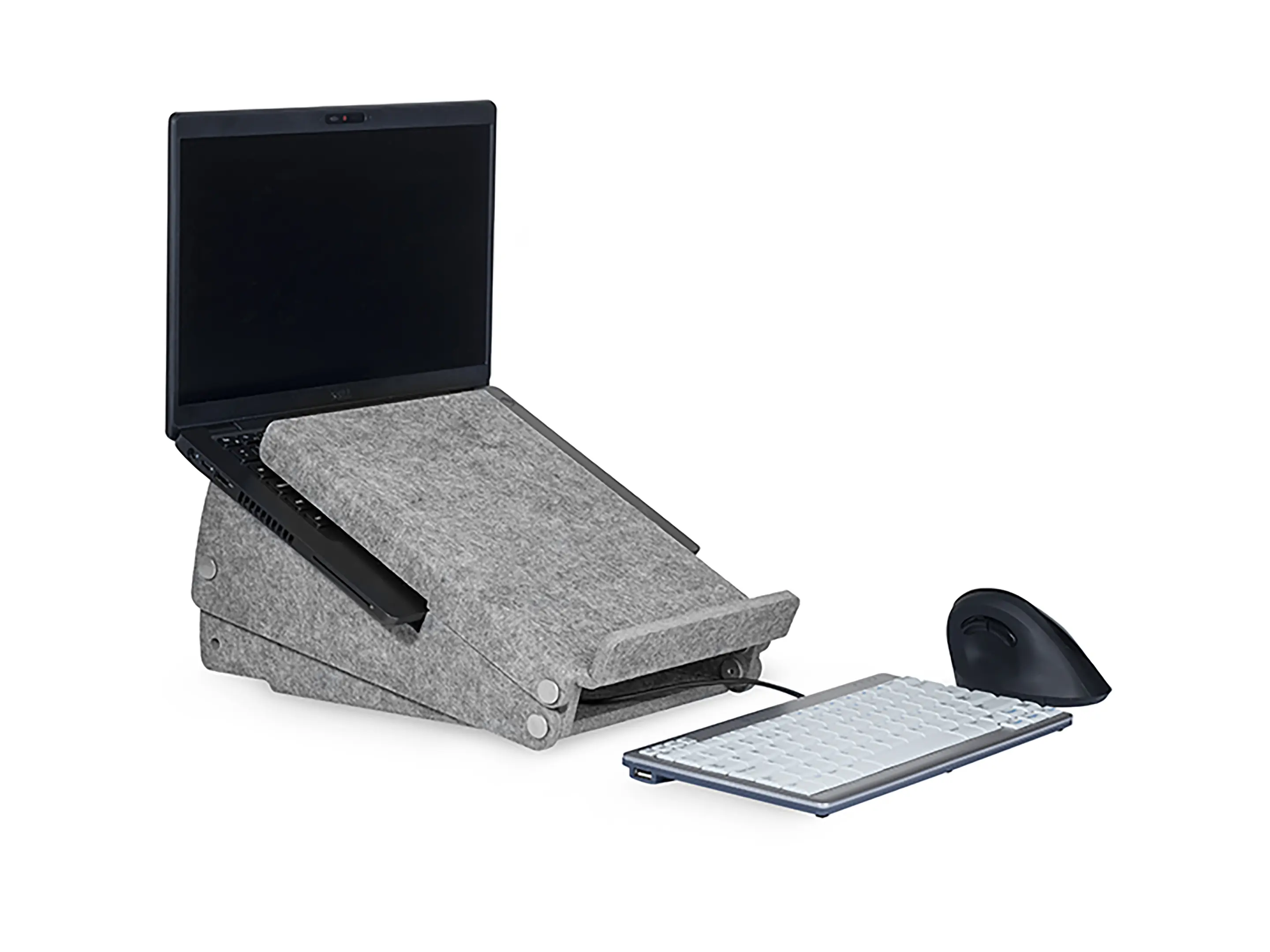 Duurzame laptopstandaard van 100% gerecycled PET-vilt, sterk, onderhoudsvriendelijk en volledig recyclebaar. Met documenthouder en verstelbaar van 140–180 mm voor een ergonomische houding. Bevordert koeling en productiviteit.