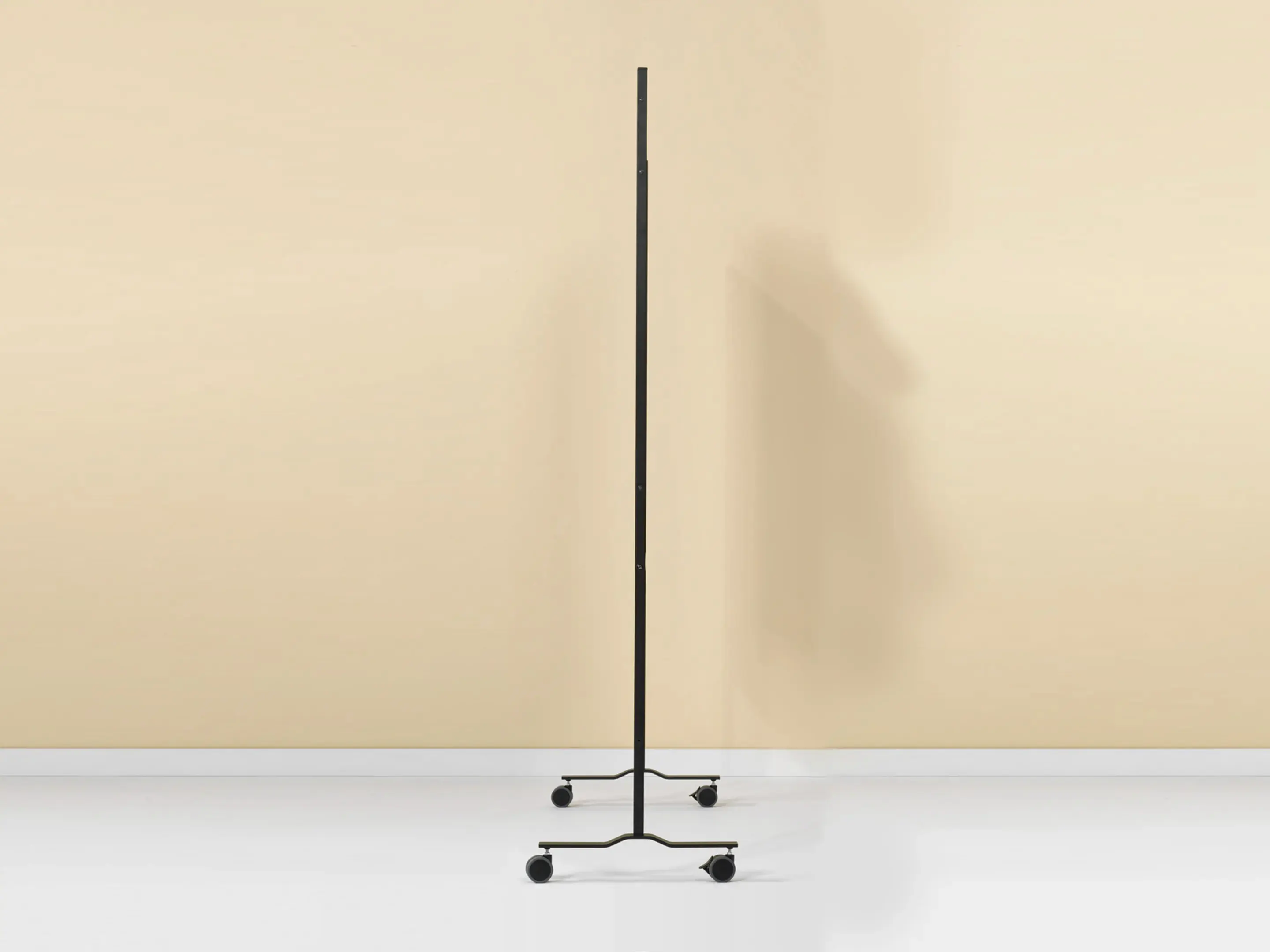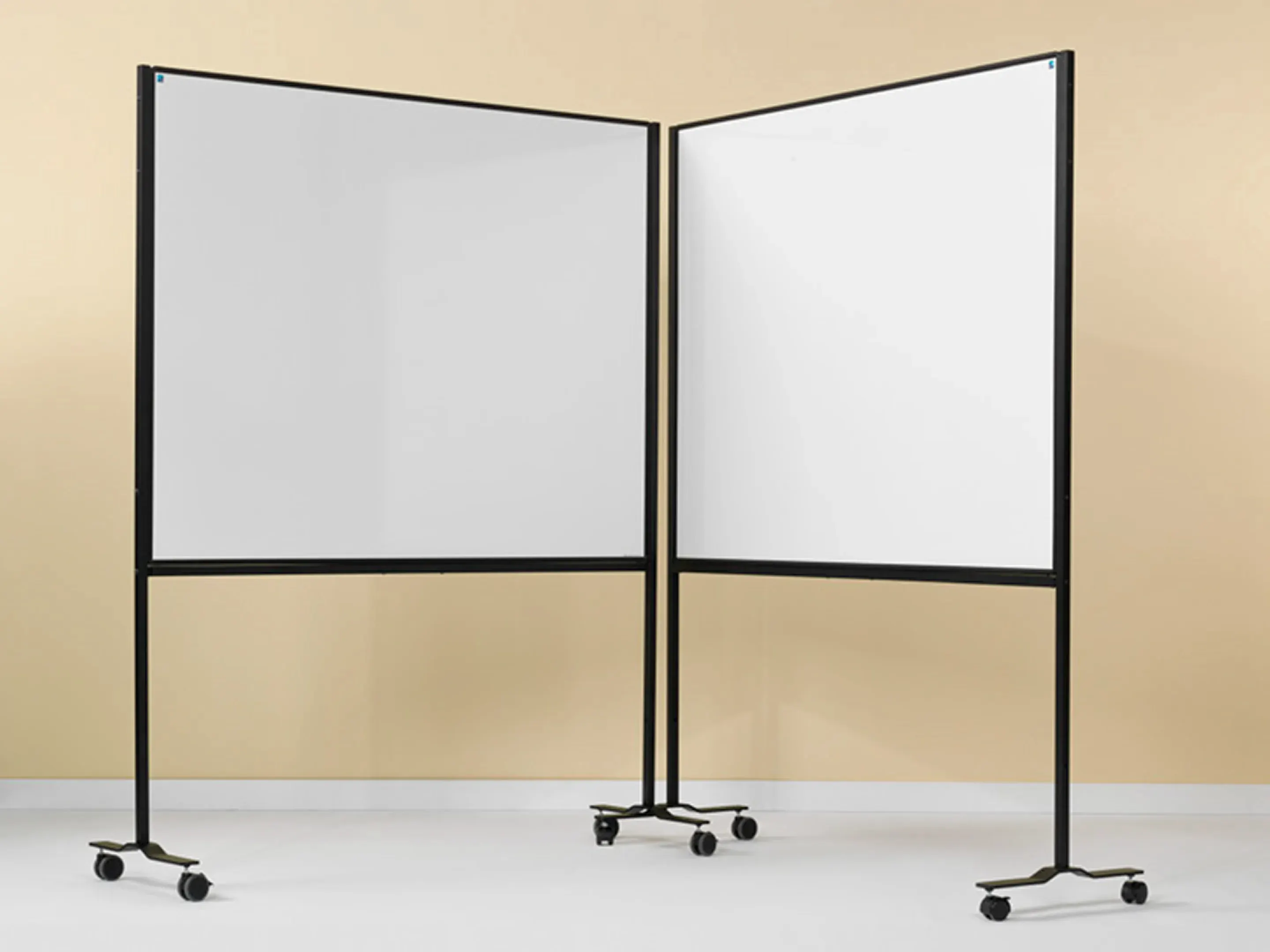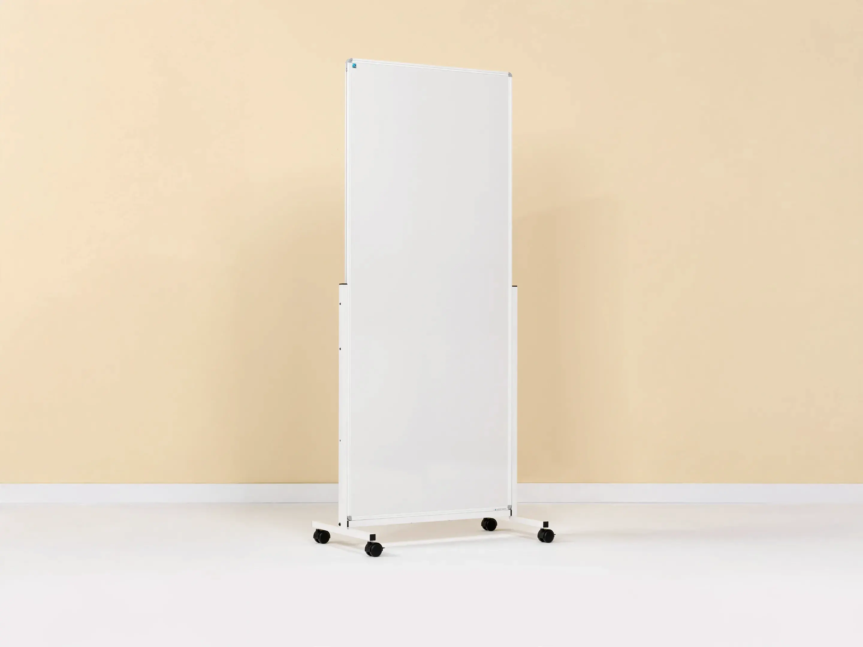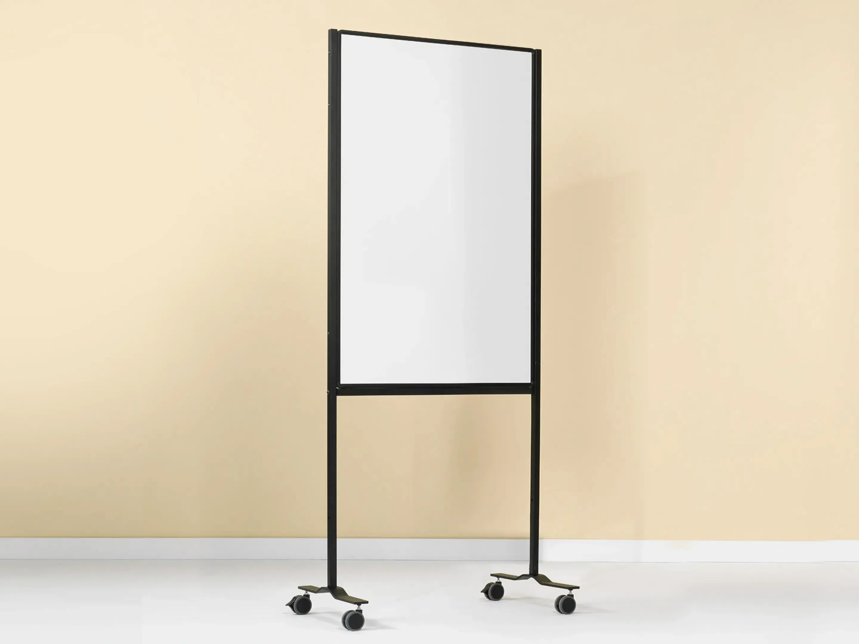 Dubbelzijdig whiteboard van wit gelakt staal met zwart profiel op 4 wielen waarvan 2 met rem. Geschikt voor dry wipe. Geschikt voor normaal tot vrij intensief gebruik. Afmeting: 750 x 1200mm (B x H).