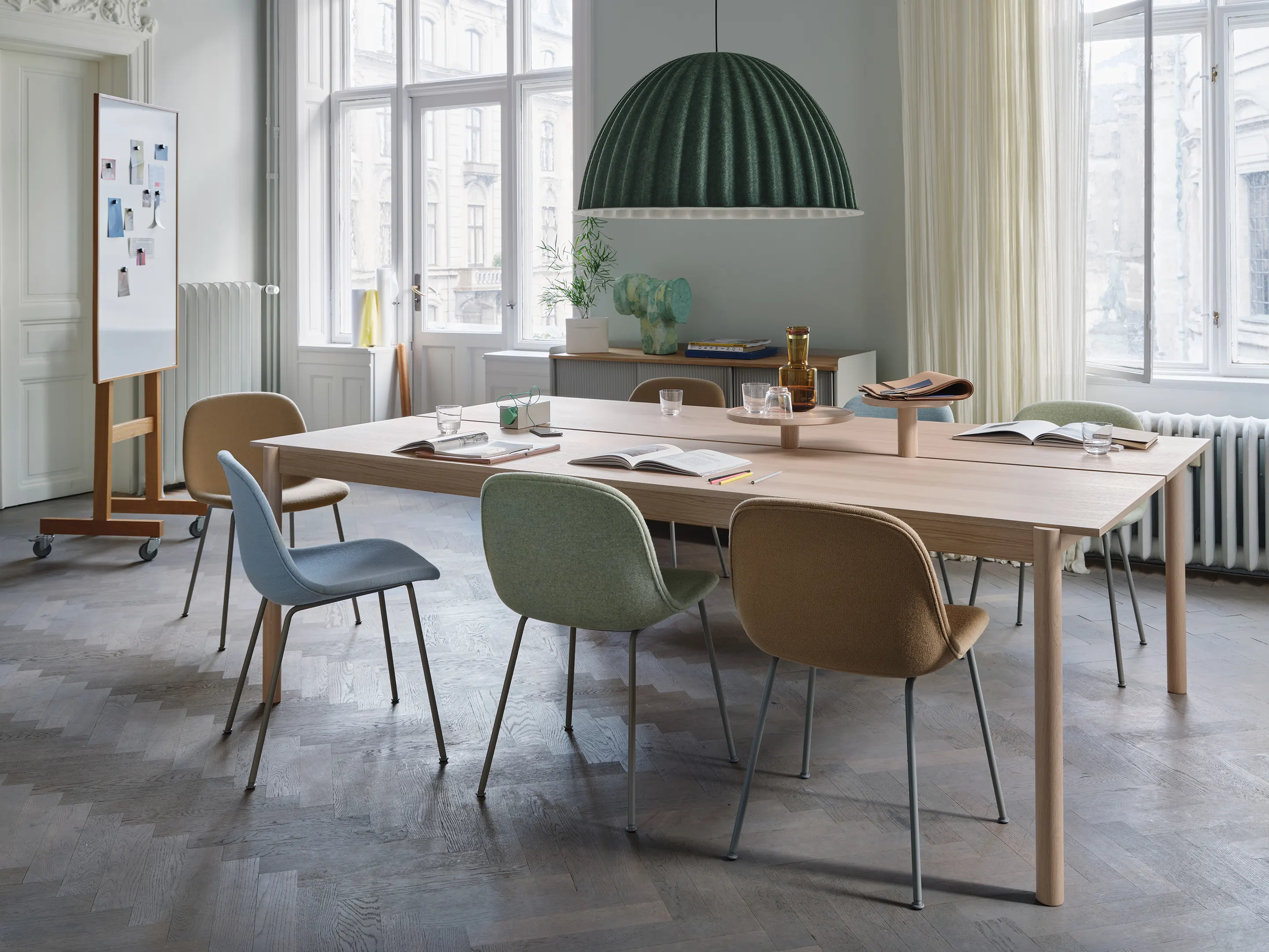 Complete vergadertafel bestaande uit 2 rechthoekige bladen op een 4-poots frame. Totale afmeting incl. frame: 2400 x 1469 x 740mm (BxDxH).