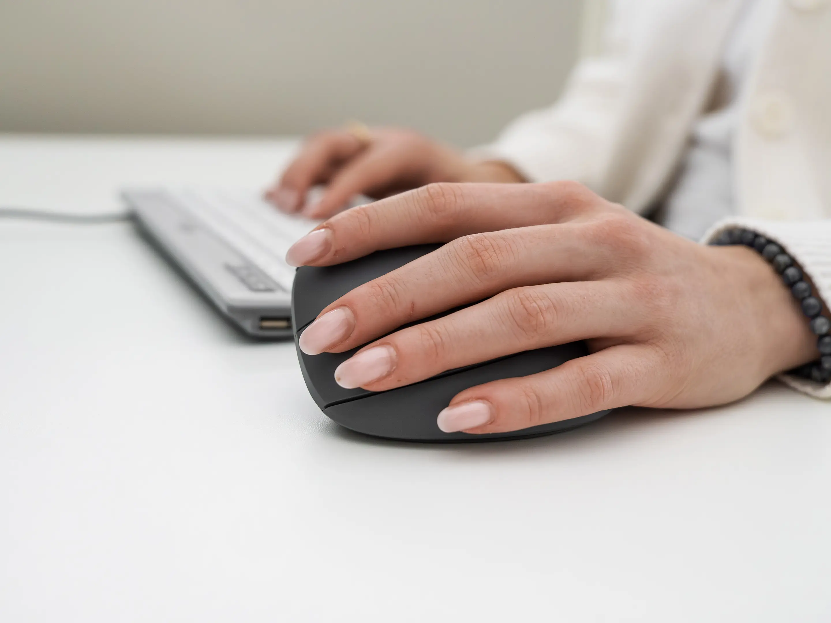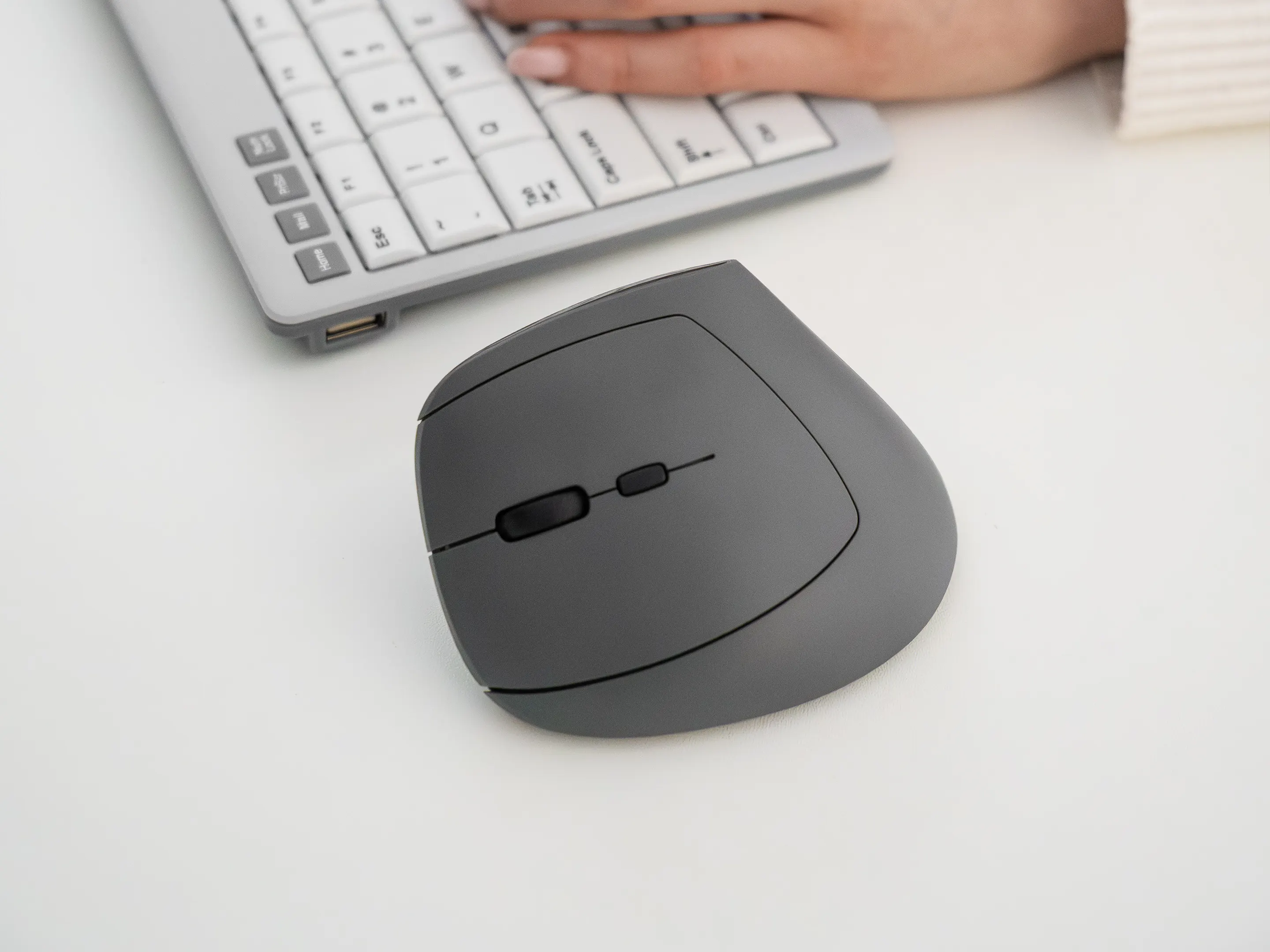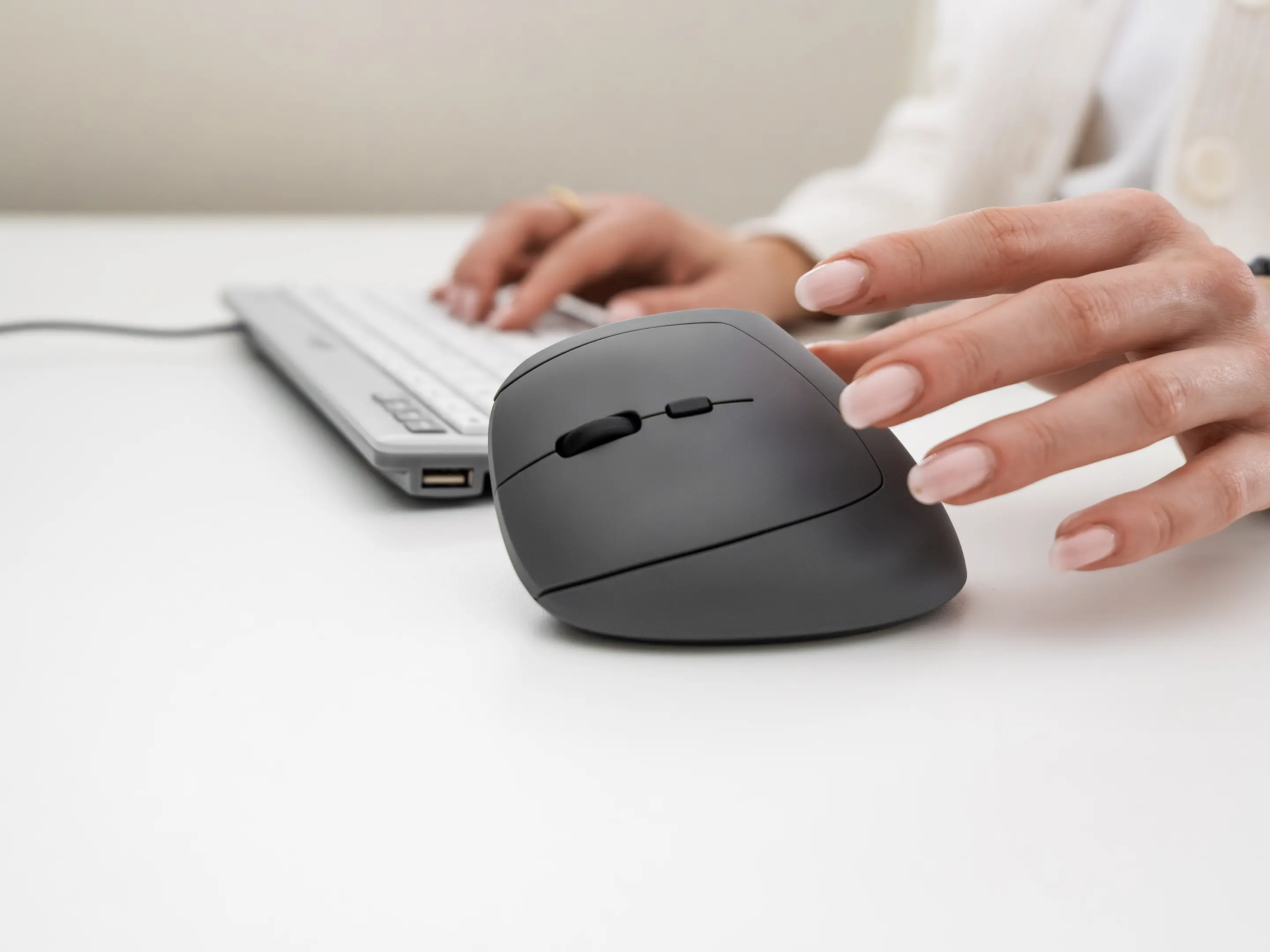 Verbinding mogelijk via: USB-C kabel, draadloos via USB-C dongle en bluetooth. Verticaal scrollen, DPI instelbaar, vorige/volgende duimknoppen.