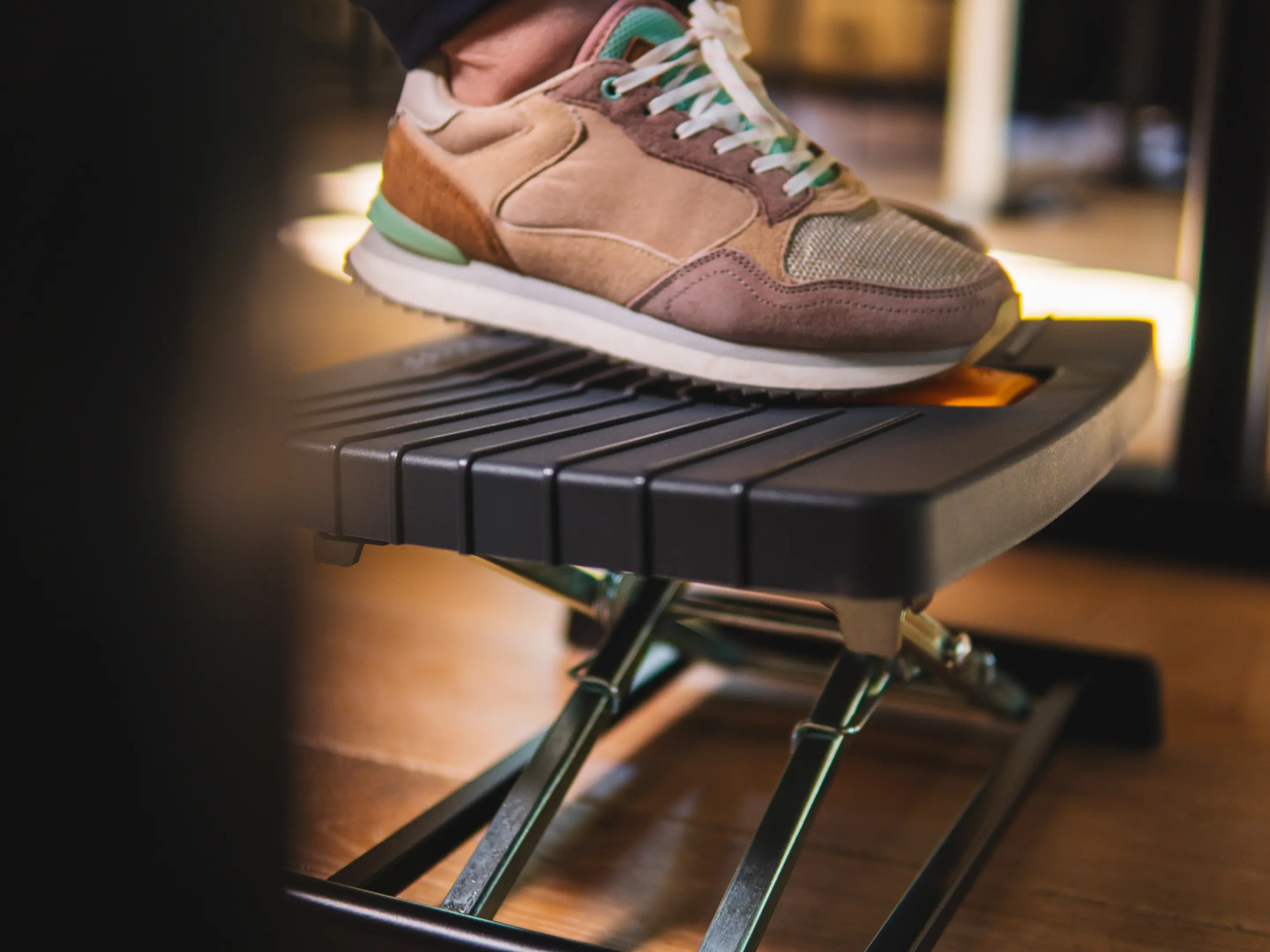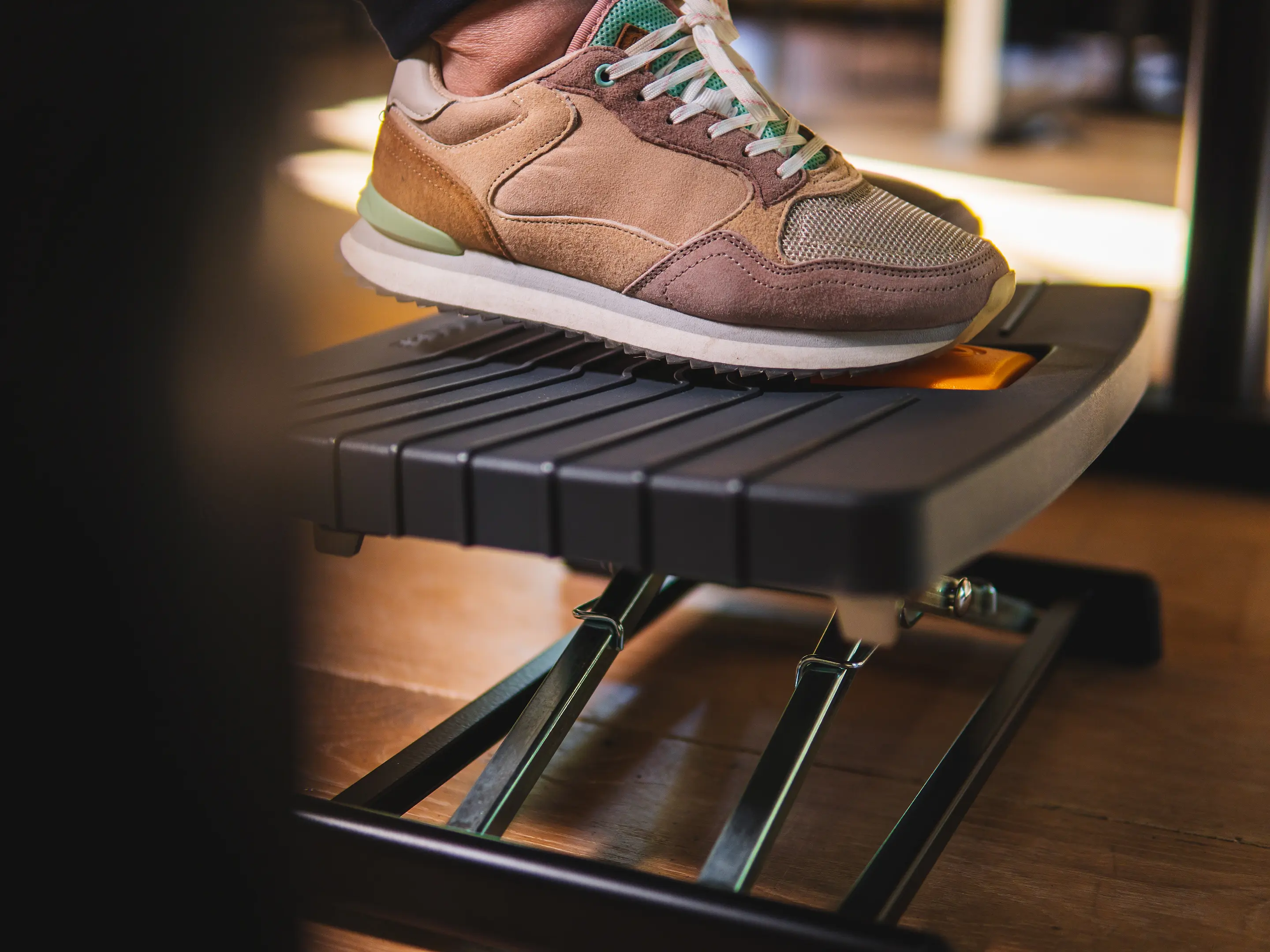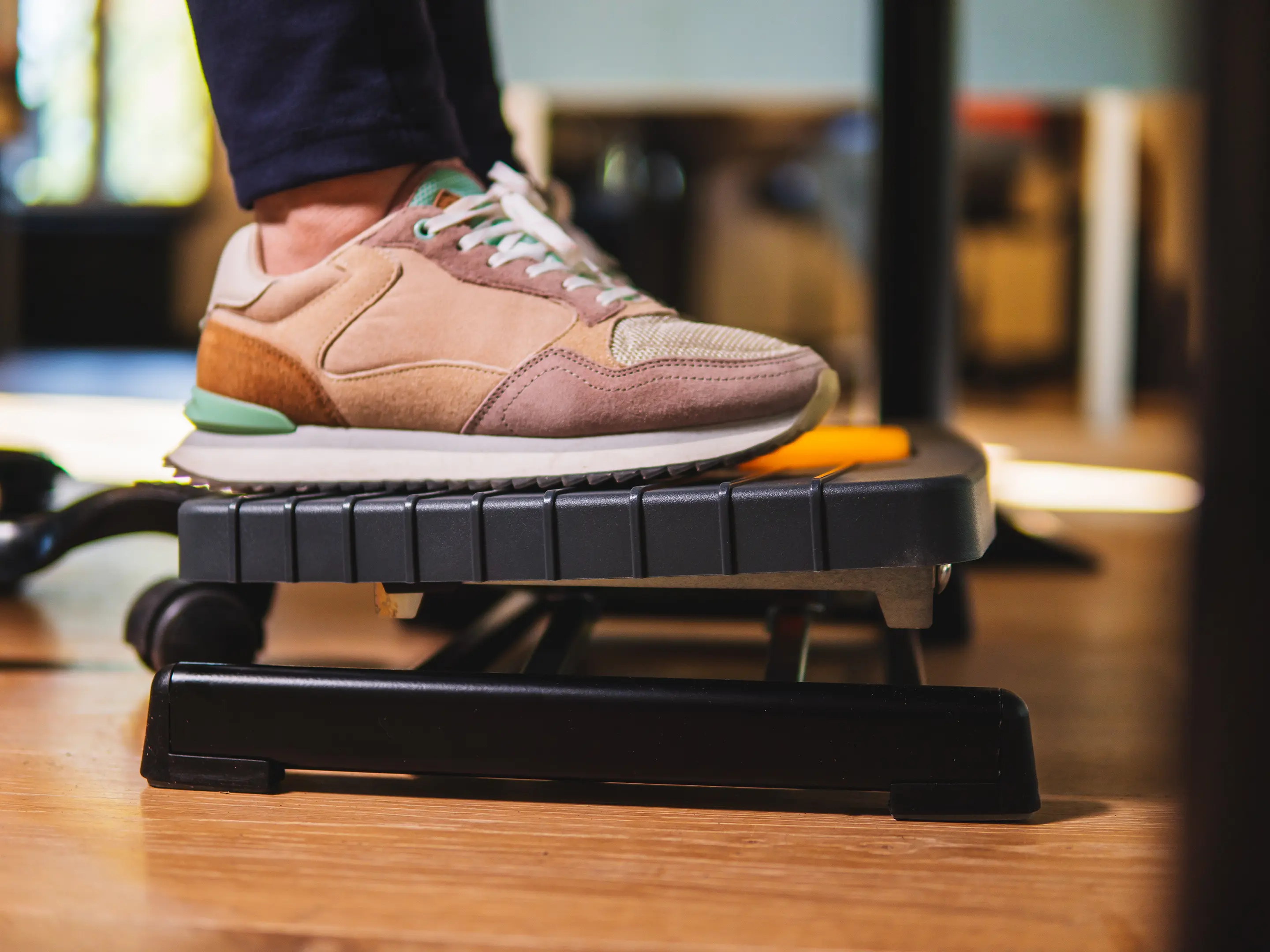Een compacte, robuuste voetensteun die benen ondersteunt en de bloedsomloop verbetert. Eenvoudig met één voet verstelbaar in hoogte (80–300 mm) en hoek (0–90°), met antislip oppervlak voor comfortabel en ergonomisch werken.