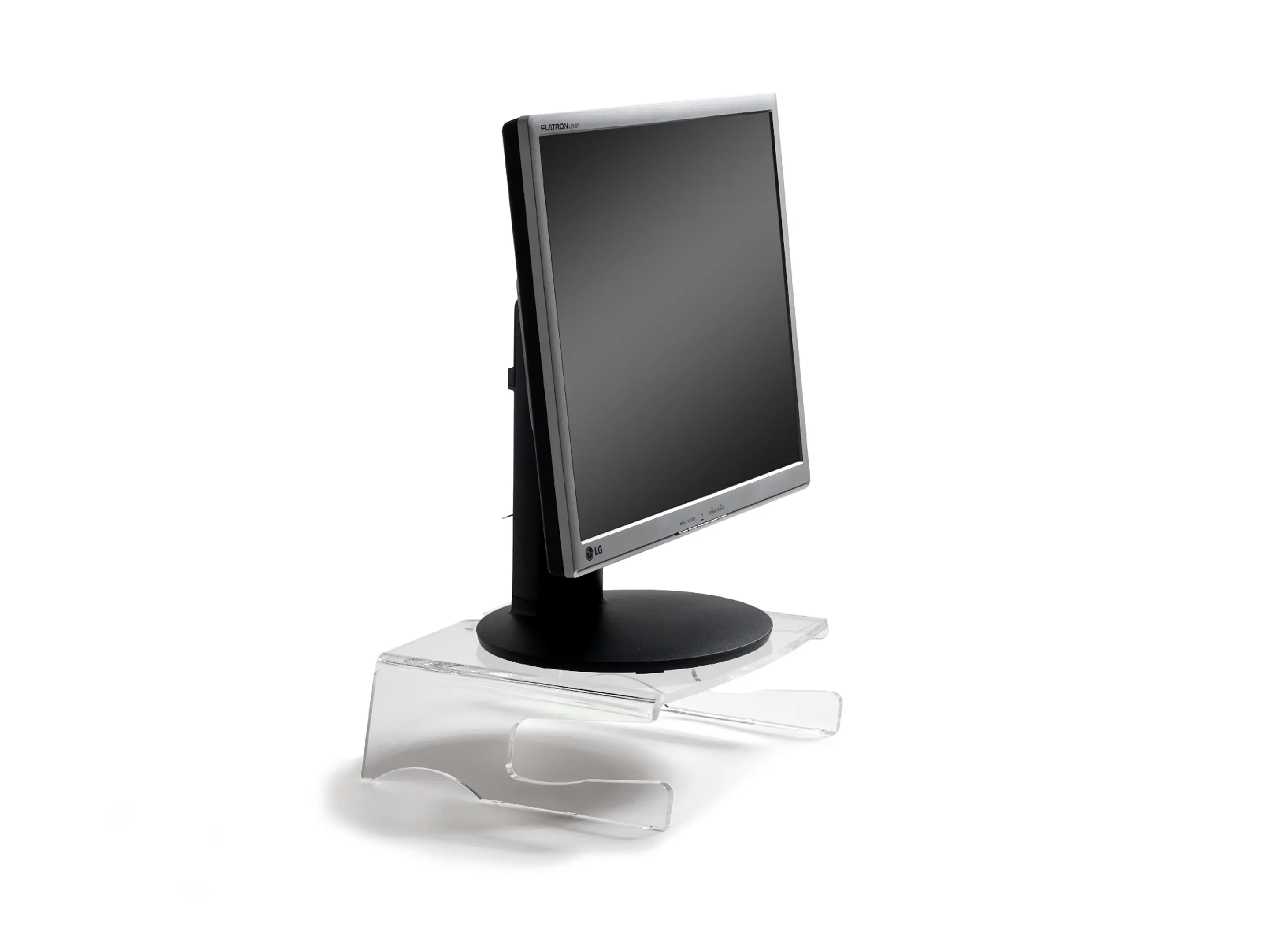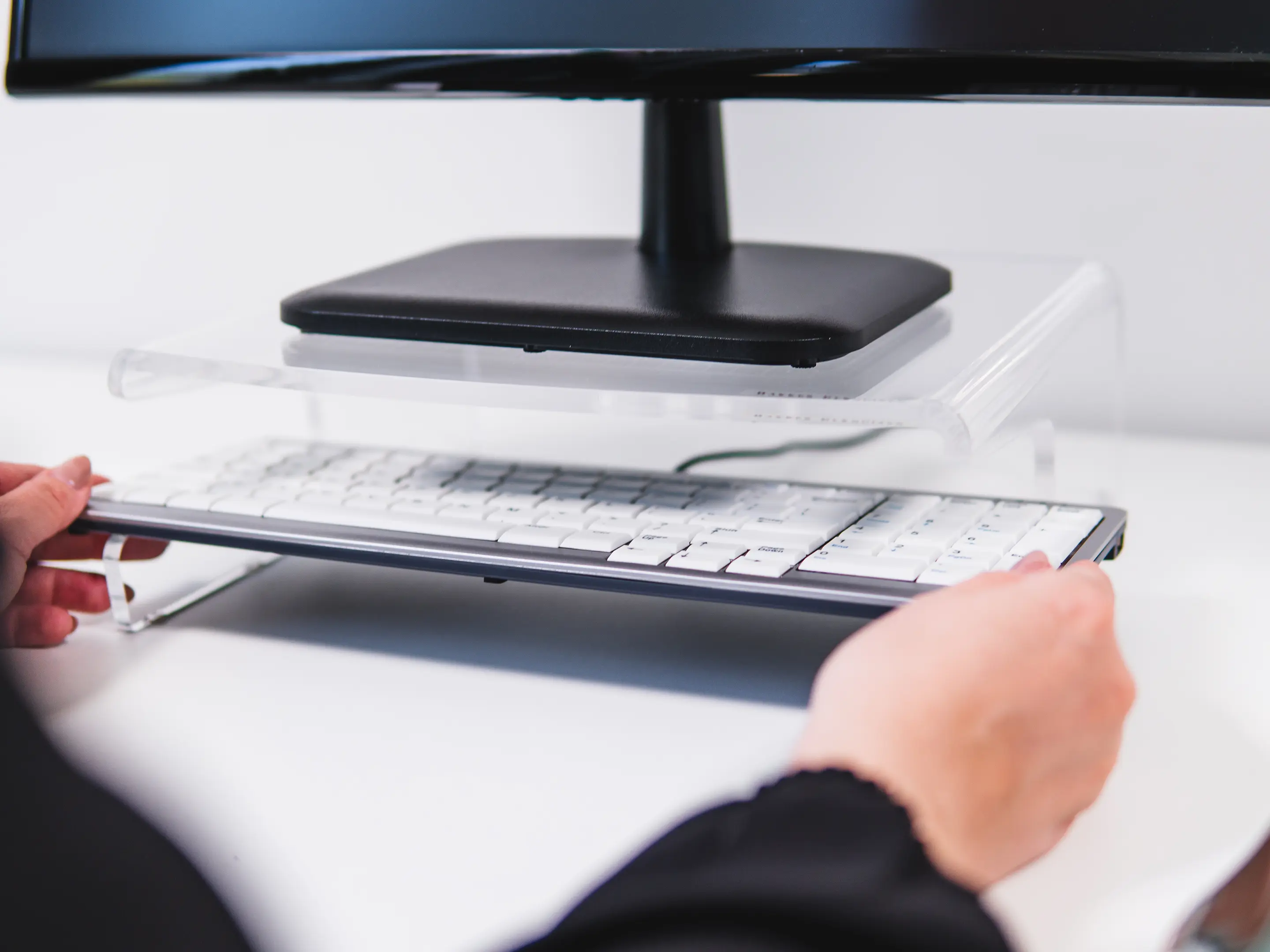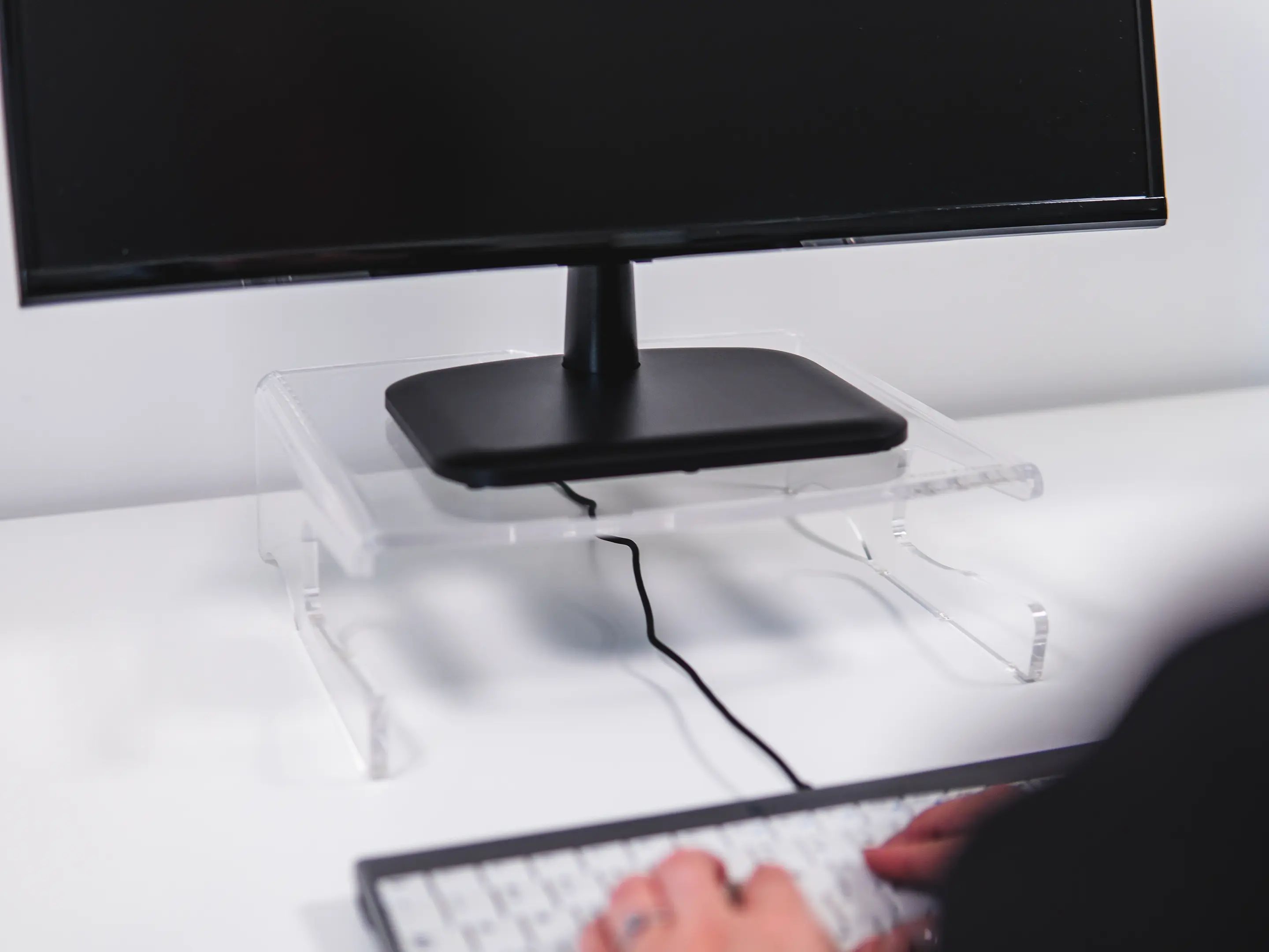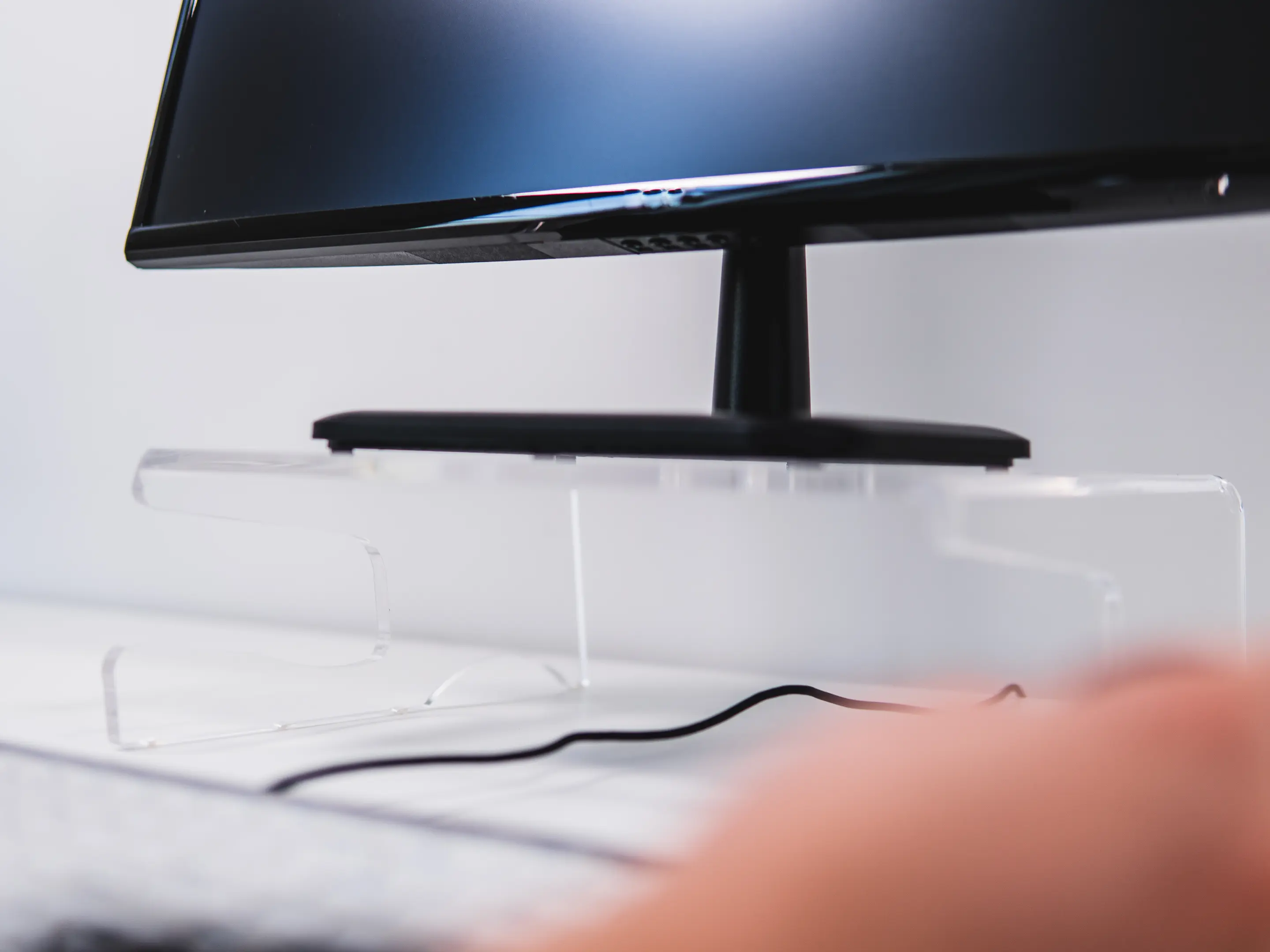 Een ergonomische monitorstandaard van transparant acrylaat. Verhoogt het scherm 105 mm voor een gezonde houding, biedt een stabiel oppervlak tot 10 kg, creëert extra opbergruimte en heeft geïntegreerd kabelbeheer.