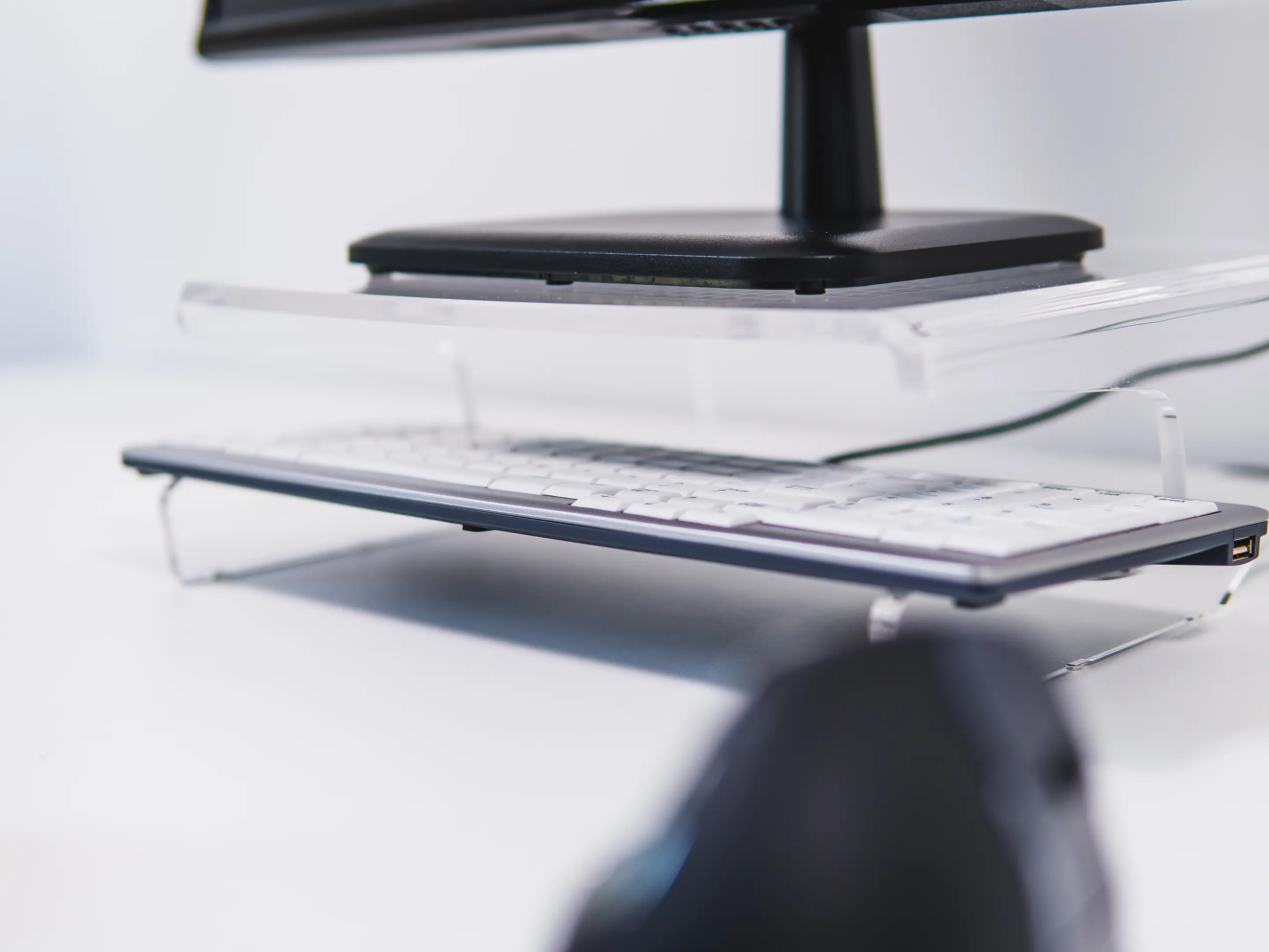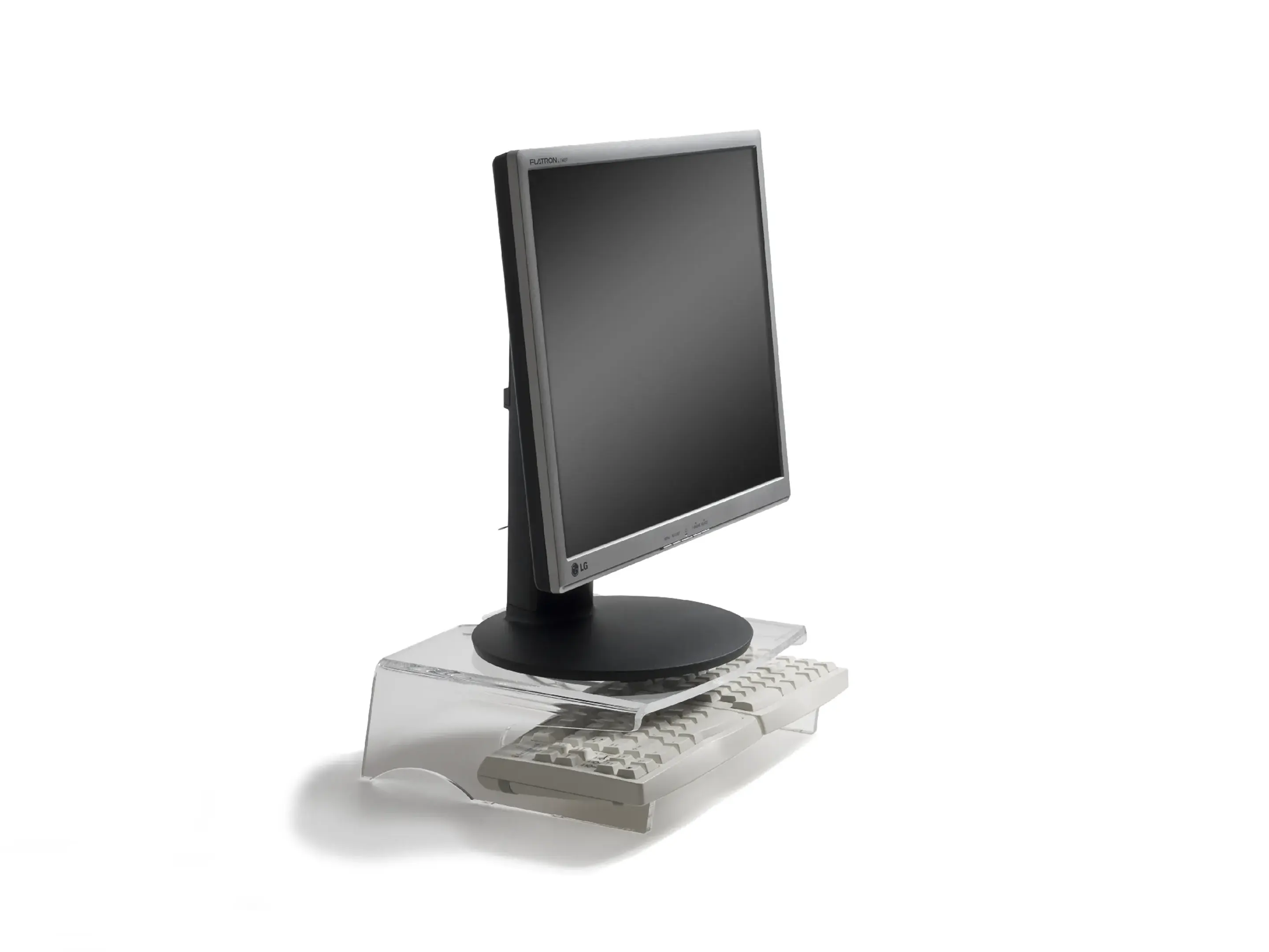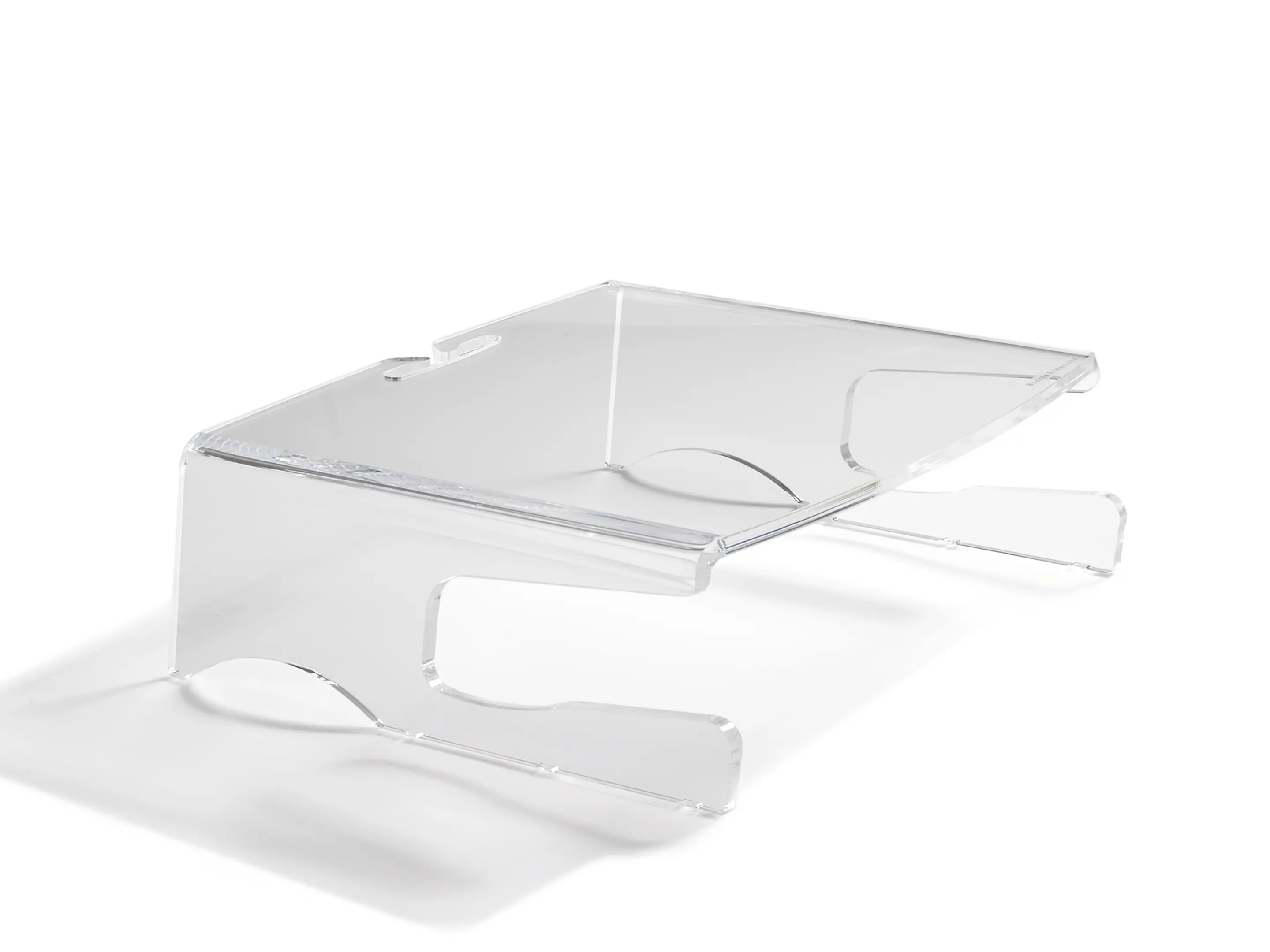 Een ergonomische monitorstandaard van transparant acrylaat. Verhoogt het scherm 105 mm voor een gezonde houding, biedt een stabiel oppervlak tot 10 kg, creëert extra opbergruimte en heeft geïntegreerd kabelbeheer.