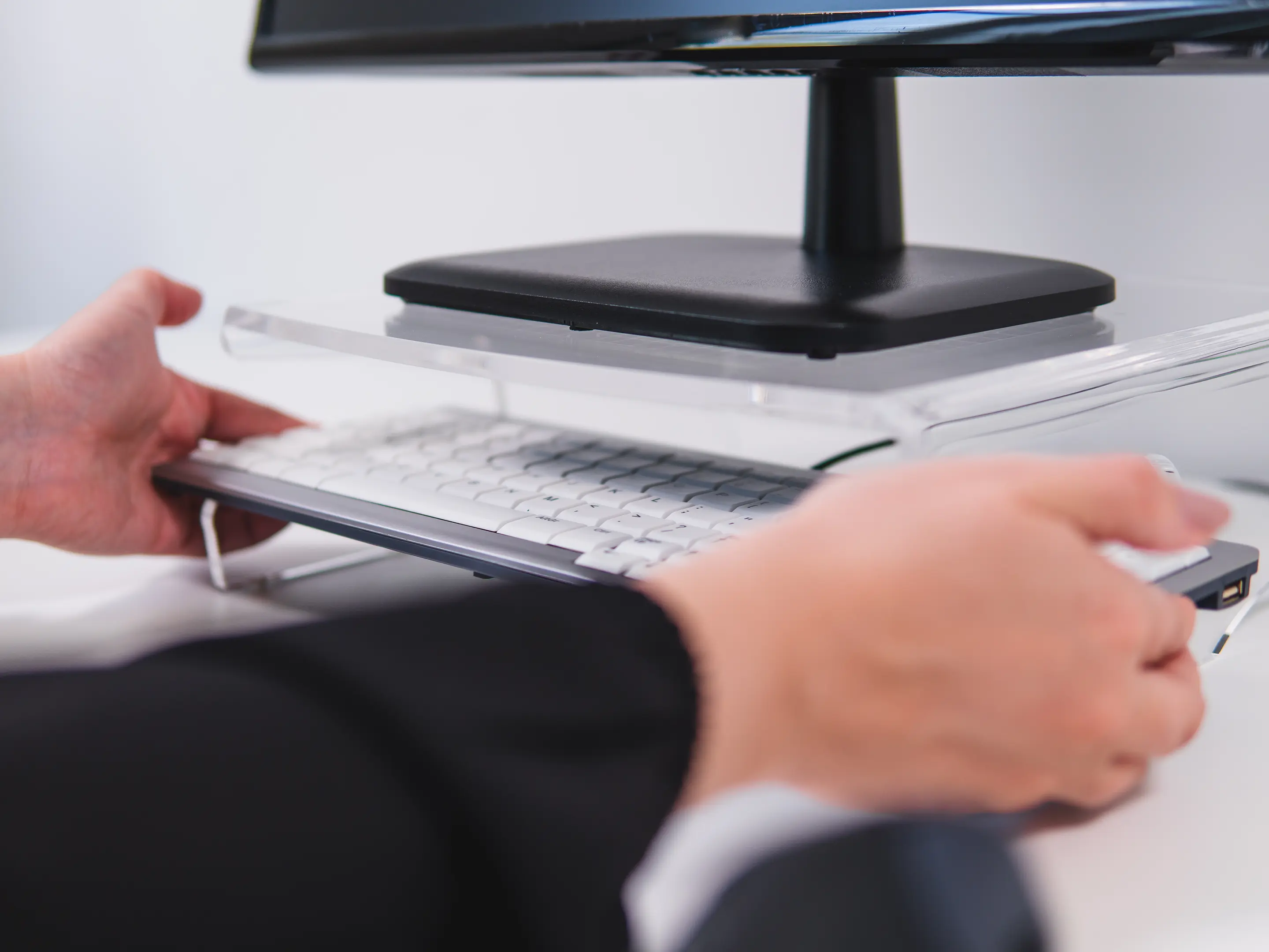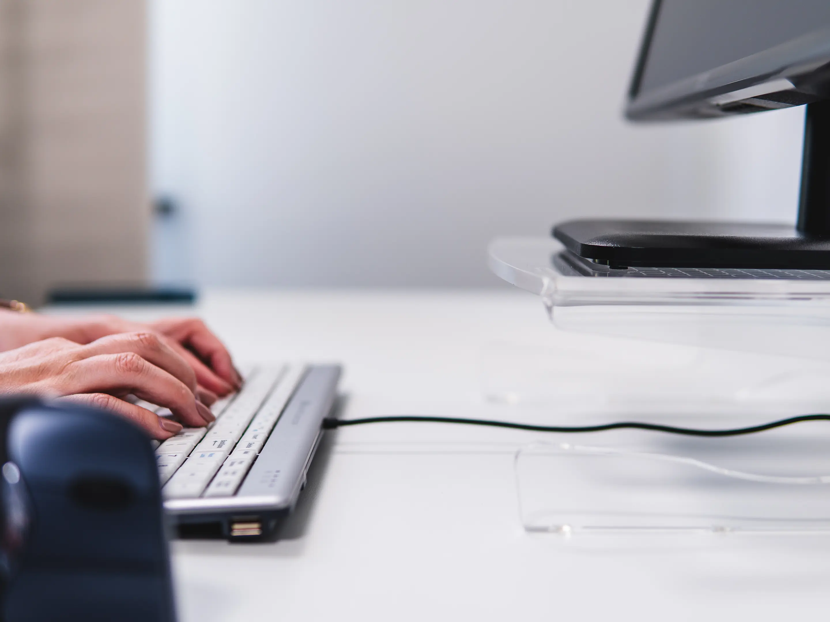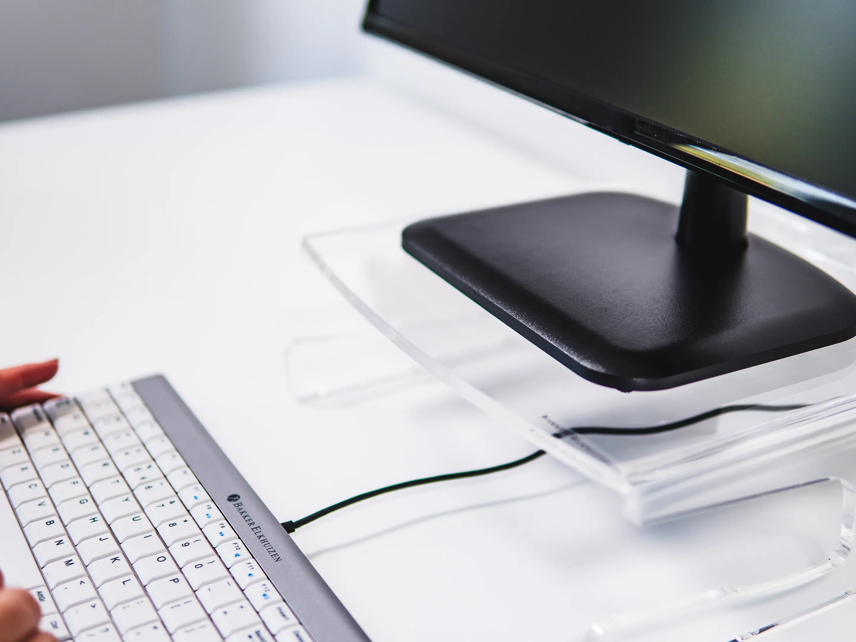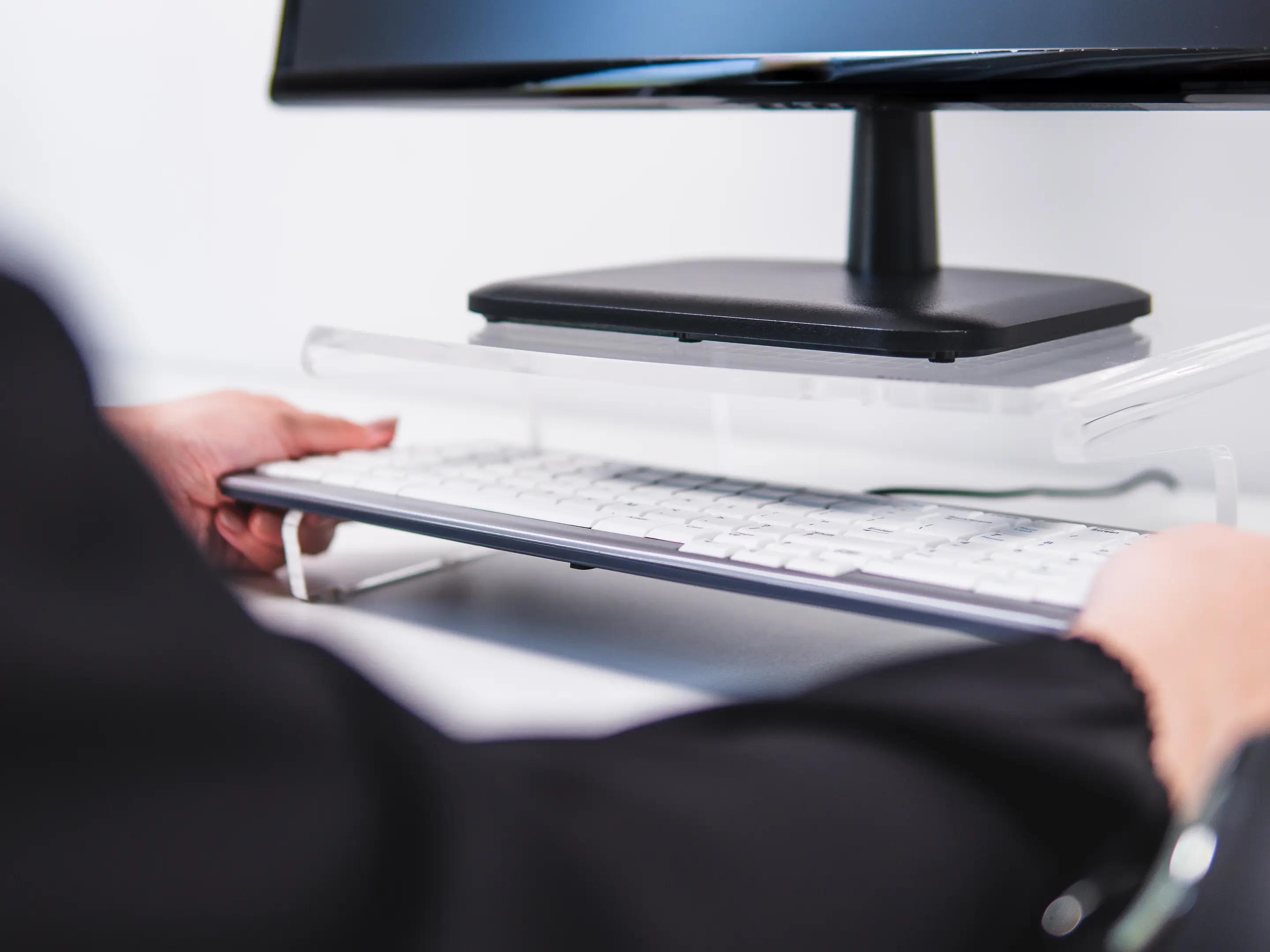 Een ergonomische monitorstandaard van transparant acrylaat. Verhoogt het scherm 105 mm voor een gezonde houding, biedt een stabiel oppervlak tot 10 kg, creëert extra opbergruimte en heeft geïntegreerd kabelbeheer.