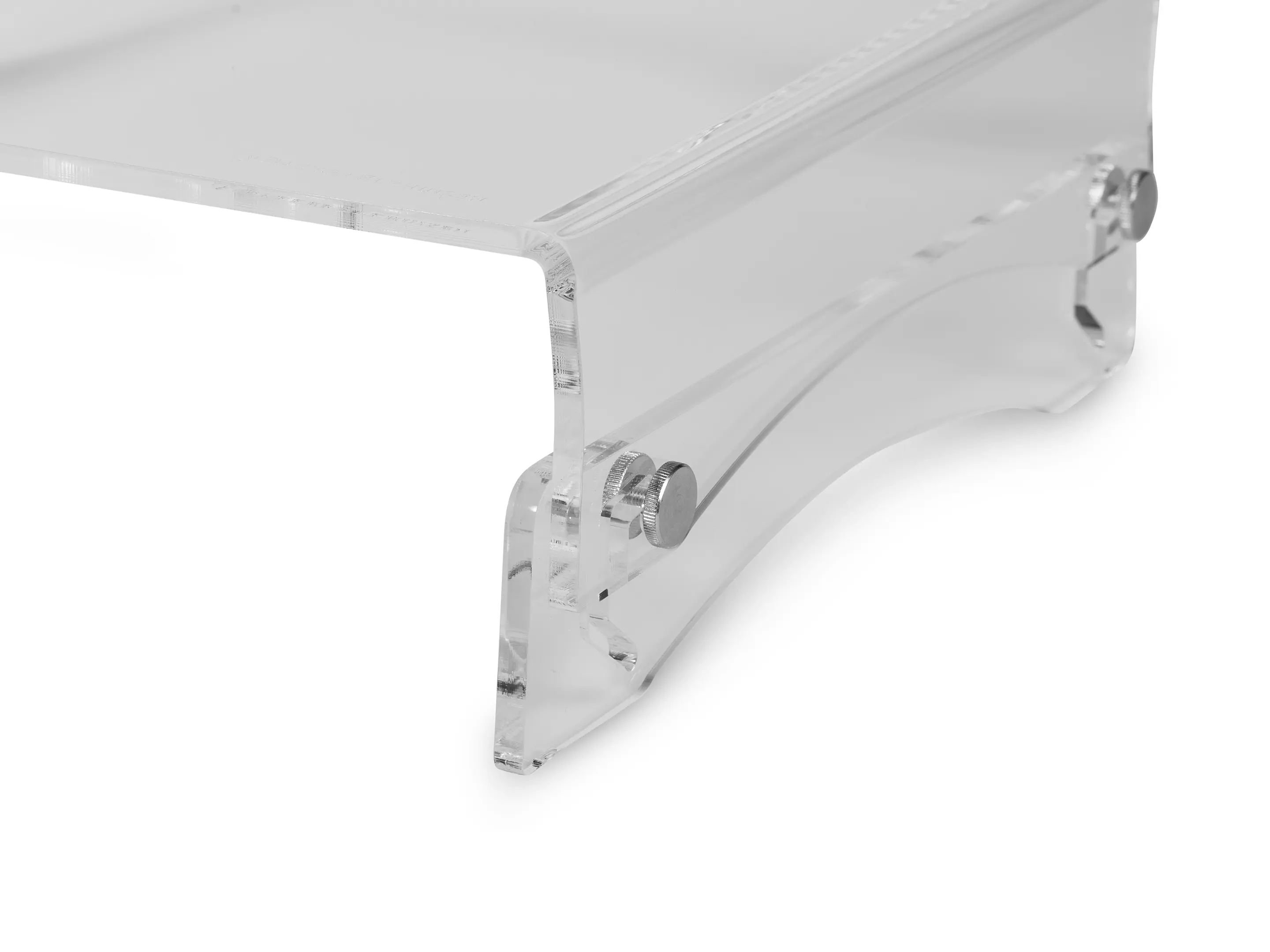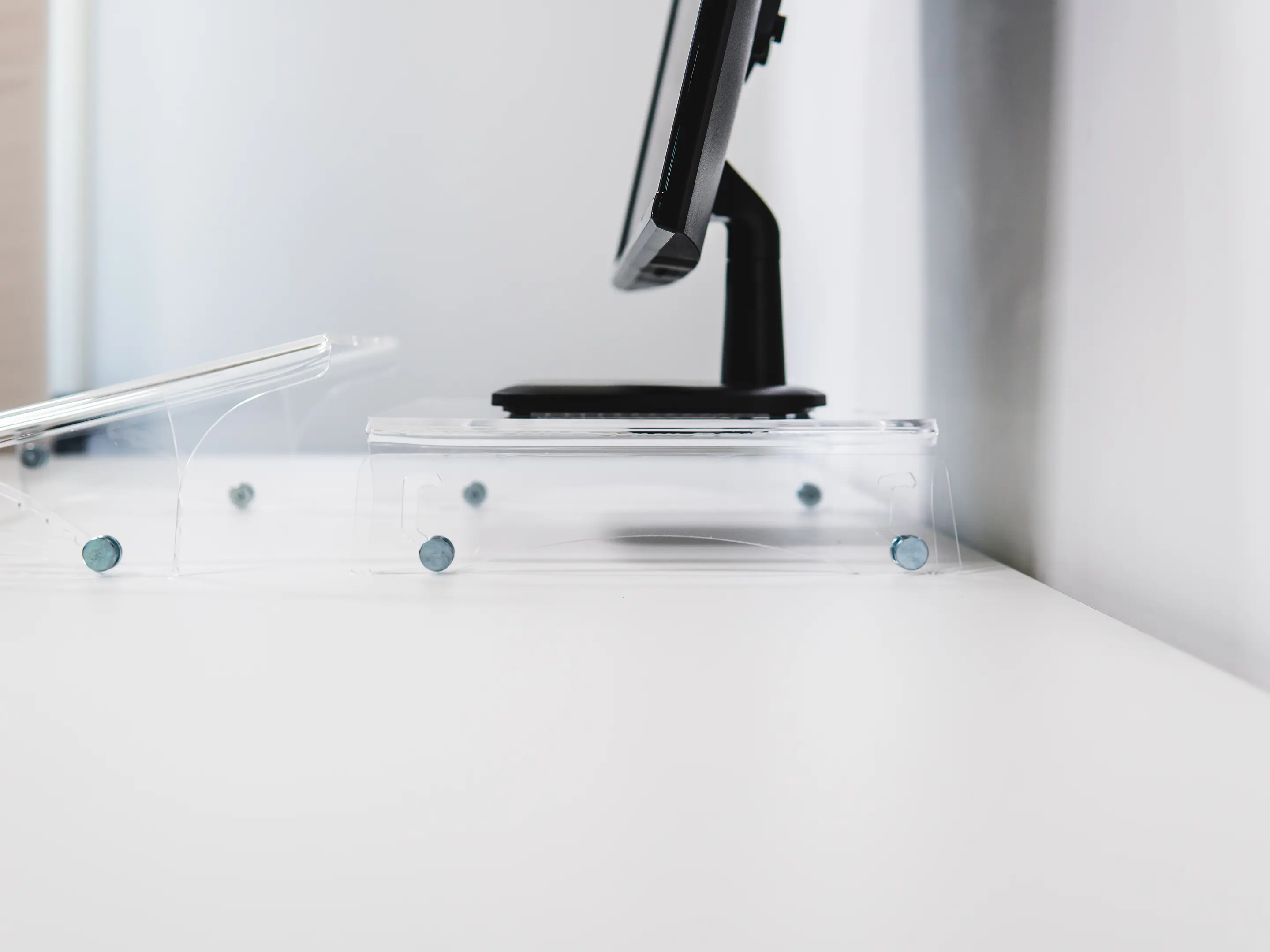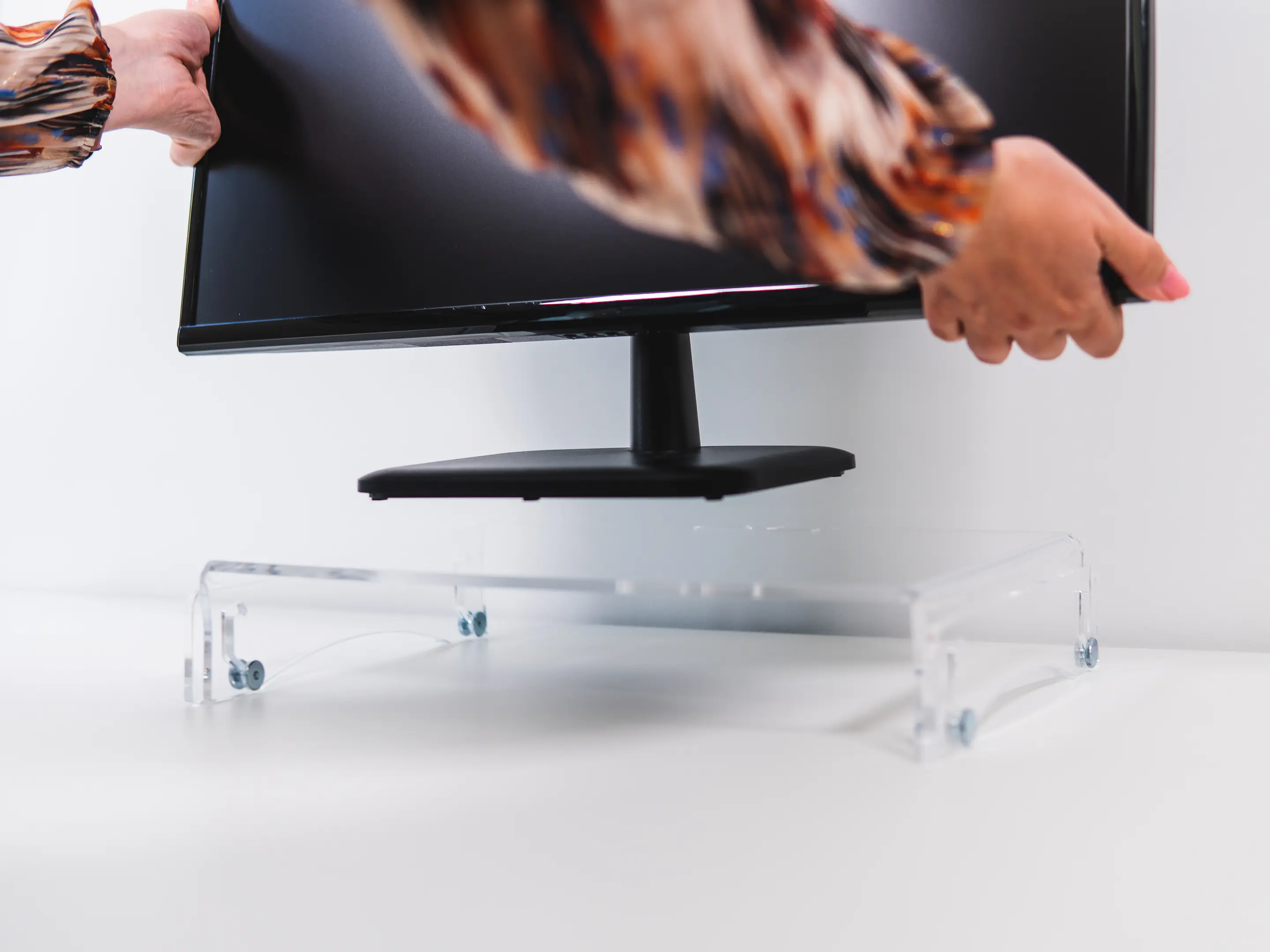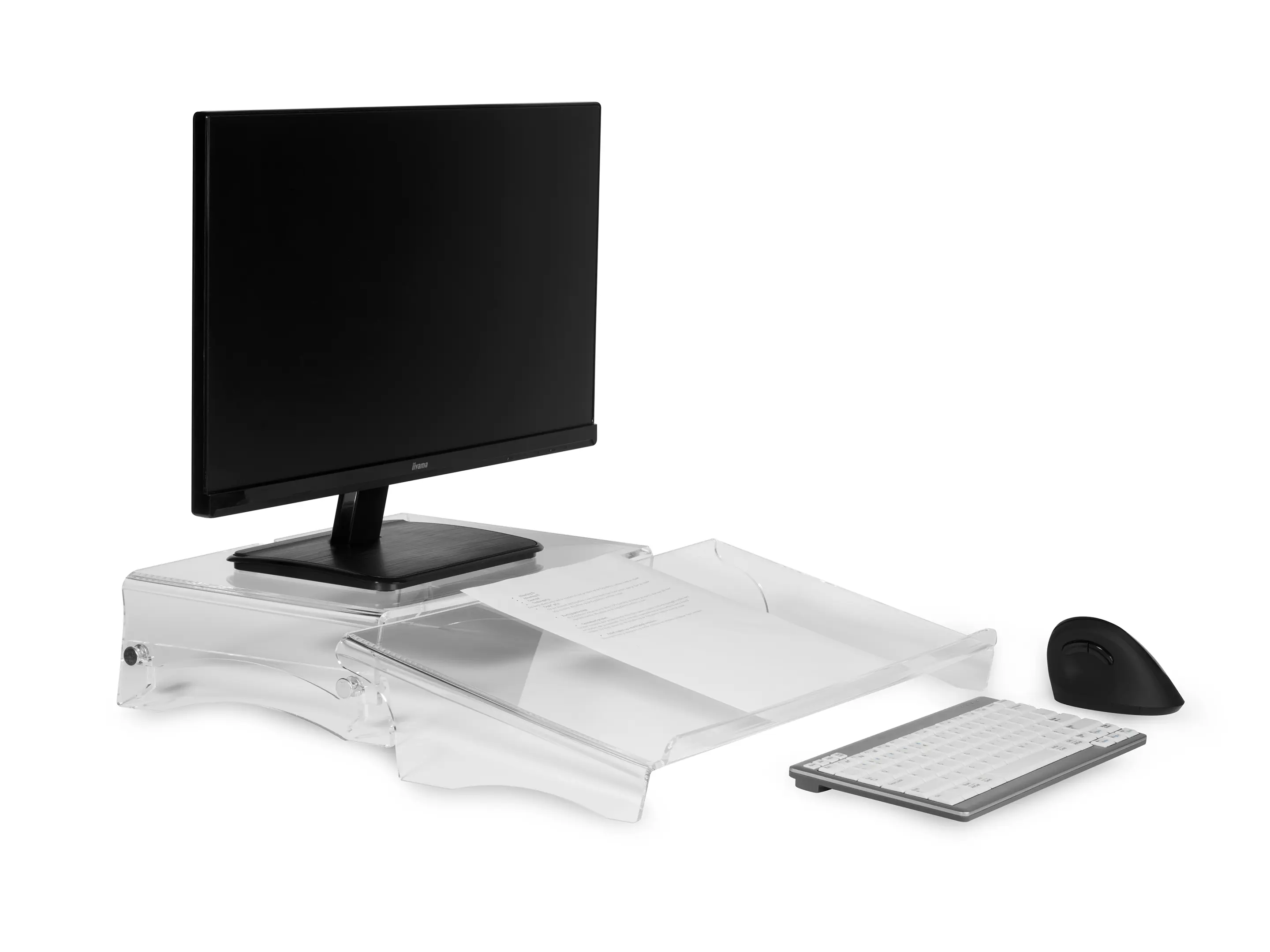 Een in hoogte verstelbare monitorstandaard van transparant acryl. Met twee hoogtes (75 en 105 mm) zorgt hij voor een ergonomische werkhouding, stabiele opstelling tot 10 kg, extra bureauruimte en netjes kabelbeheer.