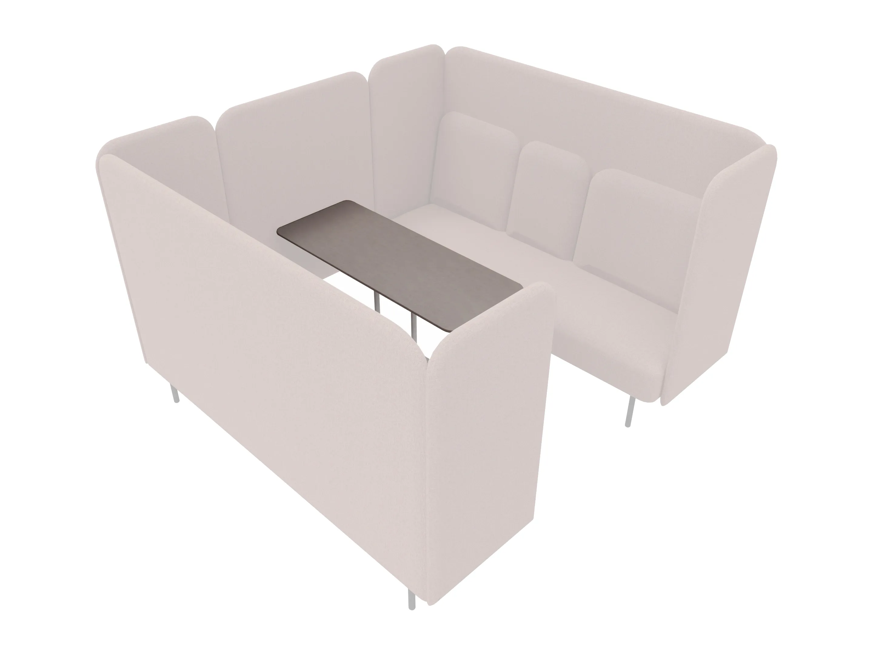 Volledig gestoffeerde POD met 2x 3-zits bank tegenover elkaar met extra hoge akoestische ombouw aan de zijkanten en achterkant op een 8-poots onderstel. 2300 x 780 x 1450mm (B x D x H). Excl. tafel. Deze moet los worden bijbesteld.