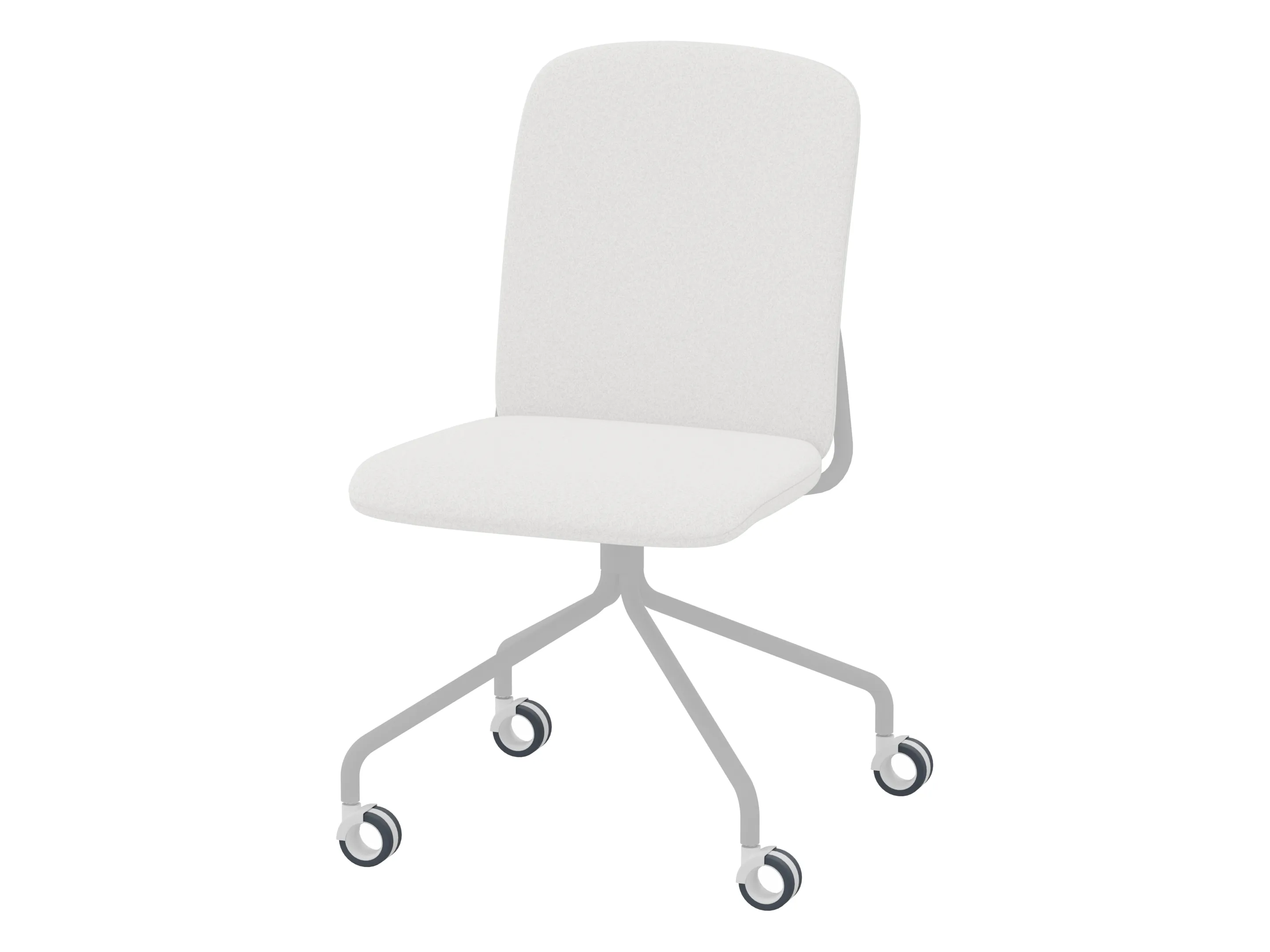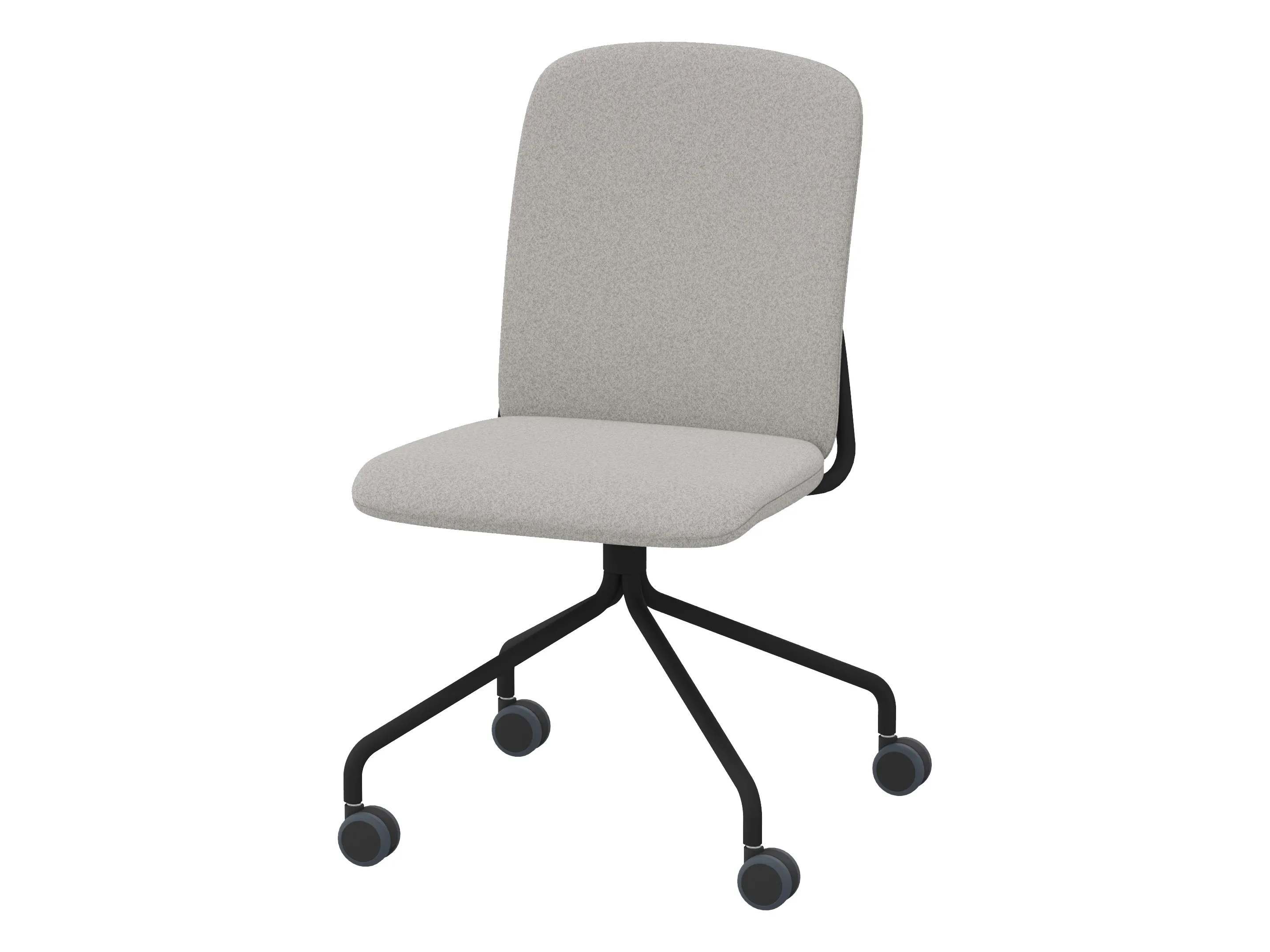 Bijzetstoel met een fineer rugleuning en gestoffeerde zitting op een 4-teens kruis op wielen. Excl. armleuningen, draaibaar. Afmeting: 555 x 630 x 920mm. Zithoogte 470mm.