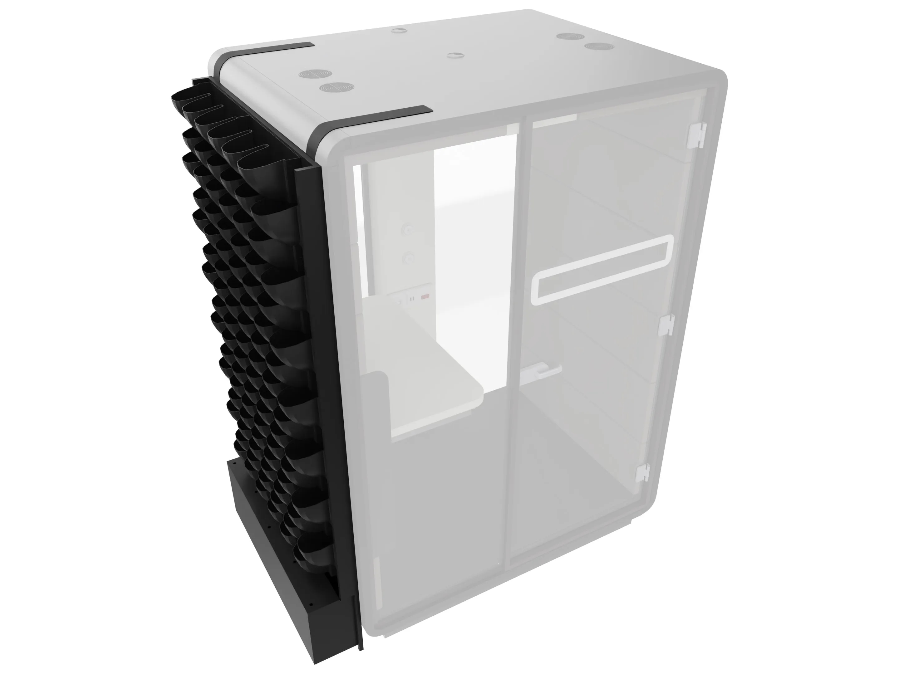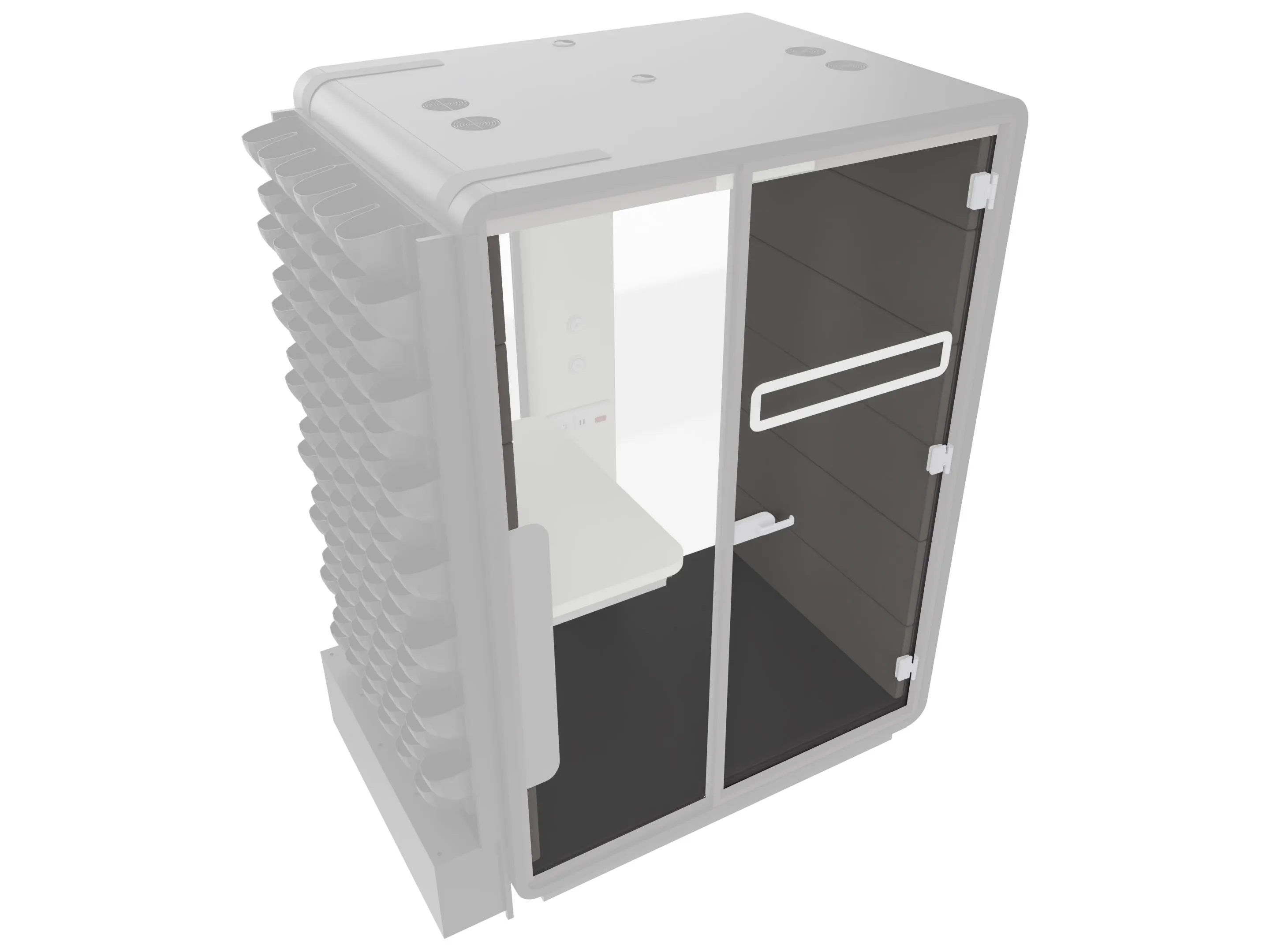 Akoestische werkmodule: afmeting: 1600 x 1200 x 2300mm (BxDxH). Automatische ventilatie, airflow: 3 fans - 47m3/h / 293sec. Incl. tapijtvloer, LED dimmerlamp, stopcontact, individuele licht- & ventilatieknoppen, hoogte instelbaar tafelblad, stelvoetjes.