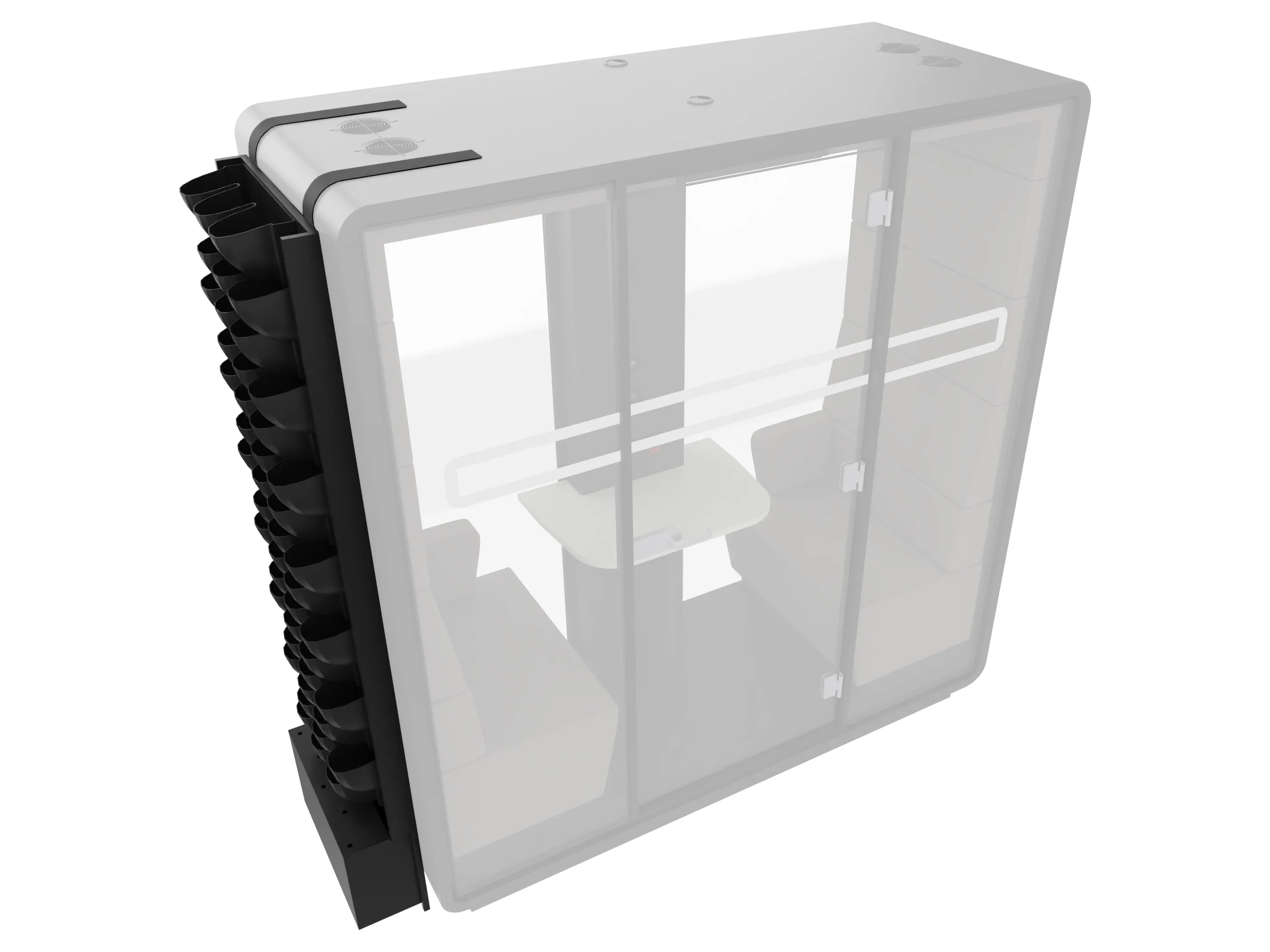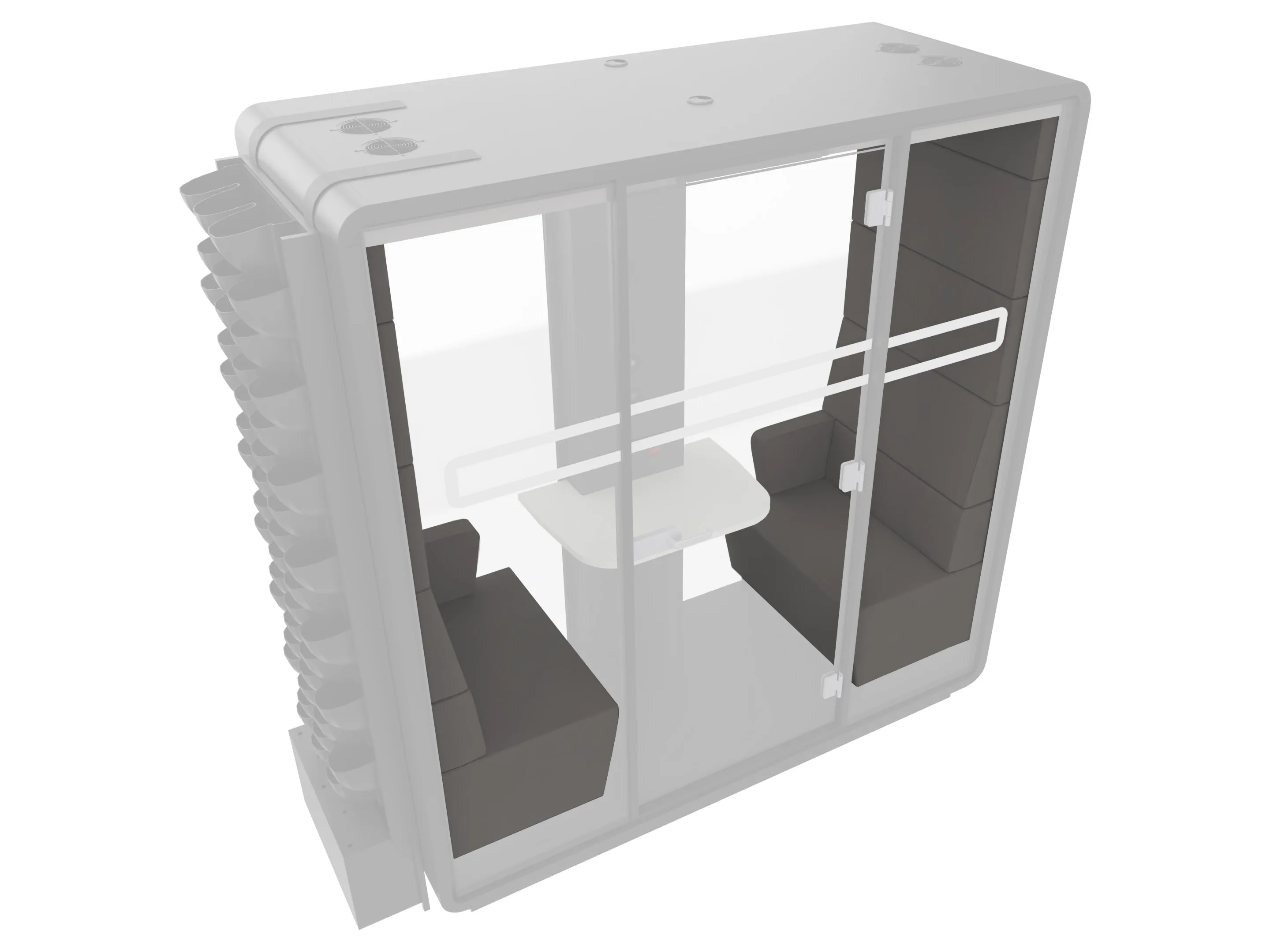 Akoestische vergadermodule: afmeting: 2150 x 900 x 2300mm (BxDxH). Automatische ventilatie, airflow: 4 fans - 47m3/h / 194sec. Incl. tapijtvloer, LED dimmerlamp, stopcontact, individuele licht- & ventilatieknoppen, tafelblad en 2 zitbanken, stelvoetjes.