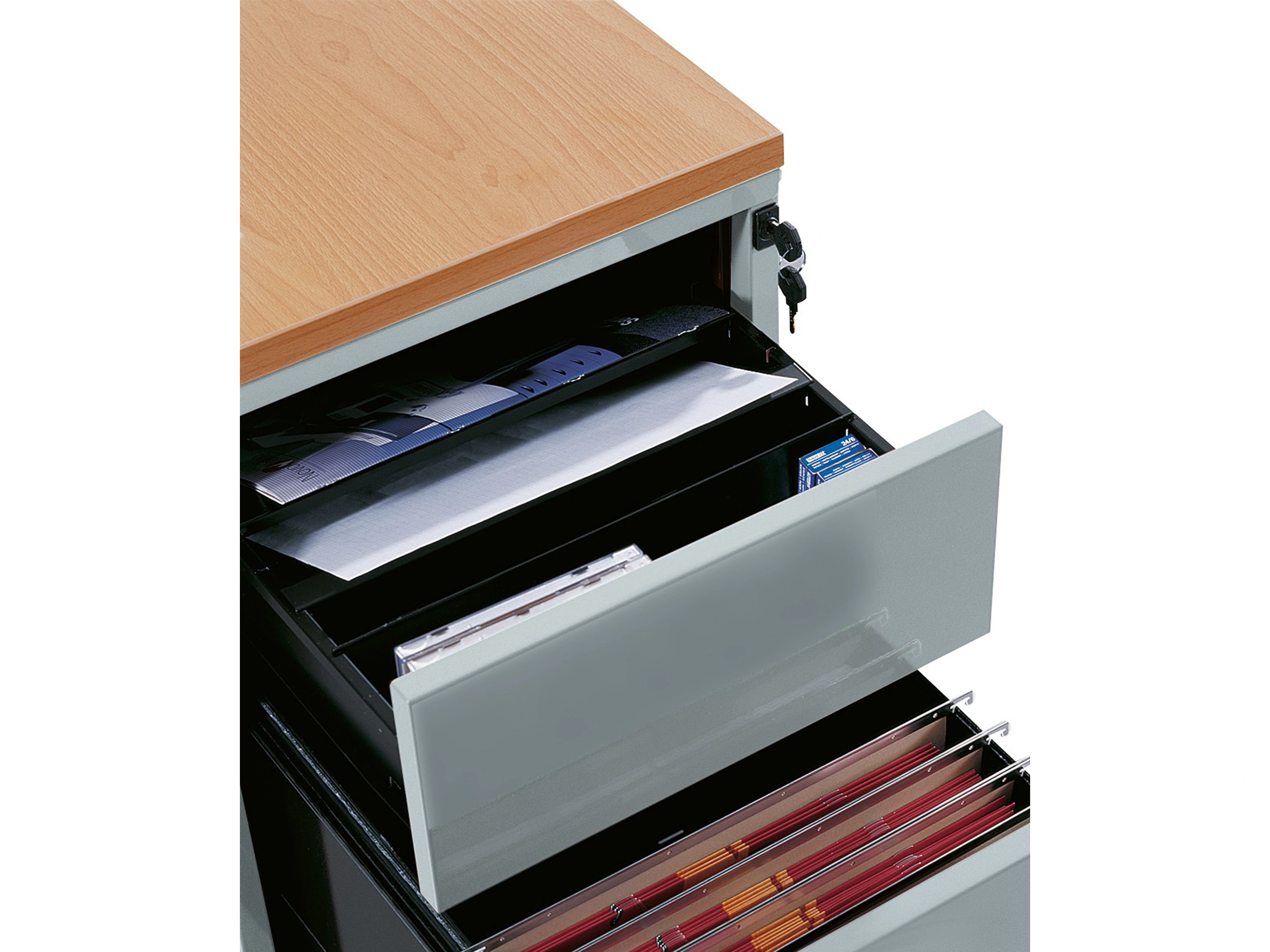 Verrijdbaar 42x60x56,5cm (BxDxH) ladeblok met een hangmaplade, een lade en een pennenbak.