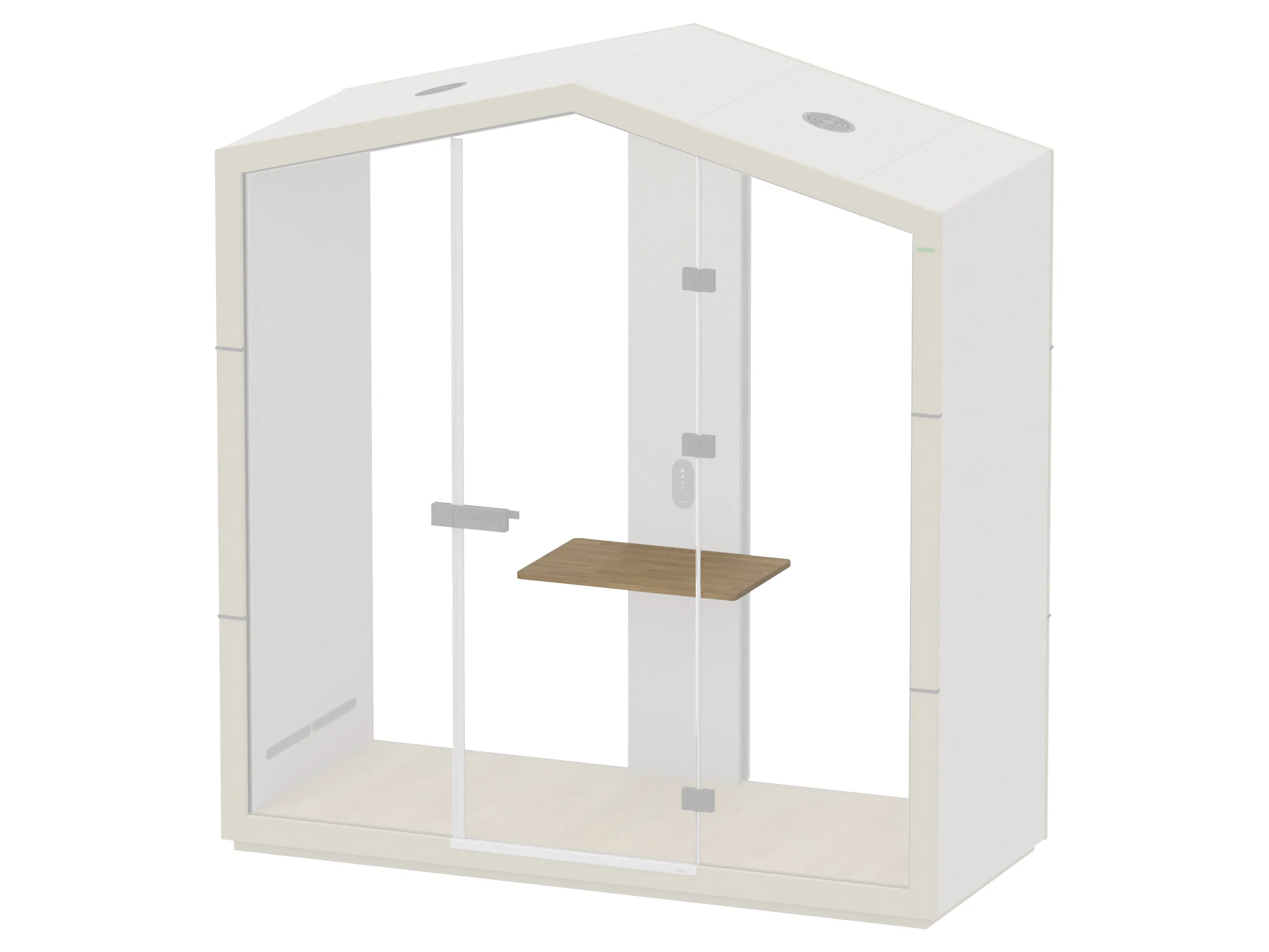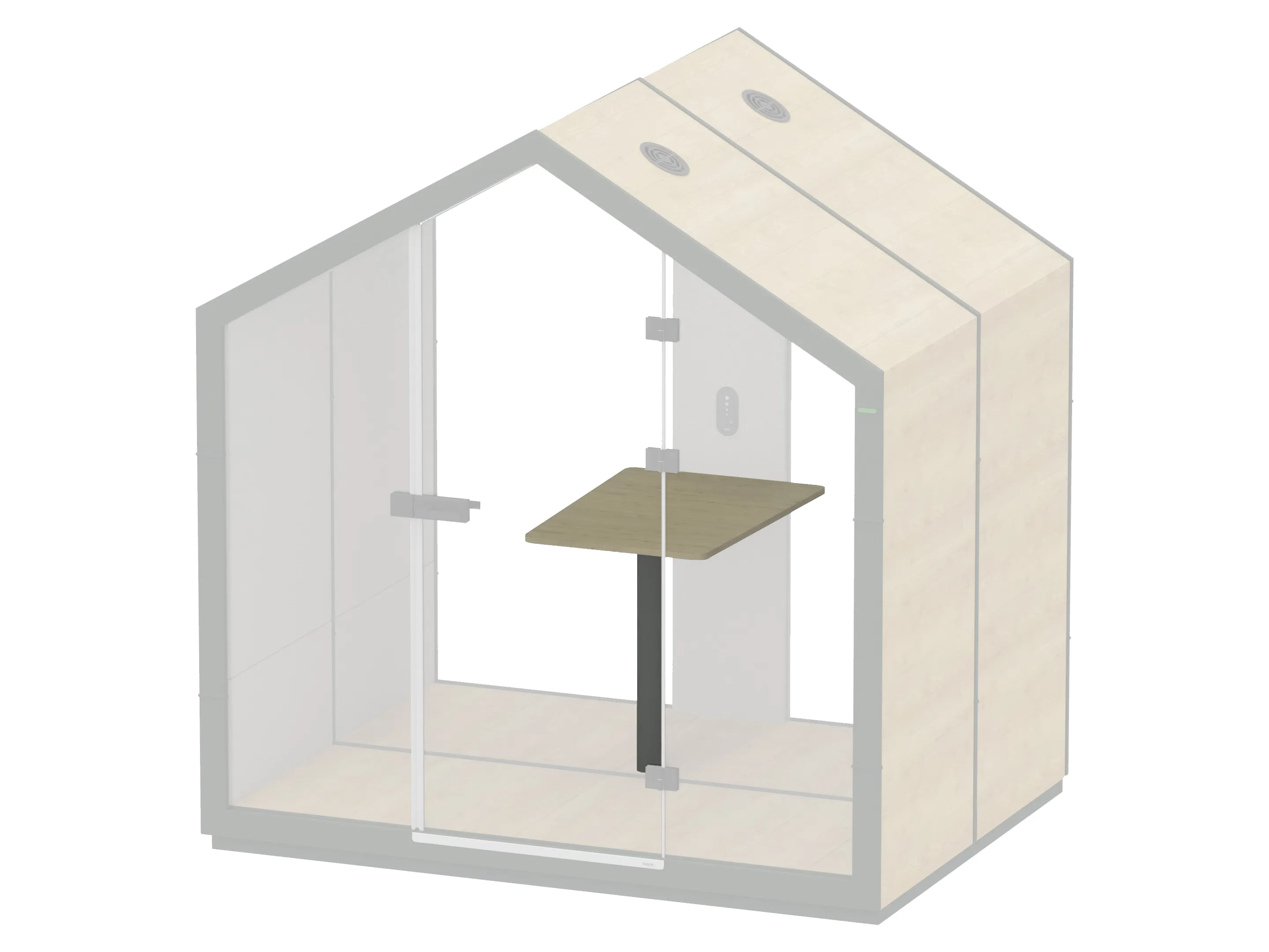 Open element voor 1 persoon, zonder zitplek met glazen deur en achterwand, werkblad en 1 LED lamp. De ombouw is in de vorm van een huis en is volledig gestoffeerd en staat op transportwielen. Afmeting: 1000 x 2425 x 1000mm (B x H x D).
