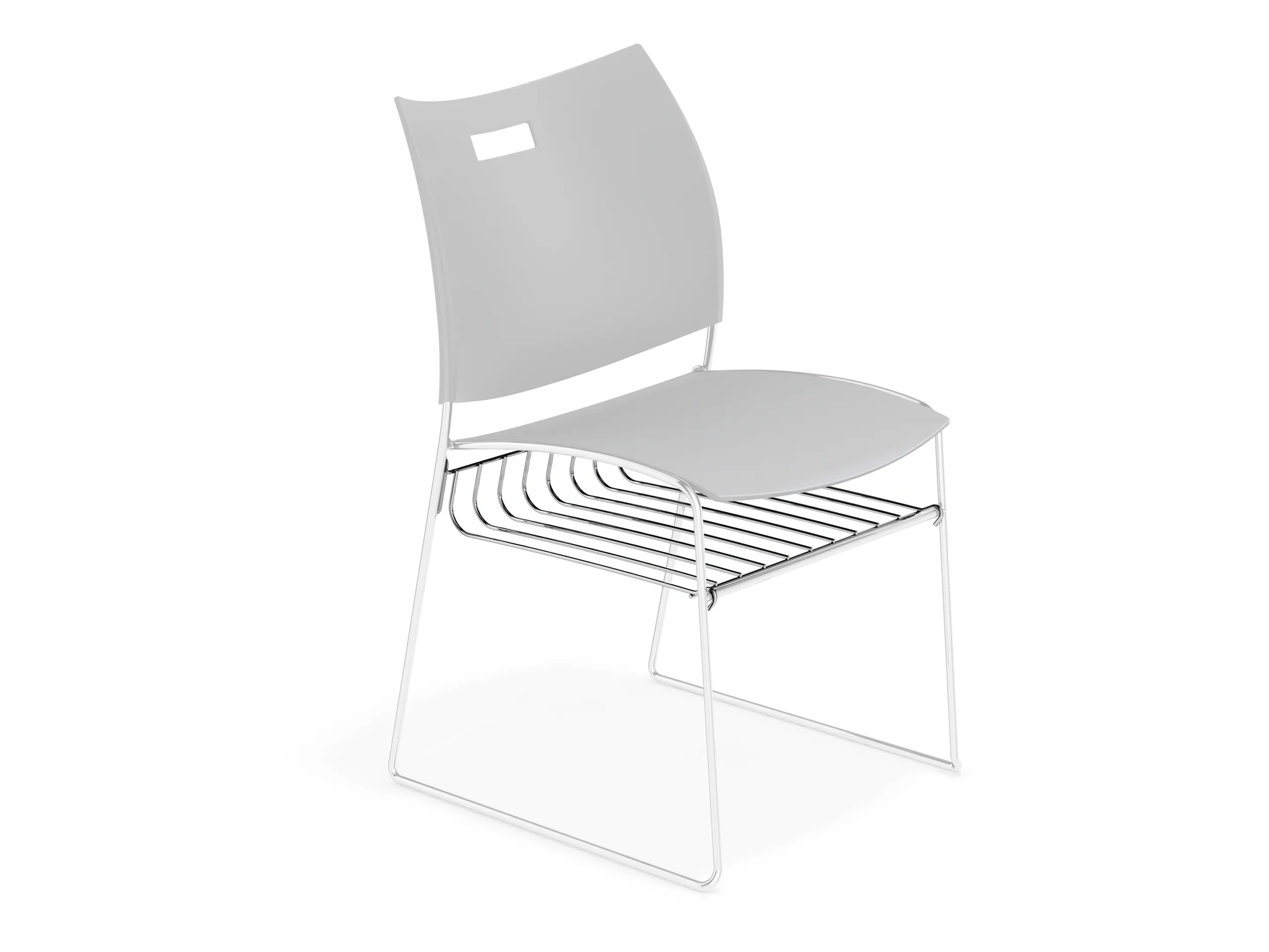 Stoel met sledeframe en met een ongestoffeerde rug en een gestoffeerde zitting. Stapelbaar tot 25 stoelen op transportwagen, 6 stuks vrijstaand.