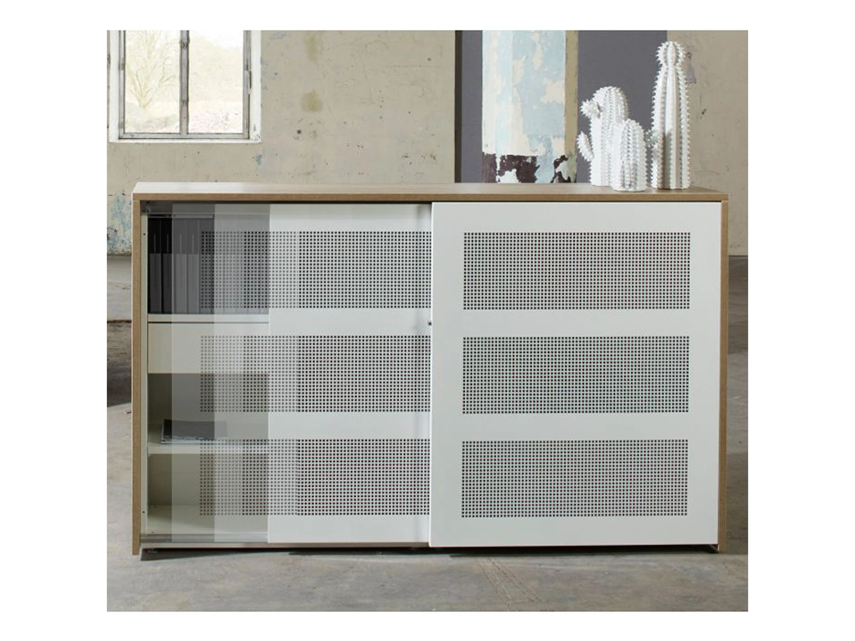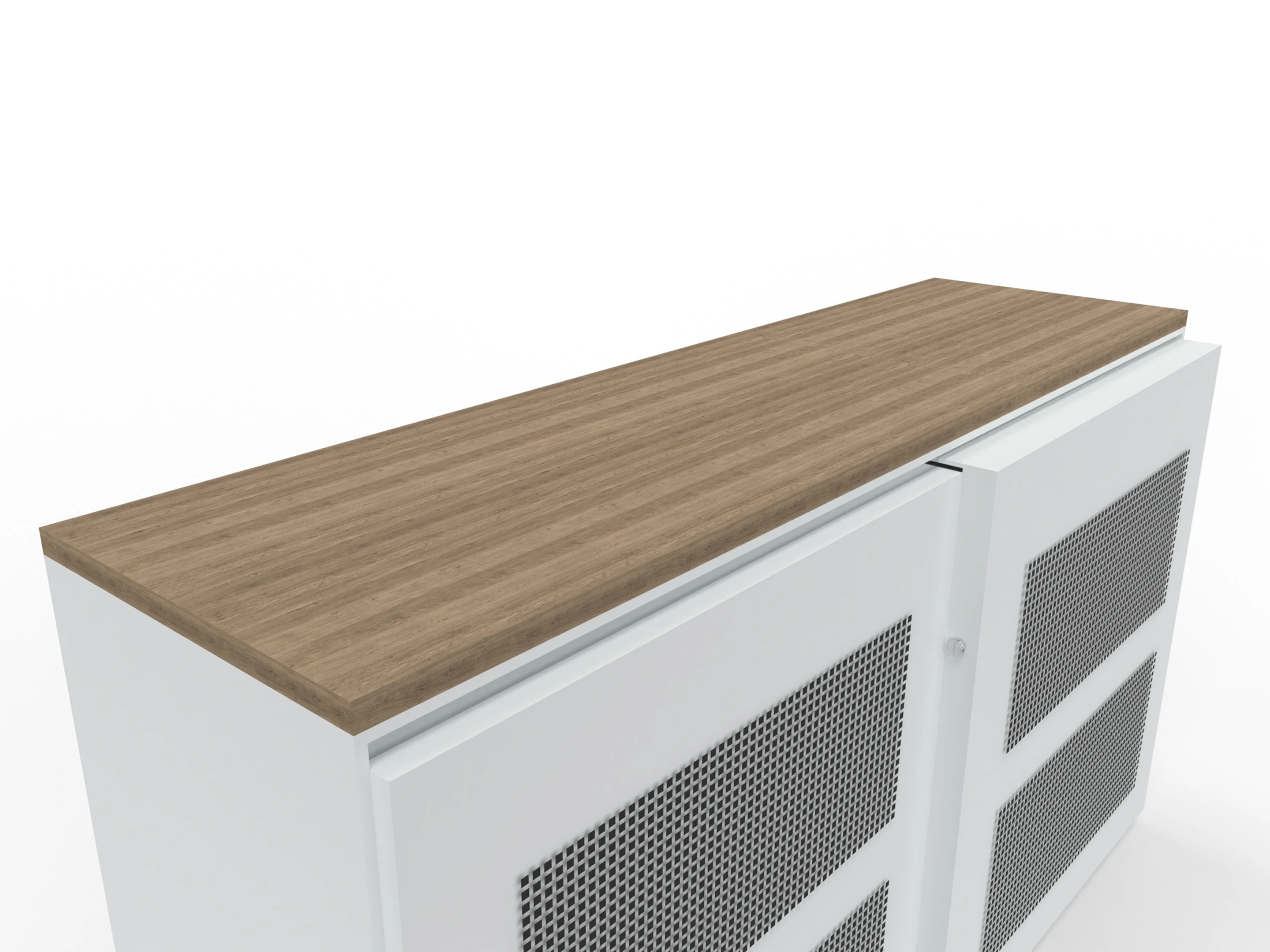 83cm hoog en 200cm breed schuifdeurkast voorzien van deuren met akoestische ECO-screen. Let op, geleverd zonder topblad, deze moet los besteld worden!