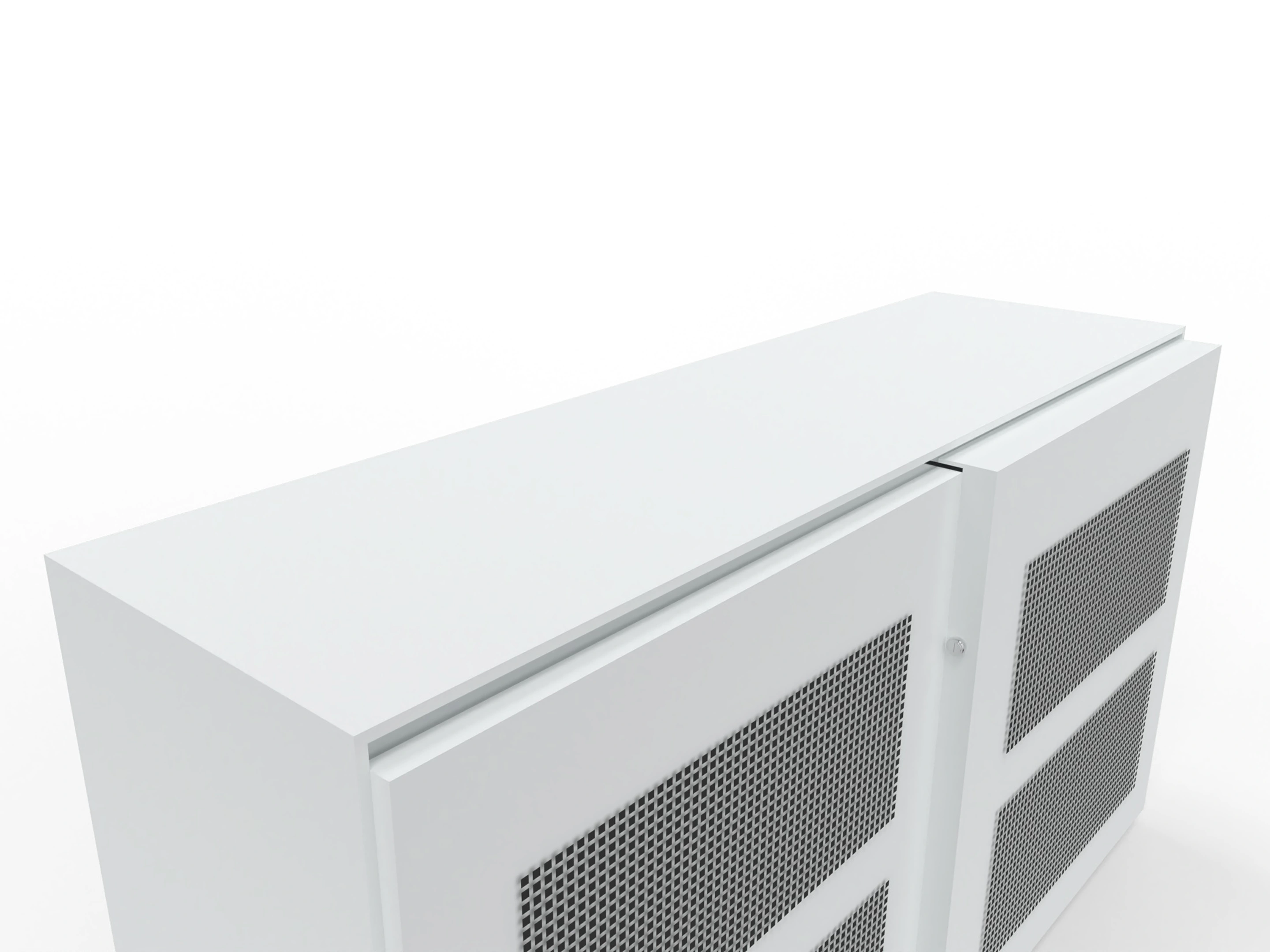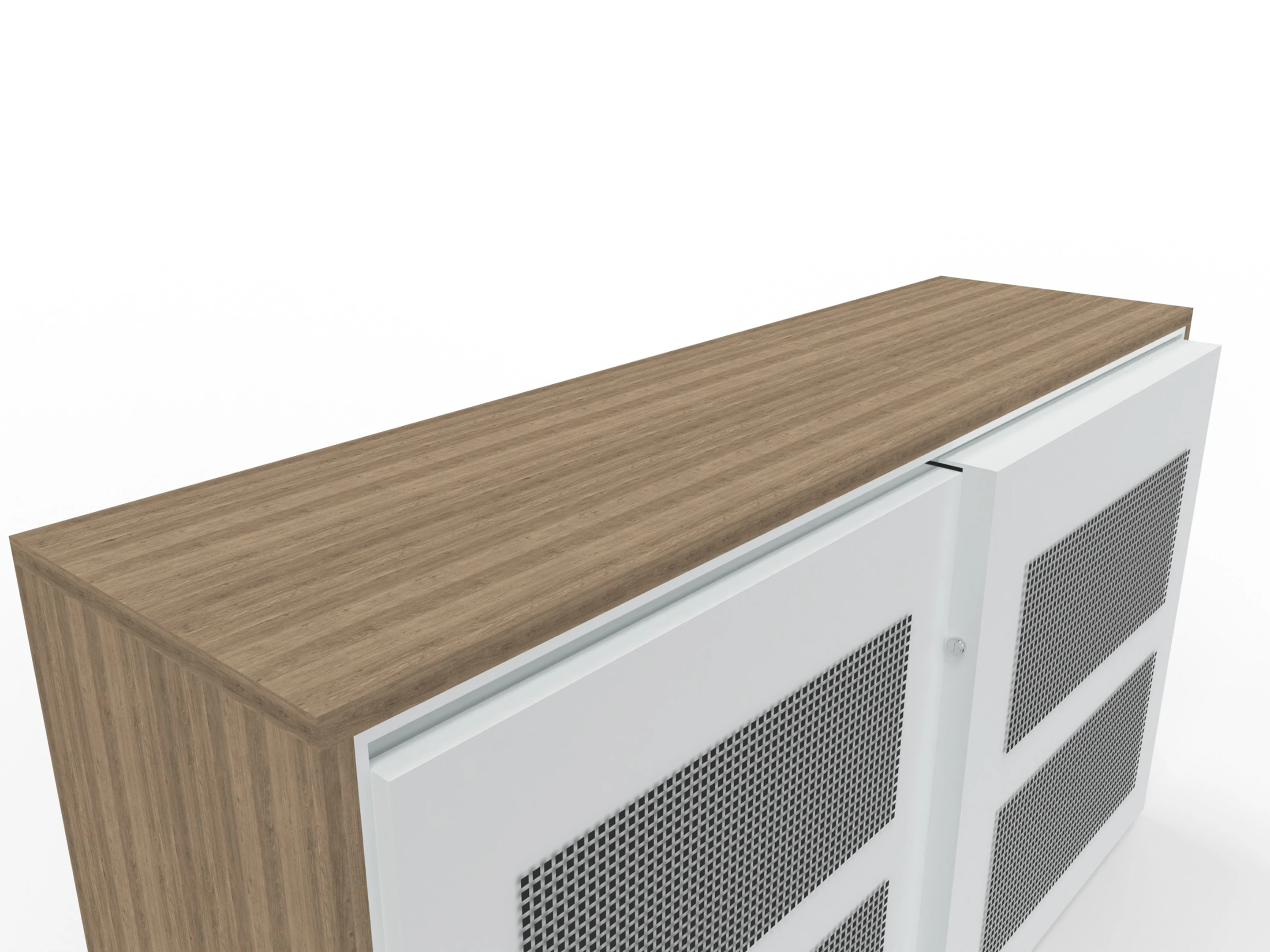 123cm hoog en 200cm breed schuifdeurkast voorzien van deuren met akoestische ECO-screen. Let op, geleverd zonder topblad, deze moet los besteld worden!
