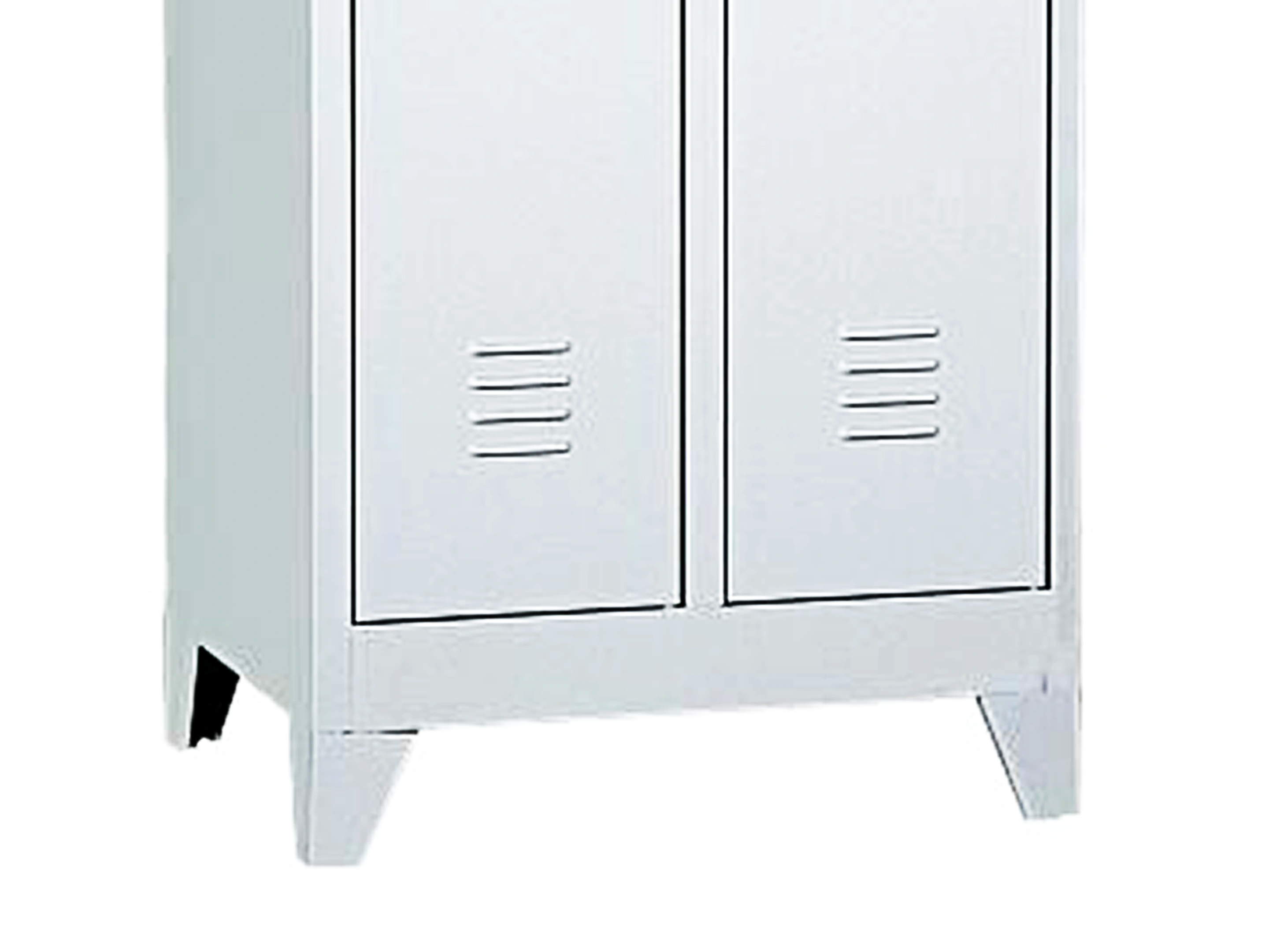 Garderobekast afsluitbaar met cilinderslot inclusief 2 sleutels, voorzien van kledingstang met haken en hoedenplank, met ventilatiesleuven en etikethouder, staand op sokkel