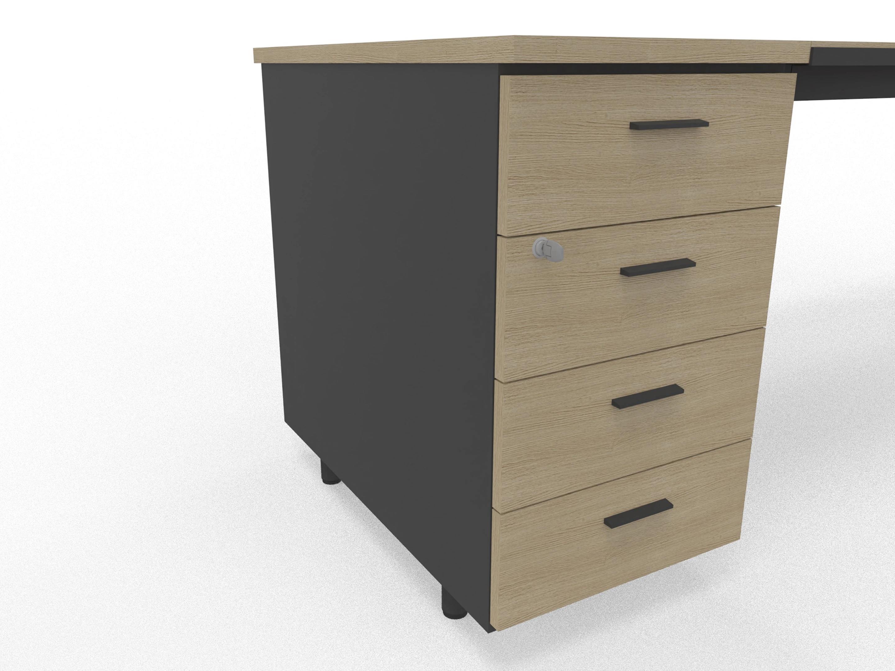 Hoekbureau (links) 180x170cm breed en 75cm hoog met ladenblok 3+1 PVC laden.