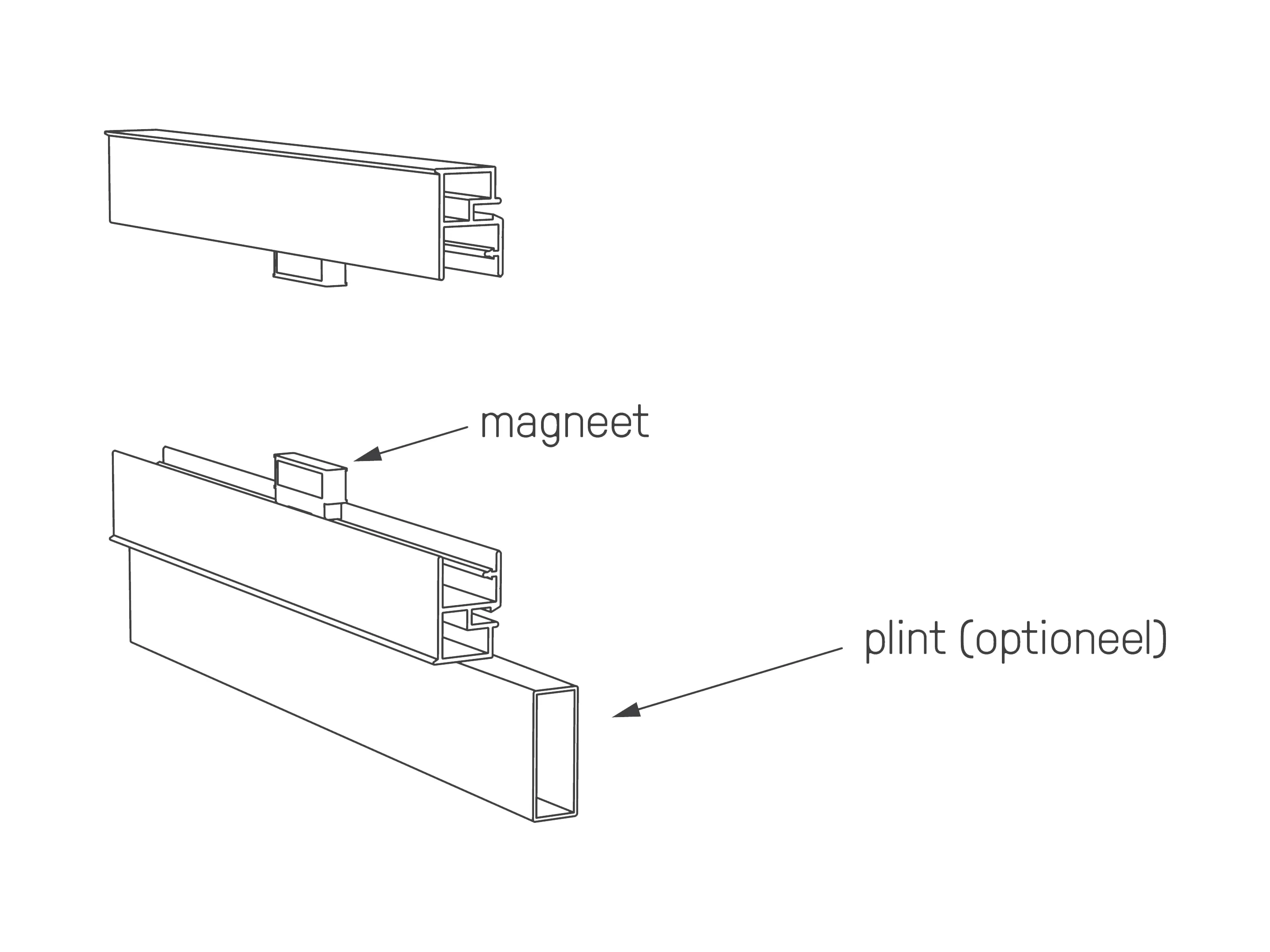 Set bestaat uit 2 delen, onderzijde is een L-vormige strip waar het paneel op rust (incl. magneet), bovenzijde is een losse strip met magneet.