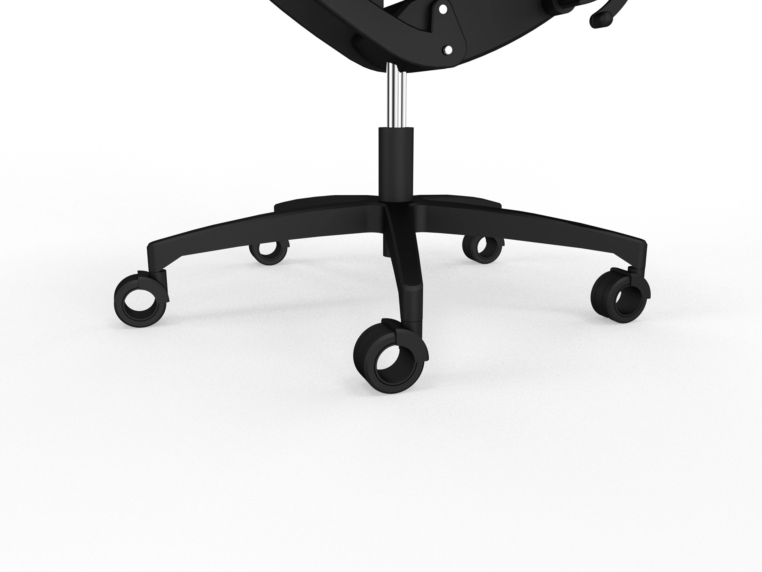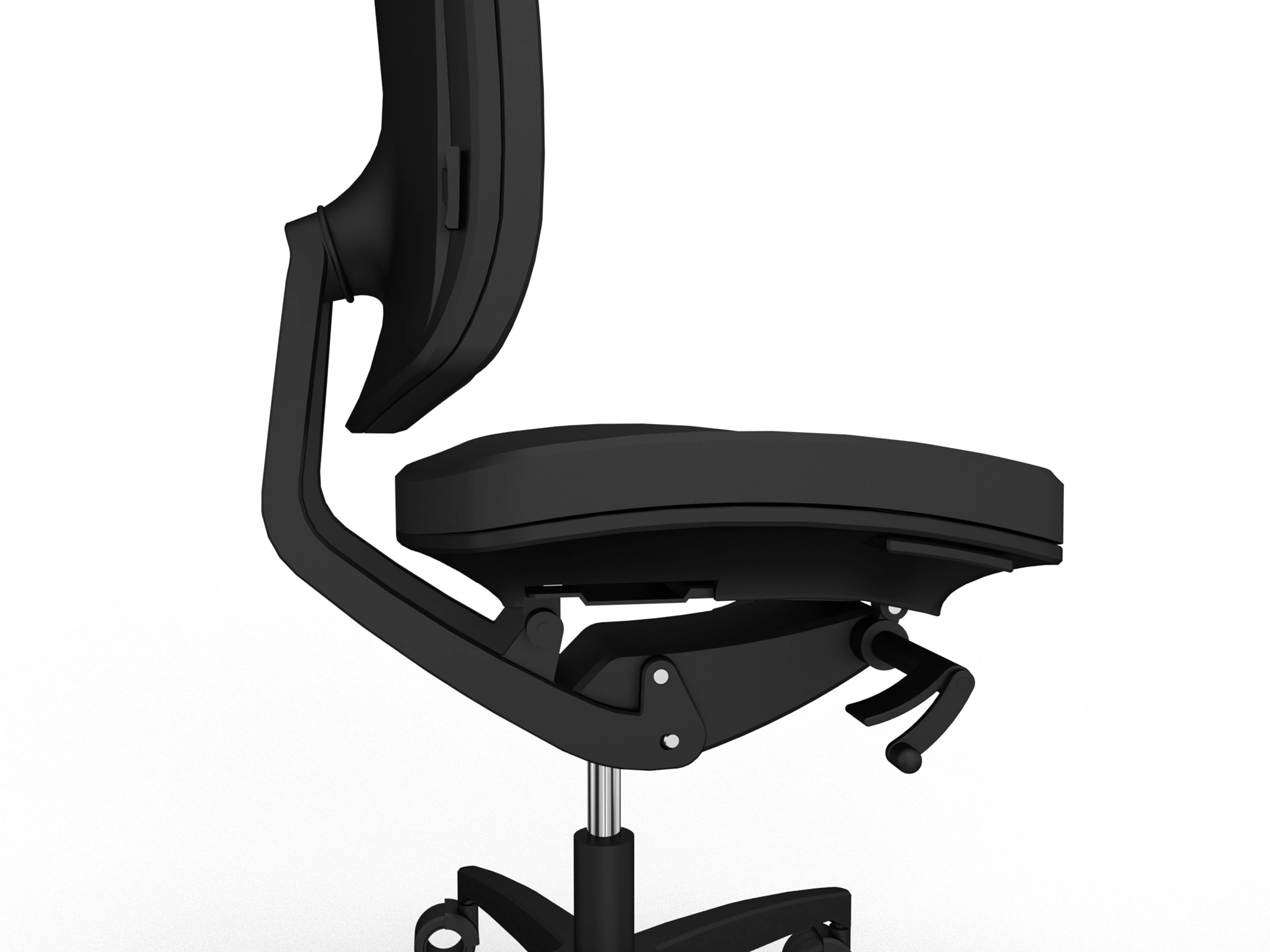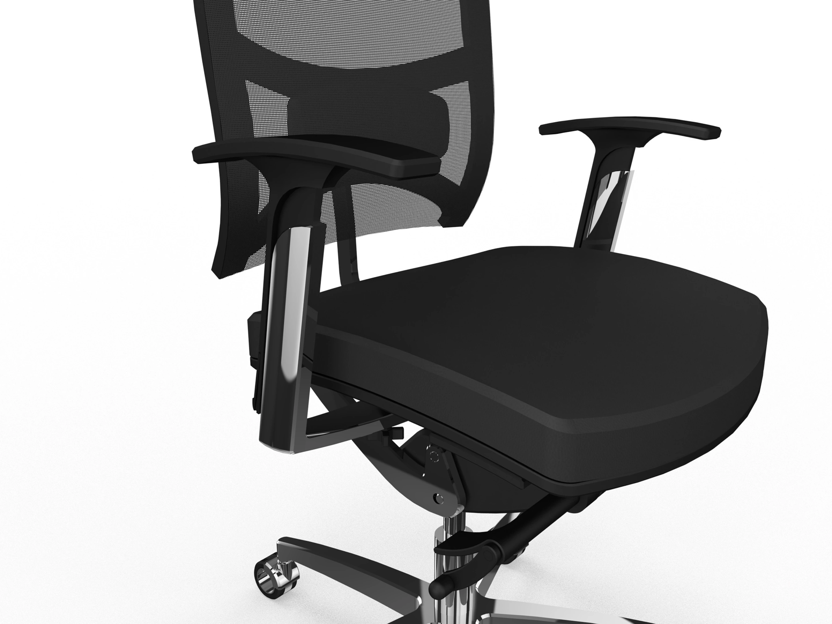 Bureaustoel zonder hoofdsteun, met dynamico synchroon mechanisme met 2 hendel-systeem, volledig gestoffeerde, verstelbare zitting en een mesh rug met anti-panic, voorzien van hoogte verstelbare lendensteun, op een 5-teens voetkruis met geremde wielen.