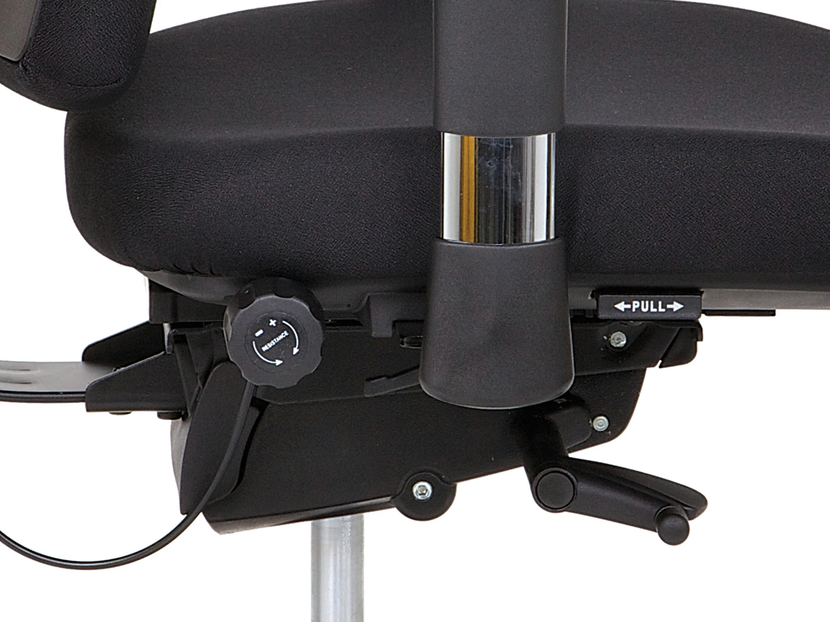 Mechaniek met traploos (slinger) gewichtsregeling, zitting met negatieve neig 3° en 0° en 0°, en 8° rughoekverstelling.