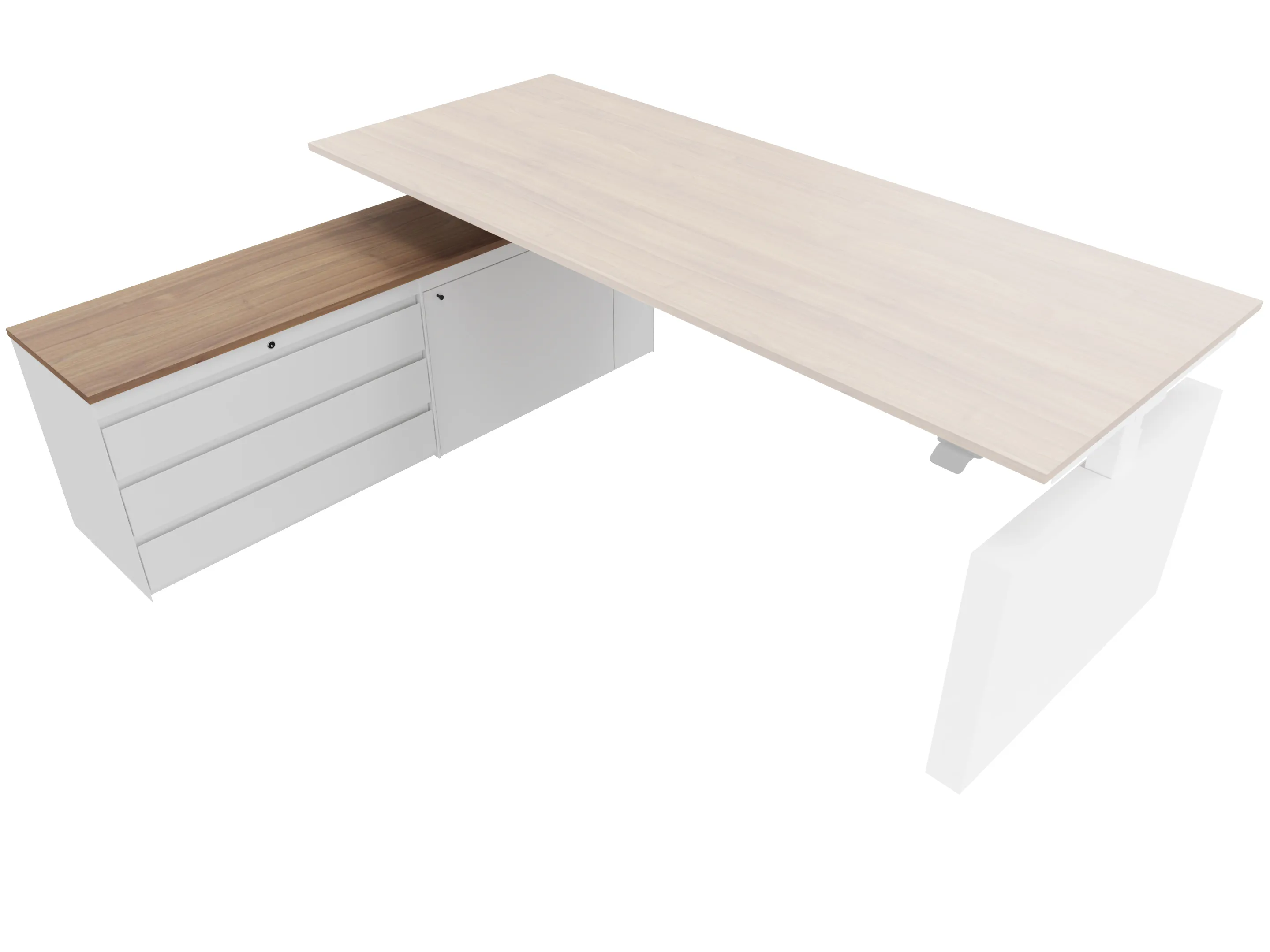 Zit-sta bureau, elektrisch verstelbaar tussen 640-1300mm, compleet met 1 werkblad van 1800 x 800mm, wangpoten en hoog-Raag bediening (gemonteerd onder blad), kast (rechts gemonteerd), met 2 lades en één draaideur.