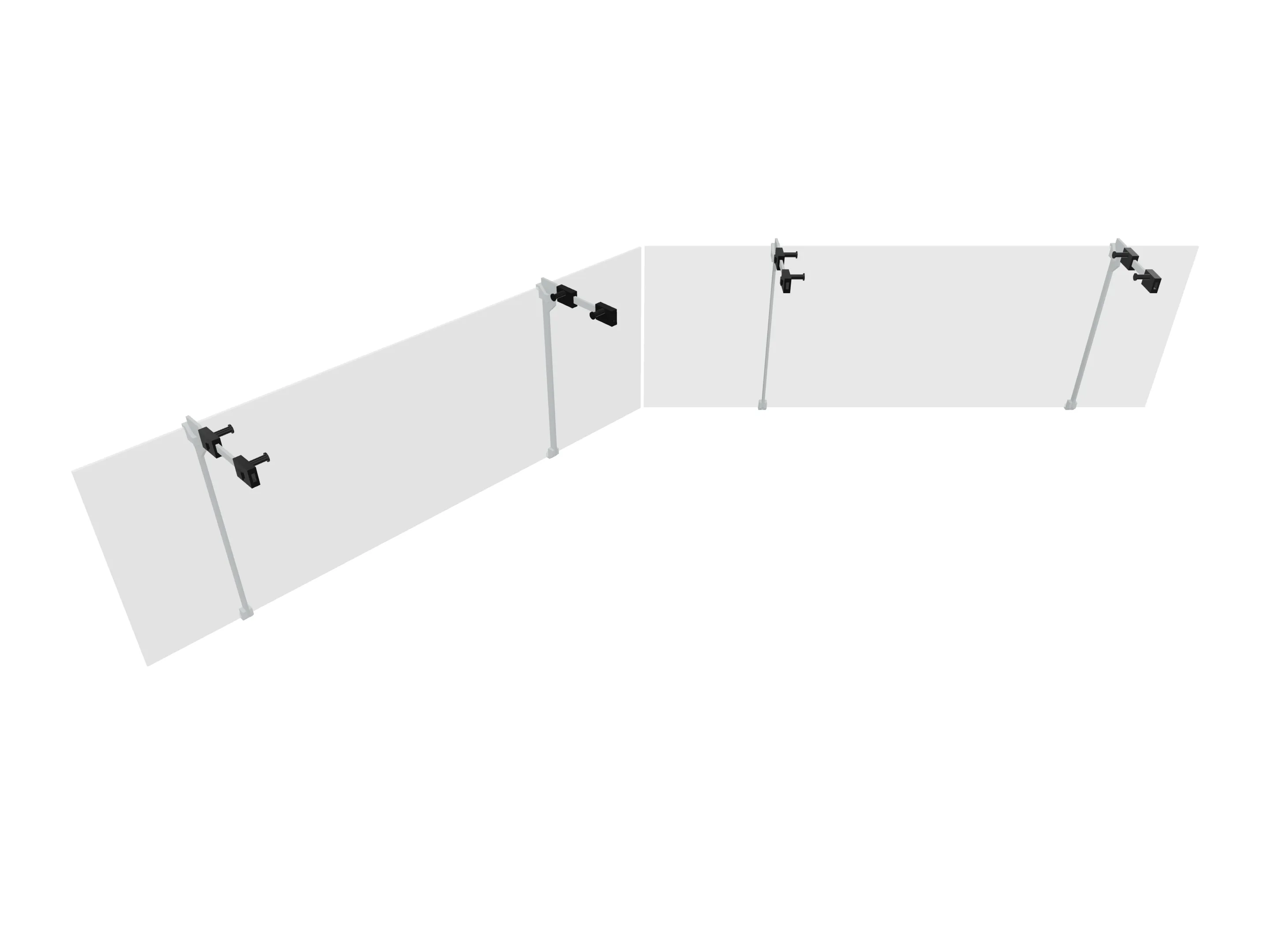 Bureau met 2 poten (vaste hoogte 720mm), waarvan beide 800mm diep. Bureaublad is in een hoek van 120° geplaatst. Buitenmaat is links en rechts 1200mm. Incl. steunpoot op de hoek.