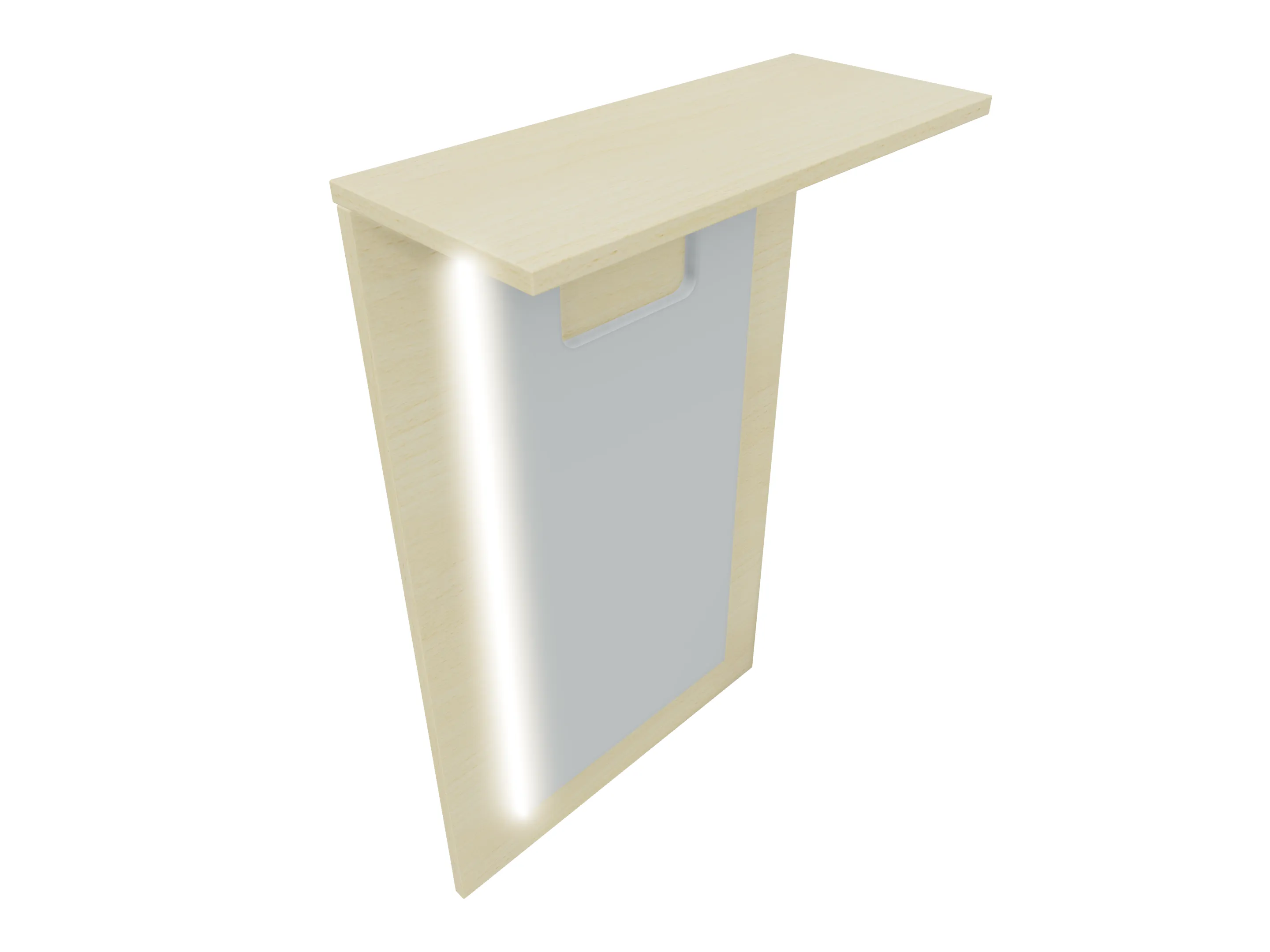 Zijpaneel met een afneembaar functiepaneel. Balie heeft links een 90º hoekverbinding (uitsluitend verbinding met frontpanelen), is rechts gesloten en de bruikbare breedte is 1600mm.Afmeting: 1678 x 1150 x 165mm (BxHxD)
