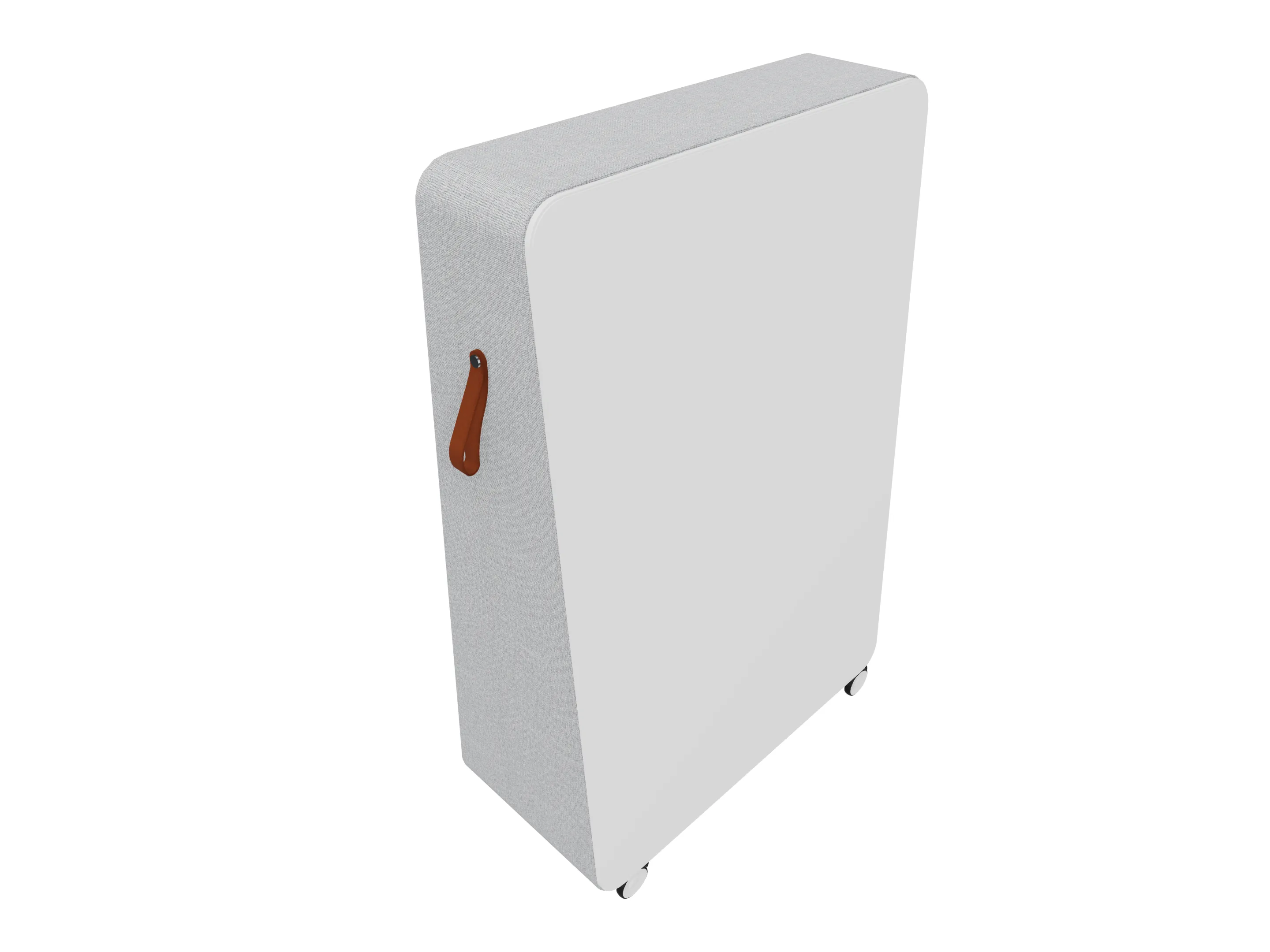 Verrijdbare akoestische ruimteverdeler, voor zien van wielen. Uitgevoerd als "standaard akoestisch". Afmeting: 900 x 450 x 1430mm (BxDxH).